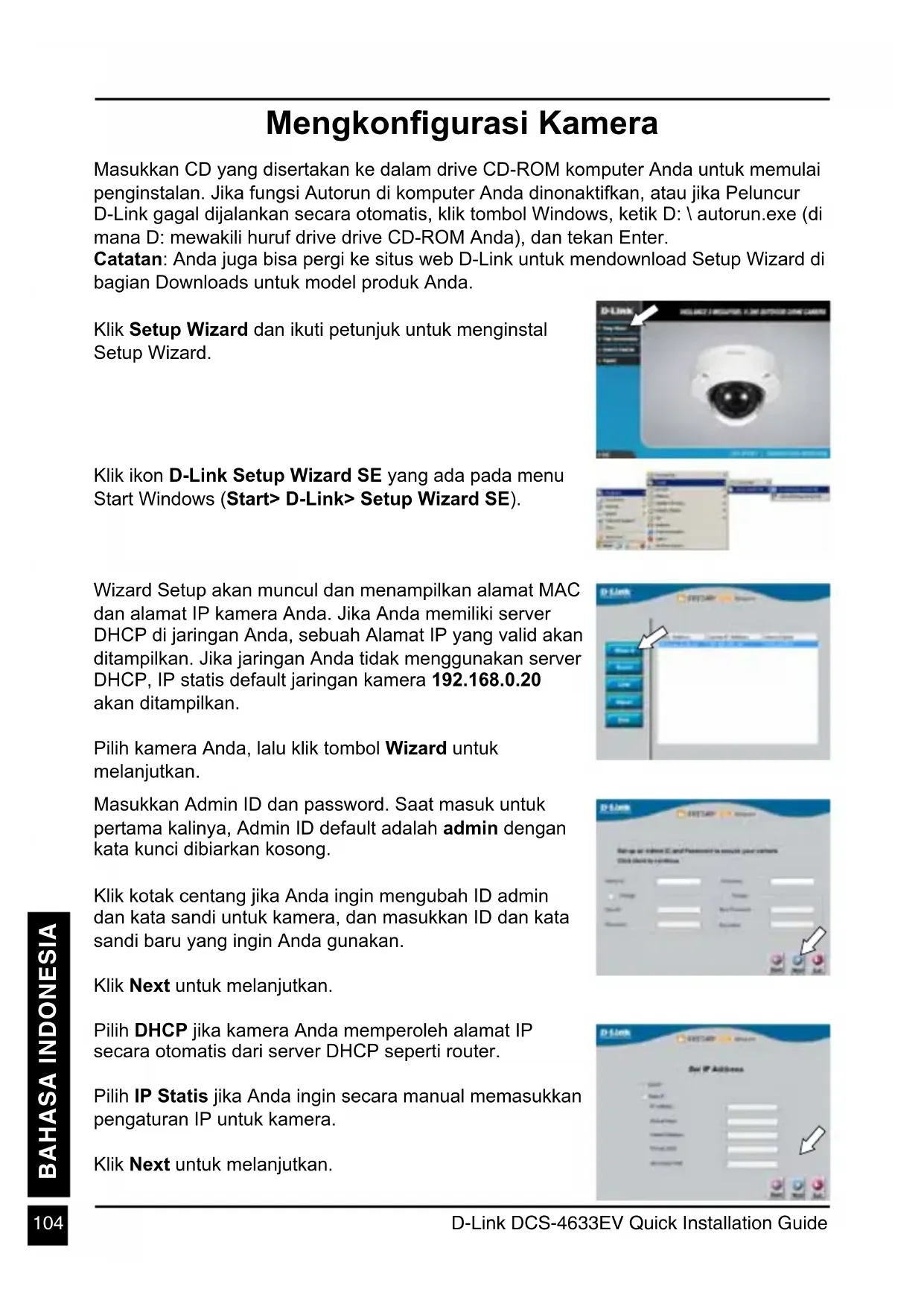BAHASA INDONESIA Mengkongurasi Kamera Masukkan CD yang disertakan ke dalam drive CD-ROM komputer Anda untuk memulai penginstalan. Jika fungsi Autorun di komputer Anda dinonaktifkan, atau jika Peluncur D-Link gagal dijalankan secara otomatis, klik tombol Windows, ketik D: \ autorun.exe (di mana D: mewakili huruf drive drive CD-ROM Anda), dan tekan Enter. Catatan: Anda juga bisa pergi ke situs web D-Link untuk mendownload Setup Wizard di bagian Downloads untuk model produk Anda. Klik ikon D-Link Setup Wizard SE yang ada pada menu Start Windows (Start> D-Link> Setup Wizard SE). Wizard Setup akan muncul dan menampilkan alamat MAC dan alamat IP kamera Anda. Jika Anda memiliki server DHCP di jaringan Anda, sebuah Alamat IP yang valid akan ditampilkan. Jika jaringan Anda tidak menggunakan server DHCP, IP statis default jaringan kamera 192.168.0.20 akan ditampilkan. Pilih kamera Anda, lalu klik tombol Wizard untuk melanjutkan. Klik Setup Wizard dan ikuti petunjuk untuk menginstal Setup Wizard. Masukkan Admin ID dan password. Saat masuk untuk pertama kalinya, Admin ID default adalah admin dengan kata kunci dibiarkan kosong. Klik kotak centang jika Anda ingin mengubah ID admin dan kata sandi untuk kamera, dan masukkan ID dan kata sandi baru yang ingin Anda gunakan. Klik Next untuk melanjutkan. Pilih DHCP jika kamera Anda memperoleh alamat IP secara otomatis dari server DHCP seperti router. Pilih IP Statis jika Anda ingin secara manual memasukkan pengaturan IP untuk kamera. Klik Next untuk melanjutkan.D-Link DCS-4633EV Quick Installation Guide