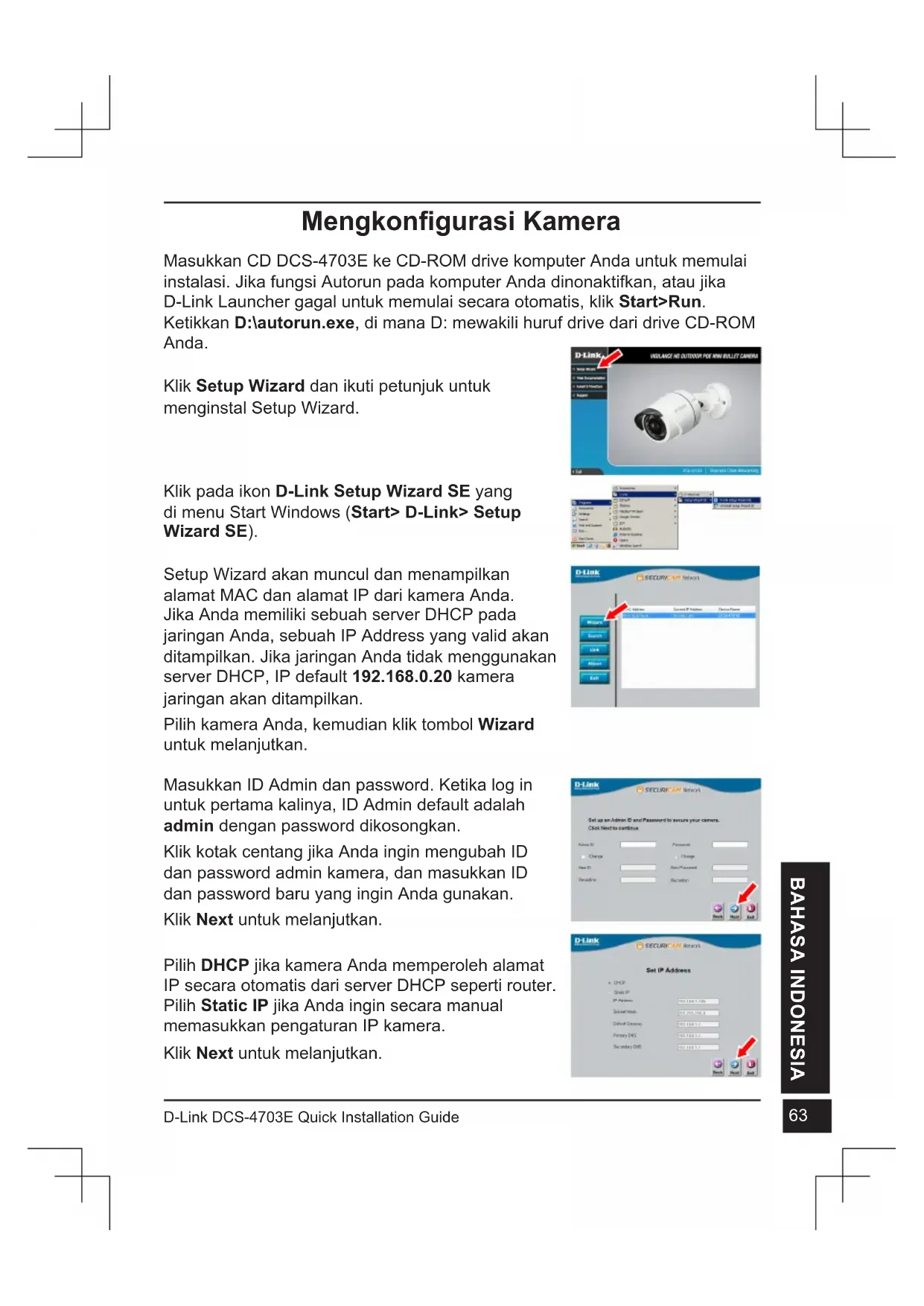 D-Link DCS-4703E Quick Installation Guide BAHASA INDONESIA Mengkongurasi Kamera Masukkan CD DCS-4703E ke CD-ROM drive komputer Anda untuk memulai instalasi. Jika fungsi Autorun pada komputer Anda dinonaktifkan, atau jika D-Link Launcher gagal untuk memulai secara otomatis, klik Start>Run. Ketikkan D:\autorun.exe, di mana D: mewakili huruf drive dari drive CD-ROM Anda. Klik pada ikon D-Link Setup Wizard SE yang di menu Start Windows (Start> D-Link> Setup Wizard SE). Setup Wizard akan muncul dan menampilkan alamat MAC dan alamat IP dari kamera Anda. Jika Anda memiliki sebuah server DHCP pada jaringan Anda, sebuah IP Address yang valid akan ditampilkan. Jika jaringan Anda tidak menggunakan server DHCP, IP default 192.168.0.20 kamera jaringan akan ditampilkan. Pilih kamera Anda, kemudian klik tombol Wizard untuk melanjutkan. Klik Setup Wizard dan ikuti petunjuk untuk menginstal Setup Wizard. Masukkan ID Admin dan password. Ketika log in untuk pertama kalinya, ID Admin default adalah admin dengan password dikosongkan. Klik kotak centang jika Anda ingin mengubah ID dan password admin kamera, dan masukkan ID dan password baru yang ingin Anda gunakan. Klik Next untuk melanjutkan. Pilih DHCP jika kamera Anda memperoleh alamat IP secara otomatis dari server DHCP seperti router. Pilih Static IP jika Anda ingin secara manual memasukkan pengaturan IP kamera. Klik Next untuk melanjutkan.64