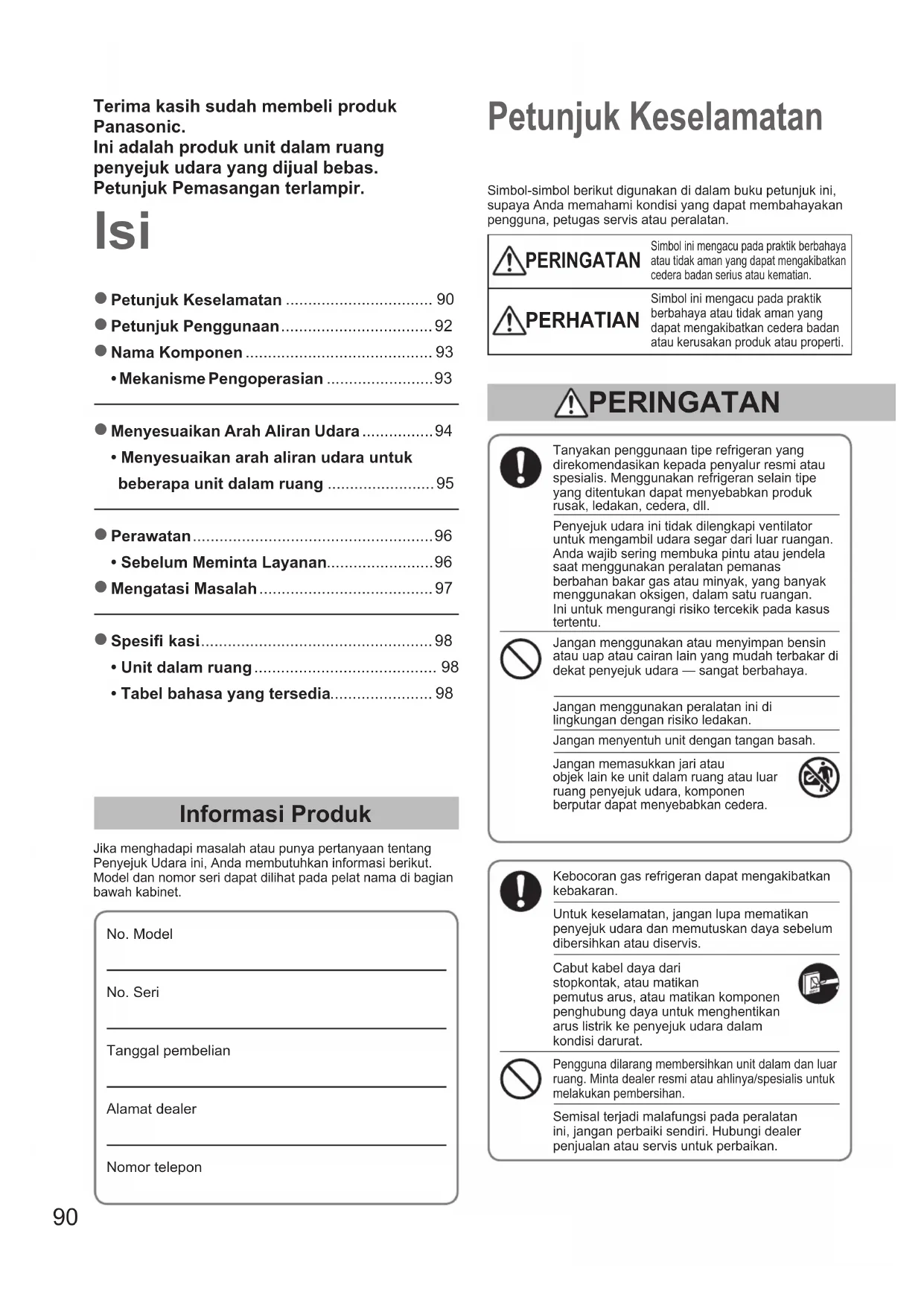 - • Tabel bahasa yang tersedia Isi Petunjuk Keselamatan Informasi Produk Jika menghadapi masalah atau punya pertanyaan tentang Penyejuk Udara ini, Anda membutuhkan informasi berikut. Model dan nomor seri dapat dilihat pada pelat nama di bagian bawah kabinet.No. ModelNo. SeriTanggal pembelianAlamat dealerNomor teleponTanyakan penggunaan tipe refrigeran yang direkomendasikan kepada penyalur resmi atau spesialis. Menggunakan refrigeran selain tipe yang ditentukan dapat menyebabkan produk rusak, ledakan, cedera, dll.Penyejuk udara ini tidak dilengkapi ventilator untuk mengambil udara segar dari luar ruangan. Anda wajib sering membuka pintu atau jendela saat menggunakan peralatan pemanas berbahan bakar gas atau minyak, yang banyak menggunakan oksigen, dalam satu ruangan. Ini untuk mengurangi risiko tercekik pada kasus tertentu.Jangan menggunakan atau menyimpan bensin atau uap atau cairan lain yang mudah terbakar di dekat penyejuk udara — sangat berbahaya.Jangan menggunakan peralatan ini di lingkungan dengan risiko ledakan.Jangan menyentuh unit dengan tangan basah.Jangan memasukkan jari atau objek lain ke unit dalam ruang atau luar ruang penyejuk udara, komponen berputar dapat menyebabkan cedera.Kebocoran gas refrigeran dapat mengakibatkan kebakaran.Untuk keselamatan, jangan lupa mematikan penyejuk udara dan memutuskan daya sebelum dibersihkan atau diservis.Cabut kabel daya dari stopkontak, atau matikan pemutus arus, atau matikan komponen penghubung daya untuk menghentikan arus listrik ke penyejuk udara dalam kondisi darurat. Pengguna dilarang membersihkan unit dalam dan luar ruang. Minta dealer resmi atau ahlinya/spesialis untuk melakukan pembersihan.Semisal terjadi malafungsi pada peralatan ini, jangan perbaiki sendiri. Hubungi dealer penjualan atau servis untuk perbaikan.Simbol-simbol berikut digunakan di dalam buku petunjuk ini, supaya Anda memahami kondisi yang dapat membahayakan pengguna, petugas servis atau peralatan. PERINGATAN Simbol ini mengacu pada praktik berbahaya atau tidak aman yang dapat mengakibatkan cedera badan serius atau kematian. PERHATIAN Simbol ini mengacu pada praktik berbahaya atau tidak aman yang dapat mengakibatkan cedera badan atau kerusakan produk atau properti. PERINGATAN Terima kasih sudah membeli produk Panasonic.Ini adalah produk unit dalam ruang penyejuk udara yang dijual bebas.Petunjuk Pemasangan terlampir. OI00284010EUall.indb90OI00284010EUall.indb90 2013/11/2914:36:332013/11/2914:36:3391 p. 98