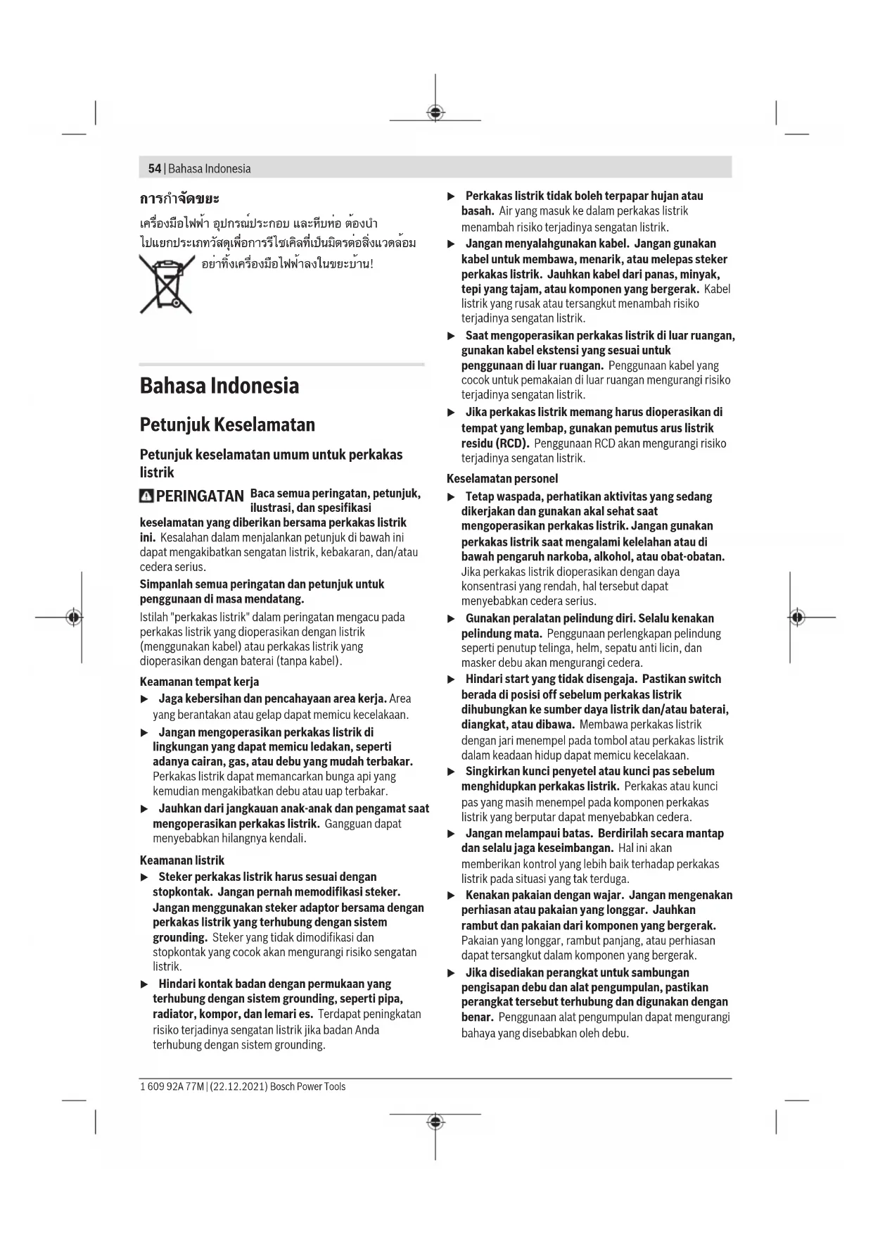 โทรศัพท์ 02 7587555 โทรสาร 02 7587525 สามารถดูที่อยู่ศูนย์บริการอื่นๆ ได้ที่: www.bosch-pt.com/serviceaddresses Bosch Power Tools 1 609 92A 77M | (22.12.2021)54 | Bahasa Indonesia การกำจัดขยะ เครื่องมือไฟฟ้า อุปกรณ์ประกอบ และหีบห่อ ต้องนำ ไปแยกประเภทวัสดุเพื่อการรีไซเคิลที่เป็นมิตรต่อสิ่งแวดล้อม อย่าทิ้งเครื่องมือไฟฟ้าลงในขยะบ้าน! Bahasa Indonesia Petunjuk Keselamatan Petunjuk keselamatan umum untuk perkakas listrik PERINGATAN Baca semua peringatan, petunjuk, ilustrasi, dan spesifikasi keselamatan yang diberikan bersama perkakas listrik ini. Kesalahan dalam menjalankan petunjuk di bawah ini dapat mengakibatkan sengatan listrik, kebakaran, dan/atau cedera serius. Simpanlah semua peringatan dan petunjuk untuk penggunaan di masa mendatang. Istilah "perkakas listrik" dalam peringatan mengacu pada perkakas listrik yang dioperasikan dengan listrik (menggunakan kabel) atau perkakas listrik yang dioperasikan dengan baterai (tanpa kabel). Keamanan tempat kerja u Jaga kebersihan dan pencahayaan area kerja. Area yang berantakan atau gelap dapat memicu kecelakaan. u Jangan mengoperasikan perkakas listrik di lingkungan yang dapat memicu ledakan, seperti adanya cairan, gas, atau debu yang mudah terbakar. Perkakas listrik dapat memancarkan bunga api yang kemudian mengakibatkan debu atau uap terbakar. u Jauhkan dari jangkauan anak-anak dan pengamat saat mengoperasikan perkakas listrik. Gangguan dapat menyebabkan hilangnya kendali. Keamanan listrik u Steker perkakas listrik harus sesuai dengan stopkontak. Jangan pernah memodifikasi steker. Jangan menggunakan steker adaptor bersama dengan perkakas listrik yang terhubung dengan sistem grounding. Steker yang tidak dimodifikasi dan stopkontak yang cocok akan mengurangi risiko sengatan listrik. u Hindari kontak badan dengan permukaan yang terhubung dengan sistem grounding, seperti pipa, radiator, kompor, dan lemari es. Terdapat peningkatan risiko terjadinya sengatan listrik jika badan Anda terhubung dengan sistem grounding. u Perkakas listrik tidak boleh terpapar hujan atau basah. Air yang masuk ke dalam perkakas listrik menambah risiko terjadinya sengatan listrik. u Jangan menyalahgunakan kabel. Jangan gunakan kabel untuk membawa, menarik, atau melepas steker perkakas listrik. Jauhkan kabel dari panas, minyak, tepi yang tajam, atau komponen yang bergerak. Kabel listrik yang rusak atau tersangkut menambah risiko terjadinya sengatan listrik. u Saat mengoperasikan perkakas listrik di luar ruangan, gunakan kabel ekstensi yang sesuai untuk penggunaan di luar ruangan. Penggunaan kabel yang cocok untuk pemakaian di luar ruangan mengurangi risiko terjadinya sengatan listrik. u Jika perkakas listrik memang harus dioperasikan di tempat yang lembap, gunakan pemutus arus listrik residu (RCD). Penggunaan RCD akan mengurangi risiko terjadinya sengatan listrik. Keselamatan personel u Tetap waspada, perhatikan aktivitas yang sedang dikerjakan dan gunakan akal sehat saat mengoperasikan perkakas listrik. Jangan gunakan perkakas listrik saat mengalami kelelahan atau di bawah pengaruh narkoba, alkohol, atau obat-obatan. Jika perkakas listrik dioperasikan dengan daya konsentrasi yang rendah, hal tersebut dapat menyebabkan cedera serius. u Gunakan peralatan pelindung diri. Selalu kenakan pelindung mata. Penggunaan perlengkapan pelindung seperti penutup telinga, helm, sepatu anti licin, dan masker debu akan mengurangi cedera. u Hindari start yang tidak disengaja. Pastikan switch berada di posisi off sebelum perkakas listrik dihubungkan ke sumber daya listrik dan/atau baterai, diangkat, atau dibawa. Membawa perkakas listrik dengan jari menempel pada tombol atau perkakas listrik dalam keadaan hidup dapat memicu kecelakaan. u Singkirkan kunci penyetel atau kunci pas sebelum menghidupkan perkakas listrik. Perkakas atau kunci pas yang masih menempel pada komponen perkakas listrik yang berputar dapat menyebabkan cedera. u Jangan melampaui batas. Berdirilah secara mantap dan selalu jaga keseimbangan. Hal ini akan memberikan kontrol yang lebih baik terhadap perkakas listrik pada situasi yang tak terduga. u Kenakan pakaian dengan wajar. Jangan mengenakan perhiasan atau pakaian yang longgar. Jauhkan rambut dan pakaian dari komponen yang bergerak. Pakaian yang longgar, rambut panjang, atau perhiasan dapat tersangkut dalam komponen yang bergerak. u Jika disediakan perangkat untuk sambungan pengisapan debu dan alat pengumpulan, pastikan perangkat tersebut terhubung dan digunakan dengan benar. Penggunaan alat pengumpulan dapat mengurangi bahaya yang disebabkan oleh debu. 1 609 92A 77M | (22.12.2021) Bosch Power ToolsBahasa Indonesia | 55 u Jangan berpuas diri dan mengabaikan prinsip keselamatan karena terbiasa mengoperasikan perkakas. Tindakan yang kurang hati-hati dapat mengakibatkan cedera serius dalam waktu sepersekian detik. Penggunaan dan pemeliharaan perkakas listrik u Jangan memaksakan perkakas listrik. Gunakan perkakas listrik yang sesuai untuk pekerjaan yang dilakukan. Perkakas listrik yang sesuai akan bekerja dengan lebih baik dan aman sesuai tujuan penggunaan. u Jangan gunakan perkakas listrik dengan switch yang tidak dapat dioperasikan. Perkakas listrik yang switchnya yang tidak berfungsi dapat menimbulkan bahaya dan harus diperbaiki. u Lepaskan steker dari sumber listrik dan/atau lepas baterai, jika dapat dilepaskan dari perkakas listrik sebelum menyetel, mengganti aksesori, atau menyimpan perkakas listrik. Tindakan preventif akan mengurangi risiko menghidupkan perkakas listrik secara tidak disengaja. u Jauhkan dan simpan perkakas listrik dari jangkauan anak-anak dan jangan biarkan orang-orang yan