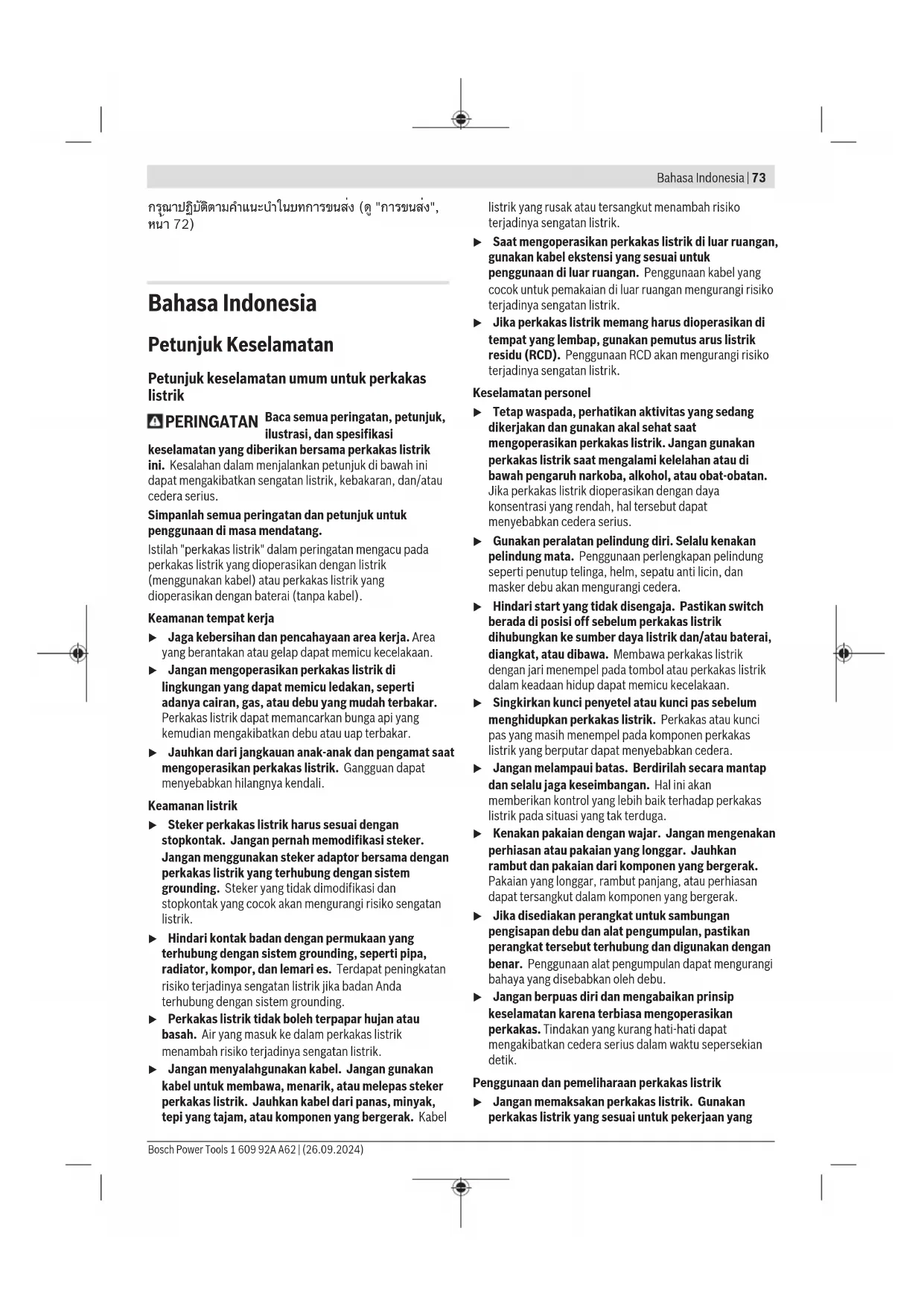 แบตเตอรี่แพ็ค/แบตเตอรี่: ลิเธียม ไอออน: 1 609 92A A62 | (26.09.2024) Bosch Power ToolsBahasa Indonesia | 73 กรุณาปฏิบัติตามคำแนะนำในบทการขนส่ง (ดู "การขนส่ง", หน้า72) Bahasa Indonesia Petunjuk Keselamatan Petunjuk keselamatan umum untuk perkakas listrik PERINGATAN Baca semua peringatan, petunjuk, ilustrasi, dan spesifikasi keselamatan yang diberikan bersama perkakas listrik ini. Kesalahan dalam menjalankan petunjuk di bawah ini dapat mengakibatkan sengatan listrik, kebakaran, dan/atau cedera serius. Simpanlah semua peringatan dan petunjuk untuk penggunaan di masa mendatang. Istilah "perkakas listrik" dalam peringatan mengacu pada perkakas listrik yang dioperasikan dengan listrik (menggunakan kabel) atau perkakas listrik yang dioperasikan dengan baterai (tanpa kabel). Keamanan tempat kerja u Jaga kebersihan dan pencahayaan area kerja. Area yang berantakan atau gelap dapat memicu kecelakaan. u Jangan mengoperasikan perkakas listrik di lingkungan yang dapat memicu ledakan, seperti adanya cairan, gas, atau debu yang mudah terbakar. Perkakas listrik dapat memancarkan bunga api yang kemudian mengakibatkan debu atau uap terbakar. u Jauhkan dari jangkauan anak-anak dan pengamat saat mengoperasikan perkakas listrik. Gangguan dapat menyebabkan hilangnya kendali. Keamanan listrik u Steker perkakas listrik harus sesuai dengan stopkontak. Jangan pernah memodifikasi steker. Jangan menggunakan steker adaptor bersama dengan perkakas listrik yang terhubung dengan sistem grounding. Steker yang tidak dimodifikasi dan stopkontak yang cocok akan mengurangi risiko sengatan listrik. u Hindari kontak badan dengan permukaan yang terhubung dengan sistem grounding, seperti pipa, radiator, kompor, dan lemari es. Terdapat peningkatan risiko terjadinya sengatan listrik jika badan Anda terhubung dengan sistem grounding. u Perkakas listrik tidak boleh terpapar hujan atau basah. Air yang masuk ke dalam perkakas listrik menambah risiko terjadinya sengatan listrik. u Jangan menyalahgunakan kabel. Jangan gunakan kabel untuk membawa, menarik, atau melepas steker perkakas listrik. Jauhkan kabel dari panas, minyak, tepi yang tajam, atau komponen yang bergerak. Kabel listrik yang rusak atau tersangkut menambah risiko terjadinya sengatan listrik. u Saat mengoperasikan perkakas listrik di luar ruangan, gunakan kabel ekstensi yang sesuai untuk penggunaan di luar ruangan. Penggunaan kabel yang cocok untuk pemakaian di luar ruangan mengurangi risiko terjadinya sengatan listrik. u Jika perkakas listrik memang harus dioperasikan di tempat yang lembap, gunakan pemutus arus listrik residu (RCD). Penggunaan RCD akan mengurangi risiko terjadinya sengatan listrik. Keselamatan personel u Tetap waspada, perhatikan aktivitas yang sedang dikerjakan dan gunakan akal sehat saat mengoperasikan perkakas listrik. Jangan gunakan perkakas listrik saat mengalami kelelahan atau di bawah pengaruh narkoba, alkohol, atau obat-obatan. Jika perkakas listrik dioperasikan dengan daya konsentrasi yang rendah, hal tersebut dapat menyebabkan cedera serius. u Gunakan peralatan pelindung diri. Selalu kenakan pelindung mata. Penggunaan perlengkapan pelindung seperti penutup telinga, helm, sepatu anti licin, dan masker debu akan mengurangi cedera. u Hindari start yang tidak disengaja. Pastikan switch berada di posisi off sebelum perkakas listrik dihubungkan ke sumber daya listrik dan/atau baterai, diangkat, atau dibawa. Membawa perkakas listrik dengan jari menempel pada tombol atau perkakas listrik dalam keadaan hidup dapat memicu kecelakaan. u Singkirkan kunci penyetel atau kunci pas sebelum menghidupkan perkakas listrik. Perkakas atau kunci pas yang masih menempel pada komponen perkakas listrik yang berputar dapat menyebabkan cedera. u Jangan melampaui batas. Berdirilah secara mantap dan selalu jaga keseimbangan. Hal ini akan memberikan kontrol yang lebih baik terhadap perkakas listrik pada situasi yang tak terduga. u Kenakan pakaian dengan wajar. Jangan mengenakan perhiasan atau pakaian yang longgar. Jauhkan rambut dan pakaian dari komponen yang bergerak. Pakaian yang longgar, rambut panjang, atau perhiasan dapat tersangkut dalam komponen yang bergerak. u Jika disediakan perangkat untuk sambungan pengisapan debu dan alat pengumpulan, pastikan perangkat tersebut terhubung dan digunakan dengan benar. Penggunaan alat pengumpulan dapat mengurangi bahaya yang disebabkan oleh debu. u Jangan berpuas diri dan mengabaikan prinsip keselamatan karena terbiasa mengoperasikan perkakas. Tindakan yang kurang hati-hati dapat mengakibatkan cedera serius dalam waktu sepersekian detik. Penggunaan dan pemeliharaan perkakas listrik u Jangan memaksakan perkakas listrik. Gunakan perkakas listrik yang sesuai untuk pekerjaan yang Bosch Power Tools 1 609 92A A62 | (26.09.2024)74 | Bahasa Indonesia dilakukan. Perkakas listrik yang sesuai akan bekerja dengan lebih baik dan aman sesuai tujuan penggunaan. u Jangan gunakan perkakas listrik dengan switch yang tidak dapat dioperasikan. Perkakas listrik yang switchnya yang tidak berfungsi dapat menimbulkan bahaya dan harus diperbaiki. u Lepaskan steker dari sumber listrik dan/atau lepas baterai, jika dapat dilepaskan dari perkakas listrik sebelum menyetel, mengganti aksesori, atau menyimpan perkakas listrik. Tindakan preventif akan mengurangi risiko menghidupkan perkakas listrik secara tidak disengaja. u Jauhkan dan simpan perkakas listrik dari jangkauan anak-anak dan jangan biarkan orang-orang yang tidak mengetahui cara menggunakan perkakas listrik, mengoperasikan perkakas listrik. Perkakas listrik dapat membahayakan jika digunakan oleh orang-orang yang tidak terlatih. u Lakukan pemeliharaan perkakas listrik dan aksesori. Periksa komponen yang bergerak apabila tidak lurus atau terikat, kerusakan komponen, dan kondisi lain yang dapat mengganggu pengoperasian perkakas listrik. Apabila 