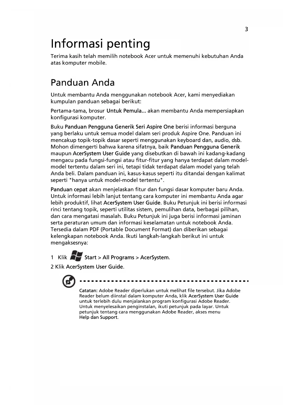 6Seri Aspire One Panduan cepatNomor model: _____________________________________ Nomor seri: _______________________________________ Tanggal pembelian: ________________________________ Alamat pembelian: ________________________________ © 2010 Hak Cipta Dilindungi Undang-Undang. Panduan Cepat Seri Aspire One Edisi Pertama: 11/2010 PC Notebook Seri Aspire One3 Informasi penting Terima kasih telah memilih notebook Acer untuk memenuhi kebutuhan Anda atas komputer mobile. Panduan Anda Untuk membantu Anda menggunakan notebook Acer, kami menyediakan kumpulan panduan sebagai berikut: Pertama-tama, brosur Untuk Pemula... akan membantu Anda mempersiapkan konfigurasi komputer. Buku Panduan Pengguna Generik Seri Aspire One berisi informasi berguna yang berlaku untuk semua model dalam seri produk Aspire One. Panduan ini mencakup topik-topik dasar seperti menggunakan keyboard dan, audio, dsb. Mohon dimengerti bahwa karena sifatnya, baik Panduan Pengguna Generik maupun AcerSystem User Guide yang disebutkan di bawah ini kadang-kadang mengacu pada fungsi-fungsi atau fitur-fitur yang hanya terdapat dalam model- model tertentu dalam seri ini, tetapi tidak terdapat dalam model yang telah Anda beli. Dalam panduan ini, kasus-kasus seperti itu ditandai dengan kalimat seperti "hanya untuk model-model tertentu". Panduan cepat akan menjelaskan fitur dan fungsi dasar komputer baru Anda. Untuk informasi lebih lanjut tentang cara komputer ini membantu Anda agar lebih produktif, lihat AcerSystem User Guide. Buku Petunjuk ini berisi informasi rinci tentang topik, seperti utilitas sistem, pemulihan data, berbagai pilihan, dan cara mengatasi masalah. Buku Petunjuk ini juga berisi informasi jaminan serta peraturan umum dan informasi keselamatan untuk notebook Anda. Tersedia dalam PDF (Portable Document Format) dan diberikan sebagai kelengkapan notebook Anda. Ikuti langkah-langkah berikut ini untuk mengaksesnya: 1 Klik Start > All Programs > AcerSystem. 2 Klik AcerSystem User Guide. Catatan: Adobe Reader diperlukan untuk melihat file tersebut. Jika Adobe Reader belum diinstal dalam komputer Anda, klik AcerSystem User Guide untuk terlebih dulu menjalankan program konfigurasi Adobe Reader. Untuk menyelesaikan penginstalan, ikuti petunjuk pada layar. Untuk petunjuk tentang cara menggunakan Adobe Reader, akses menu Help dan Support.4 Bahasa Indonesia Tur Acer notebook Anda Setelah mempersiapkan komputer seperti pada gambar dalam brosur kami akan menunjukkan bagian-bagian notebook Acer baru Anda. Pandangan atas # Ikon Item Keterangan1 Mikrofon Mikrofon internal untuk perekaman suara.2 Layar tampilan Disebut juga sebagai LCD (Liquid-Crystal Display), akan menampilkan output komputer (konfigurasi mungkin berbeda tergantung model).3 Tombol daya Menghidupkan/mematikan komputer.