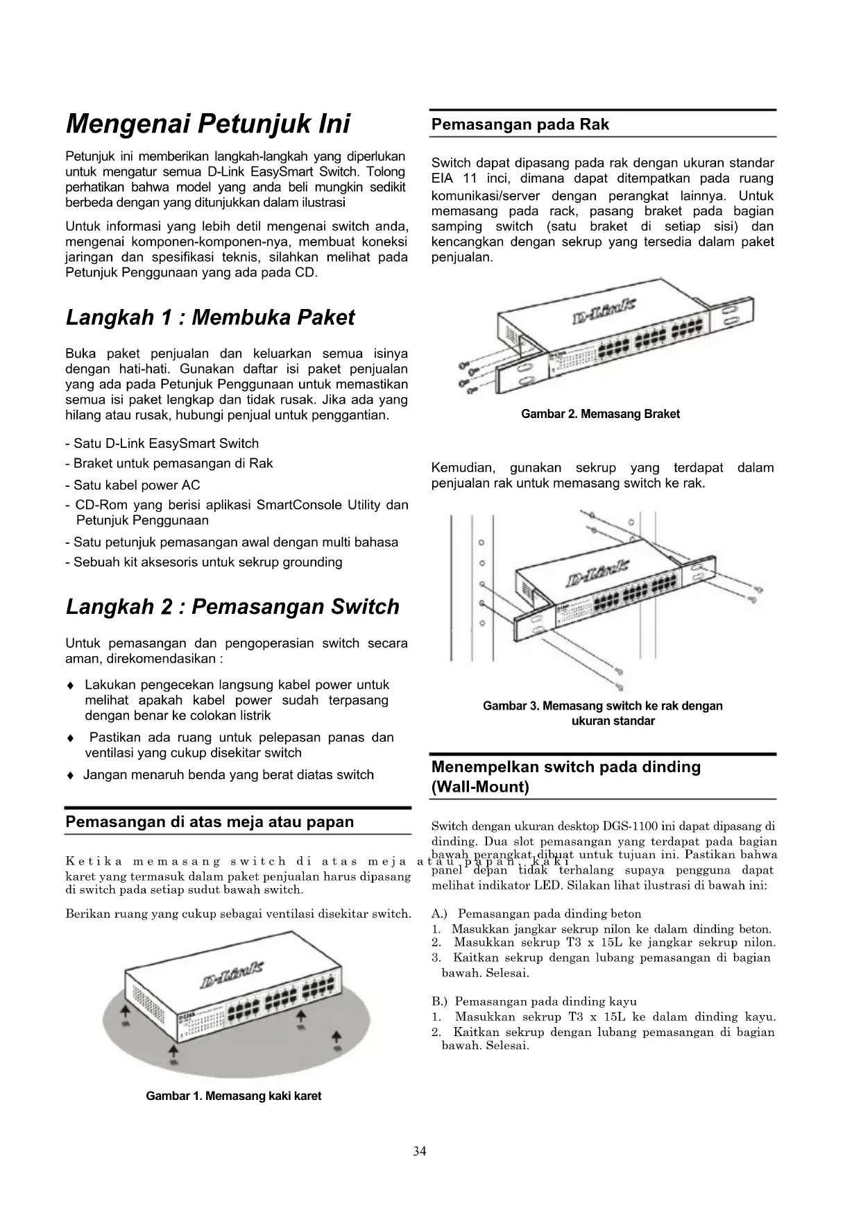 segmento de rede L2 do seu PC e utilizar o SmartConsole Utility para identificar os EasySmart Switches. Para uma análise detalhada das funções do SmartConsole, favor consultar a introdução ao SmartConsole Utility no Manual do Usuário.3334 Mengenai Petunjuk Ini Petunjuk ini memberikan langkah-langkah yang diperlukan untuk mengatur semua D-Link EasySmart Switch. Tolong perhatikan bahwa model yang anda beli mungkin sedikit berbeda dengan yang ditunjukkan dalam ilustrasi Untuk informasi yang lebih detil mengenai switch anda, mengenai komponen-komponen-nya, membuat koneksi jaringan dan spesifikasi teknis, silahkan melihat pada Petunjuk Penggunaan yang ada pada CD. Langkah 1 : Membuka Paket Buka paket penjualan dan keluarkan semua isinya dengan hati-hati. Gunakan daftar isi paket penjualan yang ada pada Petunjuk Penggunaan untuk memastikan semua isi paket lengkap dan tidak rusak. Jika ada yang hilang atau rusak, hubungi penjual untuk penggantian. - Satu D-Link EasySmart Switch - Braket untuk pemasangan di Rak - Satu kabel power AC - CD-Rom yang berisi aplikasi SmartConsole Utility dan Petunjuk Penggunaan - Satu petunjuk pemasangan awal dengan multi bahasa - Sebuah kit aksesoris untuk sekrup grounding Langkah 2 : Pemasangan Switch Untuk pemasangan dan pengoperasian switch secara aman, direkomendasikan : ♦ Lakukan pengecekan langsung kabel power untuk melihat apakah kabel power sudah terpasang dengan benar ke colokan listrik ♦ Pastikan ada ruang untuk pelepasan panas dan ventilasi yang cukup disekitar switch ♦ Jangan menaruh benda yang berat diatas switch Pemasangan di atas meja atau papan Ketika memasang switch di atas meja atau papan, kaki karet yang termasuk dalam paket penjualan harus dipasang di switch pada setiap sudut bawah switch. Berikan ruang yang cukup sebagai ventilasi disekitar switch.