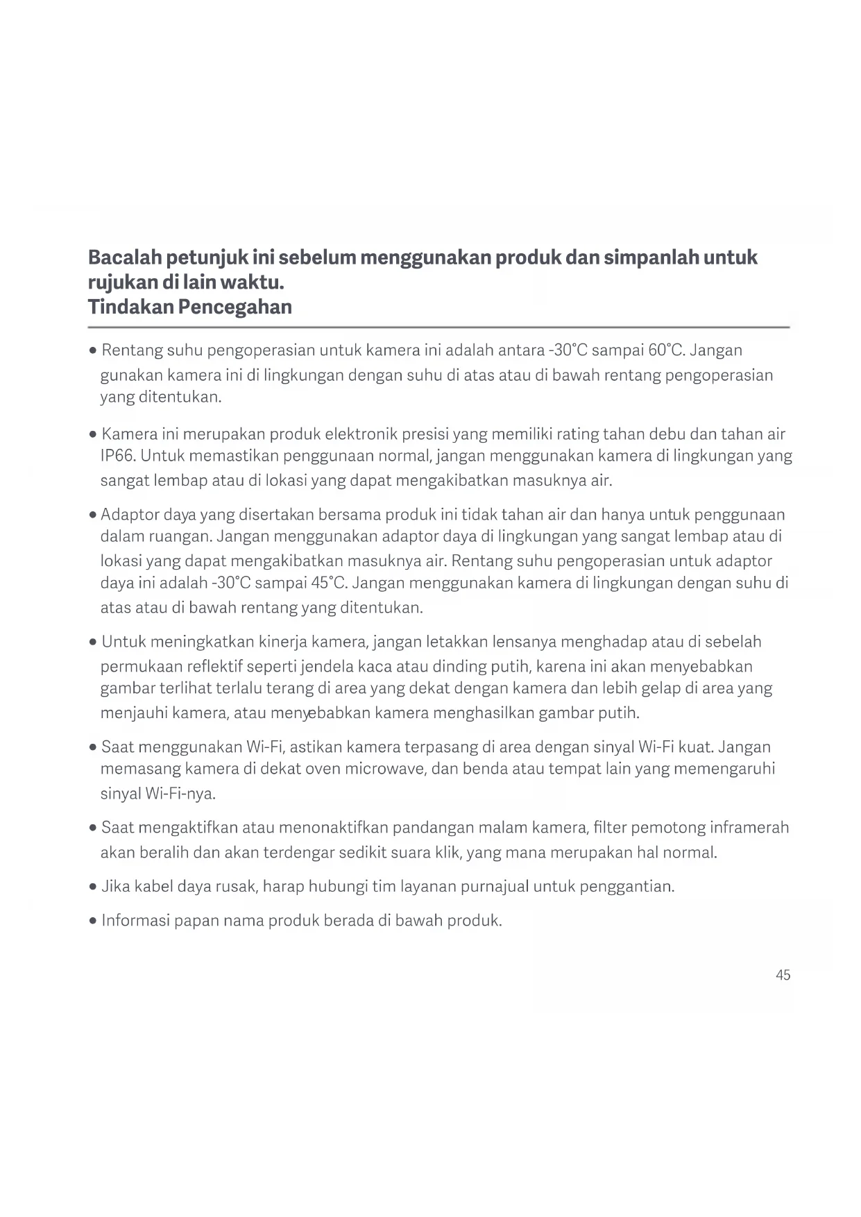 Catatan : Ilustrasi produk, aksesori, dan antarmuka pengguna dalam panduan pengguna ini hanya untuk tujuan referensi. Produk dan fungsi sebenarnya dapat bervariasi karena peningkatan produk. Model, parameter, dan informasi keselamatan kamera ditampilkan di panduan pengguna dan di bawah kamera.47 Catatan: Setelah memasang atau melepaskan kartu microSD, pastikan untuk memasang kembali penutup tahan air di atas slot kartu untuk mencegah air meresap masuk ke dalam kamera dan memengaruhi penggunaan normal. Menghidupkan Colokkan kabel adaptor daya ke port daya pada kamera, dan kamera akan menyala secara otomatis. (Gb. C-2) Jika indikator tetap berwarna oranye dan notifikasi suara terdengar, kamera berhasil dinyalakan. Catatan: Harap pastikan untuk menggunakan kabel adaptor daya asli yang disediakan untuk mengisi daya kamera guna menghindari kamera tidak bekerja dengan baik. Jika kamera berfungsi, jangan putar lensa kamera atau memutarnya secara paksa. Jika pemosisian lensa tidak akurat, kalibrasikan di aplikasi Xiaomi Home. Status Indikator Oranye: Menunggu koneksi/Reset berhasil Berkedip oranye: Menghubungkan ke jaringan… Berkedip biru: Menghubungkan ke server/Pembaruan OTA sedang berlangsung… Biru: Berhasil terhubung/Berfungsi normal Menghubungkan dengan Aplikasi Xiaomi Home Produk ini dapat digunakan dengan aplikasi Xiaomi Home. Gunakan aplikasi Xiaomi Home untuk mengontrol perangkat Anda, dan untuk berinteraksi dengan perangkat rumah pintar lainny