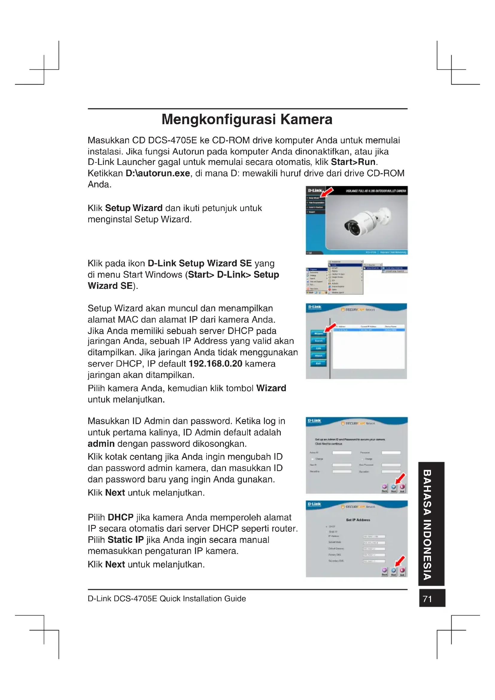 D-Link DCS-4705E Quick Installation Guide BAHASA INDONESIA Mengkonfigurasi Kamera Masukkan CD DCS-4705E ke CD-ROM drive komputer Anda untuk memulai instalasi. Jika fungsi Autorun pada komputer Anda dinonaktifkan, atau jika D-Link Launcher gagal untuk memulai secara otomatis, klik Start>Run. Ketikkan D:\autorun.exe, di mana D: mewakili huruf drive dari drive CD-ROM Anda. Klik pada ikon D-Link Setup Wizard SE yang di menu Start Windows (Start> D-Link> Setup Wizard SE). Setup Wizard akan muncul dan menampilkan alamat MAC dan alamat IP dari kamera Anda. Jika Anda memiliki sebuah server DHCP pada jaringan Anda, sebuah IP Address yang valid akan ditampilkan. Jika jaringan Anda tidak menggunakan server DHCP, IP default 192.168.0.20 kamera jaringan akan ditampilkan. Pilih kamera Anda, kemudian klik tombol Wizard untuk melanjutkan. Klik Setup Wizard dan ikuti petunjuk untuk menginstal Setup Wizard. Masukkan ID Admin dan password. Ketika log in untuk pertama kalinya, ID Admin default adalah admin dengan password dikosongkan. Klik kotak centang jika Anda ingin mengubah ID dan password admin kamera, dan masukkan ID dan password baru yang ingin Anda gunakan. Klik Next untuk melanjutkan. Pilih DHCP jika kamera Anda memperoleh alamat IP secara otomatis dari server DHCP seperti router. Pilih Static IP jika Anda ingin secara manual memasukkan pengaturan IP kamera. Klik Next untuk melanjutkan.72