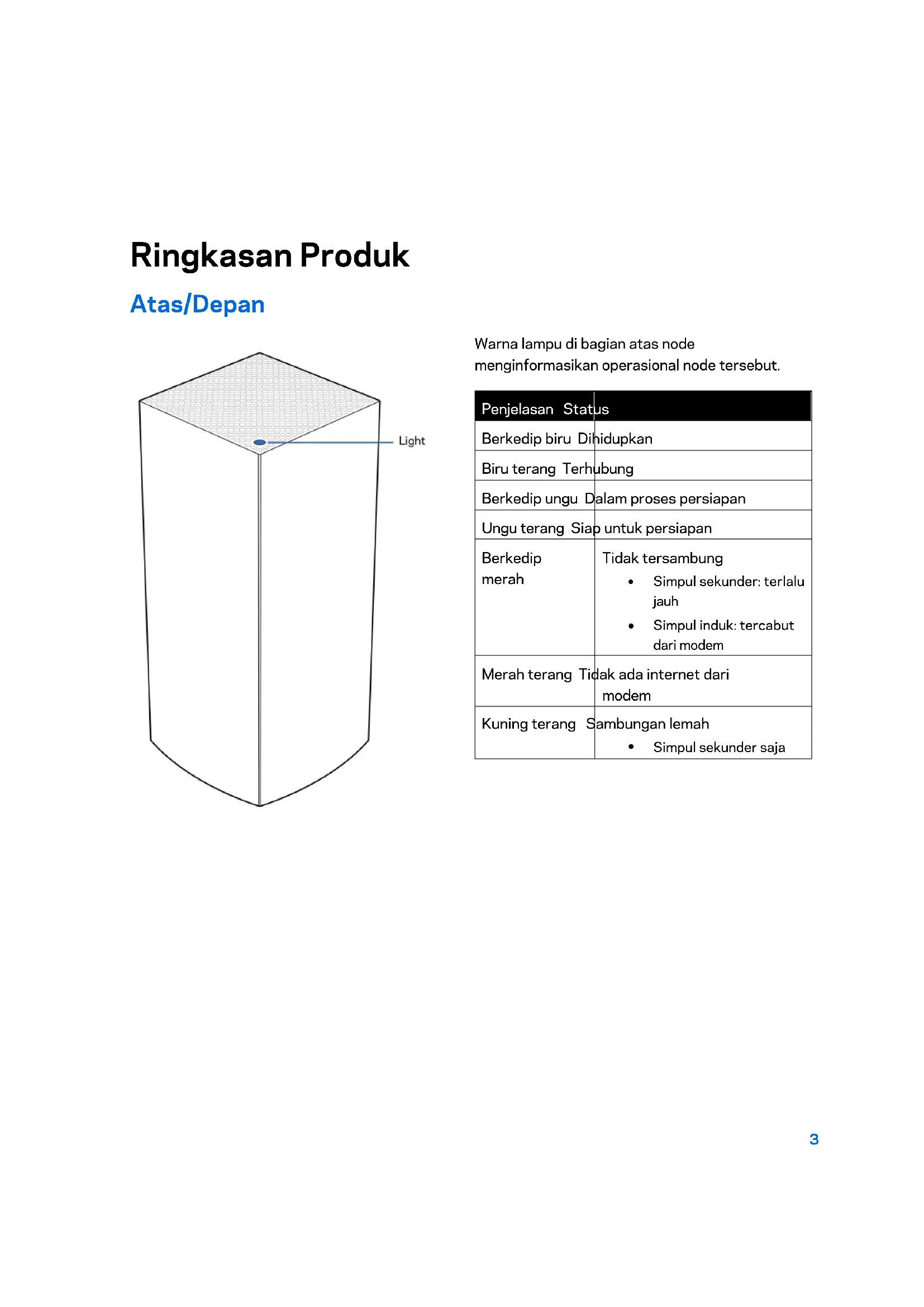 Dengan simpul tersambung ke daya dan dihidupkan, tekan terus tombol Reset pada bagian bawah. Lampu di bagian atas simpul akan berubah menjadi merah, dan pudar secara berdenyut. Jangan lepaskan tombol hingga lampu mati lalu kemudian berubah menjadi merah terang.33 Spesifikasi Linksys Velop Nama Model Nomor Model Kecepatan Peralihan Port Frekuensi Radio Jumlah Antena Port Tombol Lampu Fitur Keamanan Bit Kunci Keamanan Lingkungan Dimensi Velop (Tri-Band) MX5300 10/100 Mbps 2,4 GHz dan 5 GHz 13 (internal) USB 3.0, ethernet, internet, daya Sakelar daya, WPS, reset Satu, lampu multiwarna untuk informasi daya dan status WPA2-Personal, WPA3-Personal Enkripsi hingga 128-bit 4,45 inci x 4,45 inci x 9,57 inci Berat Unit 1,58 kg Daya 12V, 4A Sertifikasi FCC, IC, CE, Wi-Fi (IEEE 802.11a/b/g/n/ac, draft 802.11ax ) Suhu Pengoperasian 32° hingga 104°F (0 hingga 40°C) Suhu Penyimpanan -4° hingga 140°F (-20 hingga 60°C) Kelembapan Operasi 10% hingga 80% kelembapan relatif, nonkondensasi Kelembapan Penyimpanan 5% hingga 90%, nonkondensasi Catatan: Untuk informasi peraturan, garansi dan keselamatan, buka Linksys.com/support/Velop. Spesifikasi dapat berubah sewaktu-waktu tanpa pemberitahuan.34 Kinerja maksimal diperoleh dari spesifikasi IEEE Standard 802.11. Kinerja sesungguhnya dapat bervariasi, termasuk kapasitas jaringan nirkabel yang lebih rendah, laju transfer data, rentang dan jangkauan. Kinerja tergantung pada banyak faktor, kondisi dan variabel, termasuk jarak dari titik akses, volume trafik jaringan, bahan konstruksi dan bangunan, sistem operasi yang digunakan, campuran produk nirkabel yang digunakan, interferensi dan kondisi lainnya yang merugikan. Kunjungi linksys.com/support/Velop untuk mendapatkan dukungan teknis yang telah memenangkan penghargaan. BELKIN, LINKSYS dan banyak nama produk serta logo adalah merek dagang dari grup perusahaan Belkin. Merek dagang pihak ketiga yang disebutkan adalah milik dari masing-masing pemiliknya. © 2019 Belkin International, Inc. dan/atau afiliasinya. Hak cipta dilindungi undang-undang.1