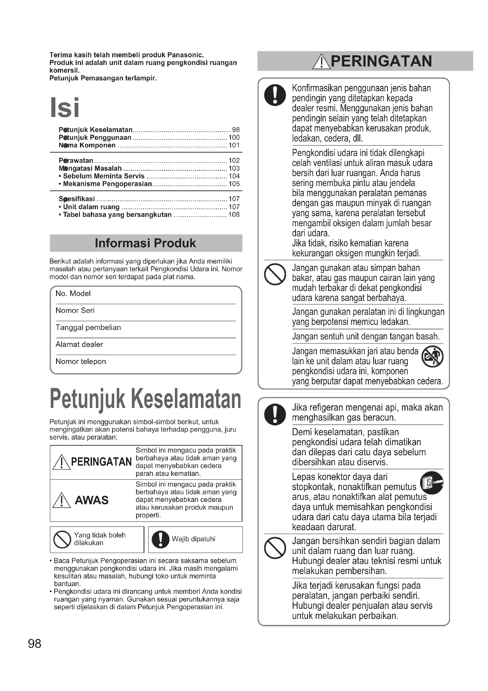 - Tabel bahasa yang bersangkutan ............................ 108 Isi Terima kasih telah membeli produk Panasonic.Produk ini adalah unit dalam ruang pengkondisi ruangan komersil.Petunjuk Pemasangan terlampir. Petunjuk Keselamatan Informasi Produk Berikut adalah informasi yang diperlukan jika Anda memiliki masalah atau pertanyaan terkait Pengkondisi Udara ini. Nomor model dan nomor seri terdapat pada plat nama.No. Model Nomor Seri Tanggal pembelianAlamat dealerNomor telepon Konrmasikan penggunaan jenis bahan pendingin yang ditetapkan kepada dealer resmi. Menggunakan jenis bahan pendingin selain yang telah ditetapkan dapat menyebabkan kerusakan produk, ledakan, cedera, dll. Pengkondisi udara ini tidak dilengkapi celah ventilasi untuk aliran masuk udara bersih dari luar ruangan. Anda harus sering membuka pintu atau jendela bila menggunakan peralatan pemanas dengan gas maupun minyak di ruangan yang sama, karena peralatan tersebut mengambil oksigen dalam jumlah besar dari udara. Jika tidak, risiko kematian karena kekurangan oksigen mungkin terjadi. Jangan gunakan atau simpan bahan bakar, atau gas maupun cairan lain yang mudah terbakar di dekat pengkondisi udara karena sangat berbahaya. Jangan gunakan peralatan ini di lingkungan yang berpotensi memicu ledakan. Jangan sentuh unit dengan tangan basah. Jangan memasukkan jari atau benda lain ke unit dalam atau luar ruang pengkondisi udara ini, komponen yang berputar dapat menyebabkan cedera. Jika regeran mengenai api, maka akan menghasilkan gas beracun. Demi keselamatan, pastikan pengkondisi udara telah dimatikan dan dilepas dari catu daya sebelum dibersihkan atau diservis. Lepas konektor daya dari stopkontak, nonaktifkan pemutus arus, atau nonaktifkan alat pemutus daya untuk memisahkan pengkondisi udara dari catu daya utama bila terjadi keadaan darurat. Jangan bersihkan sendiri bagian dalam unit dalam ruang dan luar ruang. Hubungi dealer atau teknisi resmi untuk melakukan pembersihan. Jika terjadi kerusakan fungsi pada peralatan, jangan perbaiki sendiri. Hubungi dealer penjualan atau servis untuk melakukan perbaikan. Petunjuk ini menggunakan simbol-simbol berikut, untuk mengingatkan akan potensi bahaya terhadap pengguna, juru servis, atau peralatan: PERINGATAN Simbol ini mengacu pada praktik berbahaya atau tidak aman yang dapat menyebabkan cedera parah atau kematian. AWAS Simbol ini mengacu pada praktik berbahaya atau tidak aman yang dapat menyebabkan cedera atau kerusakan produk maupun properti.Yang tidak boleh dilakukanWajib dipatuhi• Baca Petunjuk Pengoperasian ini secara saksama sebelum menggunakan pengkondisi udara ini. Jika masih mengalami kesulitan atau masalah, hubungi toko untuk meminta bantuan.• Pengkondisi udara ini dirancang untuk memberi Anda kondisi ruangan yang nyaman. Gunakan sesuai peruntukannya saja seperti dijelaskan di dalam Petunjuk Pengoperasian ini. PERINGATAN OI_00_291492_EU.indb 98 2017/6/20 10:47:4199 B.INDONESIA Alat ini dirancang untuk digunakan oleh pengguna ahli atau terlatih di bengkel, dalam industri ringan, dan peternakan, atau untuk penggunaan komersil oleh orang biasa. Peralatan ini tidak ditujukan untuk digunakan oleh seseorang (termasuk anak-anak) dengan kemampuan sik, pancaindera, atau mental yang kurang, atau tidak memiliki pengalaman maupun pengetahuan yang cukup, kecuali jika ia telah diberikan pengawasan atau petunjuk terkait dengan penggunaan peralatan tersebut oleh pihak yang bertanggung jawab atas keselamatannya. Anak-anak harus diawasi untuk memastikan mereka tidak bermain dengan peralatan ini. Beri jarak alarm kebakaran dan celah keluaran udara minimal 1,5 m dari unit. Jangan mengatur suhu terlalu panas atau terlalu dingin jika ada bayi atau penyandang cacat. Jangan menghidupkan atau mematikan pengkondisi udara langsung dari sakelar catu daya utama. Gunakan tombol pengoperasian ON/OFF. Jangan memasukkan benda apa pun ke saluran keluar udara unit luar ruang. Ini berbahaya karena kipas berputar pada kecepatan tinggi. Jangan sentuh saluran udara masuk atau sirip aluminium tajam di unit luar ruang. Anda dapat cedera. Jangan masukkan benda apapun ke WADAH KIPAS. Anda dapat mengalami cedera dan unit mungkin rusak. Sediakan stopkontak untuk digunakan secara khusus oleh masing-masing unit, dan pemutus catu daya, Pemutus Sirkuit Kebocoran Pentanahan (ELCB) atau Alat Arus Sisa (RCD) untuk perlindungan kelebihan arus harus disediakan untuk jalur khusus ini. Sediakan stopkontak khusus untuk masing-masing unit, dan peralatan pemutus arus sepenuhnya yang memiliki kontak terpisah di semua kutub harus diintegrasikan pada kabel tetap sesuai dengan peraturan kabel yang berlaku. Untuk mencegah kemungkinan bahaya akibat kegagalan isolasi, unit harus diarde. Jangan menggunakan kabel yang sudah diubah, kabel sambungan, kabel ekstensi, atau kabel di luar ketentuan untuk mencegah panas berlebih dan kebakaran. Hentikan penggunaan produk jika terjadi ketidaknormalan/kegagalan kemudian lepas colokan atau matikan saklar daya dan pemutus arus. (Risiko terjadinya asap/kebakaran/ sengatan listrik) Contoh abnormalitas/kegagalan: