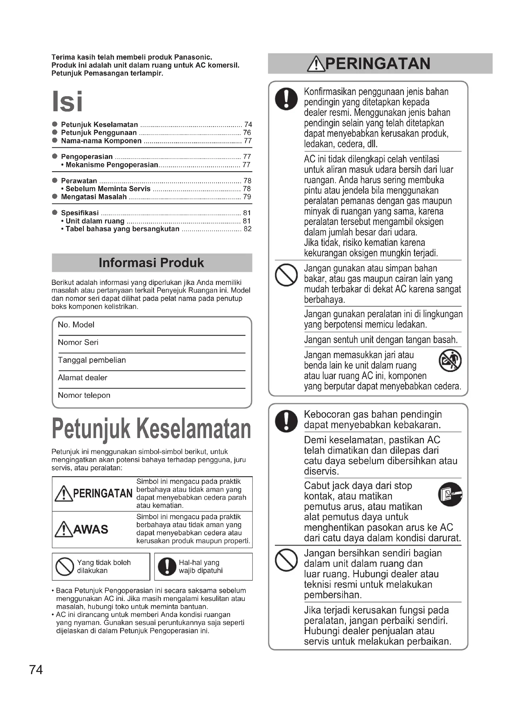 - • Tabel bahasa yang bersangkutan Isi Petunjuk Keselamatan Informasi Produk Berikut adalah informasi yang diperlukan jika Anda memiliki masalah atau pertanyaan terkait Penyejuk Ruangan ini. Model dan nomor seri dapat dilihat pada pelat nama pada penutup boks komponen kelistrikan.No. ModelNomor SeriTanggal pembelianAlamat dealerNomor telepon Konrmasikan penggunaan jenis bahan pendingin yang ditetapkan kepada dealer resmi. Menggunakan jenis bahan pendingin selain yang telah ditetapkan dapat menyebabkan kerusakan produk, ledakan, cedera, dll. AC ini tidak dilengkapi celah ventilasi untuk aliran masuk udara bersih dari luar ruangan. Anda harus sering membuka pintu atau jendela bila menggunakan peralatan pemanas dengan gas maupun minyak di ruangan yang sama, karena peralatan tersebut mengambil oksigen dalam jumlah besar dari udara. Jika tidak, risiko kematian karena kekurangan oksigen mungkin terjadi. Jangan gunakan atau simpan bahan bakar, atau gas maupun cairan lain yang mudah terbakar di dekat AC karena sangat berbahaya. Jangan gunakan peralatan ini di lingkungan yang berpotensi memicu ledakan. Jangan sentuh unit dengan tangan basah. Jangan memasukkan jari atau benda lain ke unit dalam ruang atau luar ruang AC ini, komponen yang berputar dapat menyebabkan cedera. Kebocoran gas bahan pendingin dapat menyebabkan kebakaran. Demi keselamatan, pastikan AC telah dimatikan dan dilepas dari catu daya sebelum dibersihkan atau diservis. Cabut jack daya dari stop kontak, atau matikan pemutus arus, atau matikan alat pemutus daya untuk menghentikan pasokan arus ke AC dari catu daya dalam kondisi darurat. Jangan bersihkan sendiri bagian dalam unit dalam ruang dan luar ruang. Hubungi dealer atau teknisi resmi untuk melakukan pembersihan. Jika terjadi kerusakan fungsi pada peralatan, jangan perbaiki sendiri. Hubungi dealer penjualan atau servis untuk melakukan perbaikan. Petunjuk ini menggunakan simbol-simbol berikut, untuk mengingatkan akan potensi bahaya terhadap pengguna, juru servis, atau peralatan: PERINGATAN Simbol ini mengacu pada praktik berbahaya atau tidak aman yang dapat menyebabkan cedera parah atau kematian. AWAS Simbol ini mengacu pada praktik berbahaya atau tidak aman yang dapat menyebabkan cedera atau kerusakan produk maupun properti.Yang tidak boleh dilakukanHal-hal yang wajib dipatuhiTerima kasih telah membeli produk Panasonic.Produk ini adalah unit dalam ruang untuk AC komersil.Petunjuk Pemasangan terlampir.• Baca Petunjuk Pengoperasian ini secara saksama sebelum menggunakan AC ini. Jika masih mengalami kesulitan atau masalah, hubungi toko untuk meminta bantuan.• AC ini dirancang untuk memberi Anda kondisi ruangan yang nyaman. Gunakan sesuai peruntukannya saja seperti dijelaskan di dalam Petunjuk Pengoperasian ini. PERINGATAN OI_00_F569714_EU_all.indb 74 2014-10-30 11:07:4475 p. 82