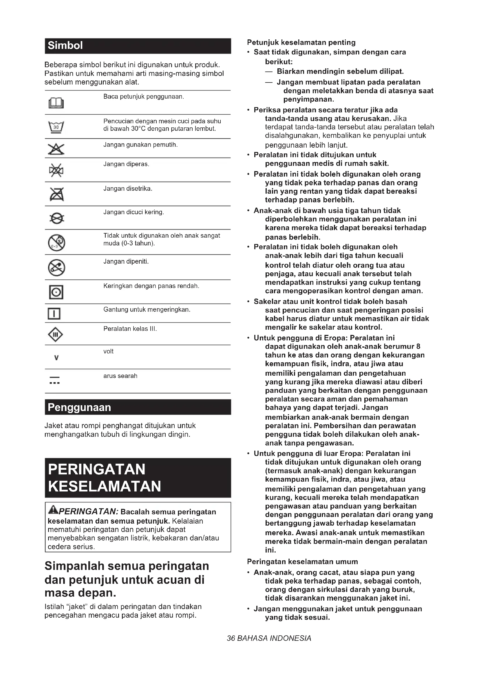 - Kartrid baterai mungkin berbeda antara satu negara dengan negara lainnya.36 BAHASA INDONESIA Simbol Beberapa simbol berikut ini digunakan untuk produk. Pastikan untuk memahami arti masing-masing simbol sebelum menggunakan alat. Baca petunjuk penggunaan.Pencucian dengan mesin cuci pada suhu di bawah 30°C dengan putaran lembut.Jangan gunakan pemutih.Jangan diperas.Jangan disetrika.Jangan dicuci kering.Tidak untuk digunakan oleh anak sangat muda (0-3 tahun).Jangan dipeniti.Keringkan dengan panas rendah.Gantung untuk mengeringkan.Peralatan kelas III. volt arus searah Penggunaan Jaket atau rompi penghangat ditujukan untuk menghangatkan tubuh di lingkungan dingin. PERINGATAN KESELAMATAN PERINGATAN: Bacalah semua peringatan keselamatan dan semua petunjuk. Kelalaian mematuhi peringatan dan petunjuk dapat menyebabkan sengatan listrik, kebakaran dan/atau cedera serius. Simpanlah semua peringatan dan petunjuk untuk acuan di masa depan. Istilah “jaket” di dalam peringatan dan tindakan pencegahan mengacu pada jaket atau rompi. Petunjuk keselamatan penting
