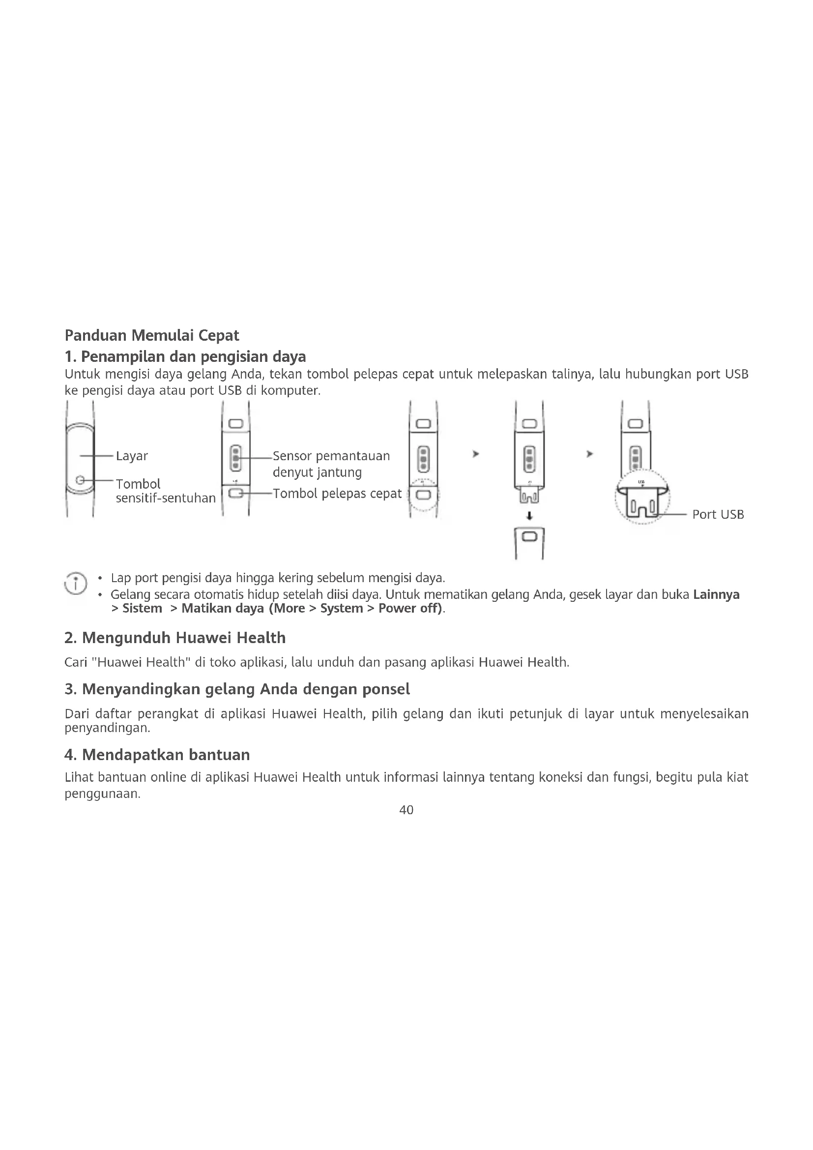 Dari daftar perangkat di aplikasi Huawei Health, pilih gelang dan ikuti petunjuk di layar untuk menyelesaikan penyandingan. Lihat bantuan online di aplikasi Huawei Health untuk informasi lainnya tentang koneksi dan fungsi, begitu pula kiat penggunaan. Sensor pemantauan denyut jantung Tombol sensitif-sentuhan Layar Port USB USB USB Tombol pelepas cepat USB USB USB USB40 41 Hak cipta © Huawei Technologies Co., Ltd. 2019. Semua hak dilindungi undang-undang. DOKUMEN INI DIMAKSUDKAN UNTUK TUJUAN INFORMASI SAJA, DAN TIDAK MENGGANTIKAN JENIS GARANSI APA PUN. Merek Dagang dan Izin , , , dan adalah merek dagang atau merek dagang terdaftar dari Huawei Technologies Co., Ltd. Merek kata dan logo Bluetooth