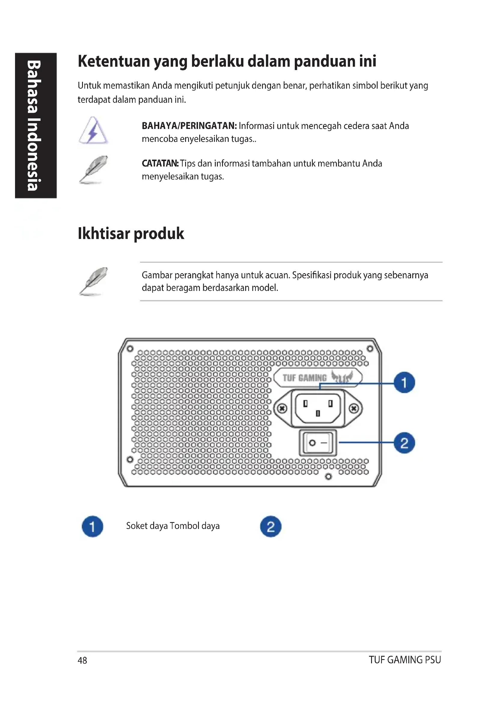 Bahasa Indonesia Bahasa Indonesia Ketentuan yang berlaku dalam panduan ini Untuk memastikan Anda mengikuti petunjuk dengan benar, perhatikan simbol berikut yang terdapat dalam panduan ini. BAHAYA/PERINGATAN: Informasi untuk mencegah cedera saat Anda mencoba enyelesaikan tugas.. CATATAN: Tips dan informasi tambahan untuk membantu Anda menyelesaikan tugas. Ikhtisar produk Gambar perangkat hanya untuk acuan. Spesikasi produk yang sebenarnya dapat beragam berdasarkan model. Soket daya Tombol dayaTUF GAMING PSU