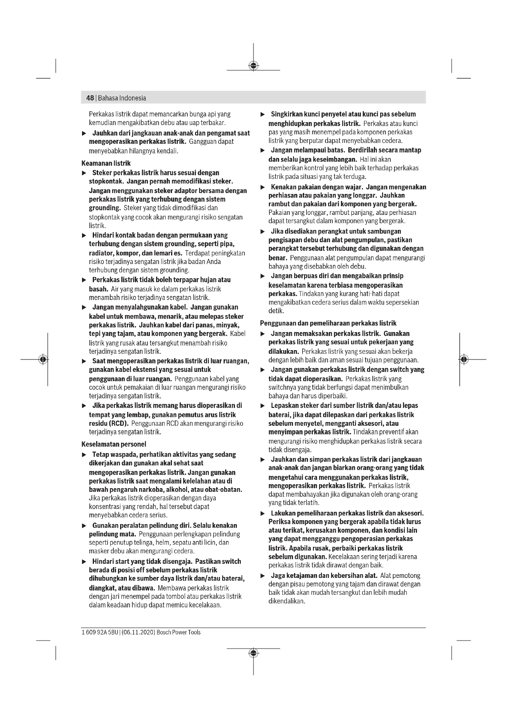 ศูนย์บริการหลังการขายของเรายินดีตอบคำถามของ ท่านที่เกี่ยวกับการบำรุงรักษาและการซ่อมแซมผลิตภัณฑ์รวม ทั้งเรื่องอะไหล่ ภาพเขียนแบบการประกอบและข้อมูลเกี่ยวกับ อะไหล่ กรุณาดูใน: www.bosch-pt.com ทีมงานที่ปรึกษาของ บ๊อช ยินดีให้ข้อมูลเกี่ยวกับผลิตภัณฑ์ ของเราและอุปกรณ์ประกอบต่างๆ เมื่อต้องการสอบถามและสั่งซื้ออะไหล่ กรุณาแจ้งหมายเลข สินค้า 10 หลักบนแผ่นป้ายรุ่นของผลิตภัณฑ์ทุกครั้ง สามารถดูที่อยู่ศูนย์บริการอื่นๆ ได้ที่: www.bosch-pt.com/serviceaddresses การกำจัดขยะ เครื่องมือไฟฟ้า อุปกรณ์ประกอบ และหีบห่อ ต้องนำ ไปแยกประเภทวัสดุเพื่อการรีไซเคิลที่เป็นมิตรต่อสิ่งแวดล้อม อย่าทิ้งเครื่องมือไฟฟ้าลงในขยะครัวเรือน! สำหรับประเทศสมาชิกสหภาพยุโรปเท่านั้น: ตามระเบียบสหภาพยุโรป 2012/19/EU เกี่ยวกับเศษเหลือ ทิ้งของผลิตภัณฑ์ไฟฟ้าและอิเล็กทรอนิกส์และการนำไปปฏิบัติ ในกฎหมายระดับประเทศ ต้องเก็บคัดแยกเครื่องมือไฟฟ้าที่ไม่ สามารถใช้งานได้อีกต่อไปและส่งเข้าสู่กระบวนการรีไซเคิลที่ ไม่ทำลายสภาพแวดล้อม Bahasa Indonesia Petunjuk Keselamatan Petunjuk keselamatan umum untuk perkakas listrik PERINGATAN Baca semua peringatan, petunjuk, ilustrasi, dan spesifikasi keselamatan yang diberikan bersama perkakas listrik ini. Kesalahan dalam menjalankan petunjuk di bawah ini dapat mengakibatkan sengatan listrik, kebakaran, dan/atau cedera serius. Simpanlah semua peringatan dan petunjuk untuk penggunaan di masa mendatang. Istilah "perkakas listrik" dalam peringatan mengacu pada perkakas listrik yang dioperasikan dengan listrik (menggunakan kabel) atau perkakas listrik yang dioperasikan dengan baterai (tanpa kabel). Keamanan tempat kerja u Jaga kebersihan dan pencahayaan area kerja. Area yang berantakan atau gelap dapat memicu kecelakaan. u Jangan mengoperasikan perkakas listrik di lingkungan yang dapat memicu ledakan, seperti adanya cairan, gas, atau debu yang mudah terbakar. Bosch Power Tools 1 609 92A 5BU | (06.11.2020)48 | Bahasa Indonesia Perkakas listrik dapat memancarkan bunga api yang kemudian mengakibatkan debu atau uap terbakar. u Jauhkan dari jangkauan anak-anak dan pengamat saat mengoperasikan perkakas listrik. Gangguan dapat menyebabkan hilangnya kendali. Keamanan listrik u Steker perkakas listrik harus sesuai dengan stopkontak. Jangan pernah memodifikasi steker. Jangan menggunakan steker adaptor bersama dengan perkakas listrik yang terhubung dengan sistem grounding. Steker yang tidak dimodifikasi dan stopkontak yang cocok akan mengurangi risiko sengatan listrik. u Hindari kontak badan dengan permukaan yang terhubung dengan sistem grounding, seperti pipa, radiator, kompor, dan lemari es. Terdapat peningkatan risiko terjadinya sengatan listrik jika badan Anda terhubung dengan sistem grounding. u Perkakas listrik tidak boleh terpapar hujan atau basah. Air yang masuk ke dalam perkakas listrik menambah risiko terjadinya sengatan listrik. u Jangan menyalahgunakan kabel. Jangan gunakan kabel untuk membawa, menarik, atau melepas steker perkakas listrik. Jauhkan kabel dari panas, minyak, tepi yang tajam, atau komponen yang bergerak. Kabel listrik yang rusak atau tersangkut menambah risiko terjadinya sengatan listrik. u Saat mengoperasikan perkakas listrik di luar ruangan, gunakan kabel ekstensi yang sesuai untuk penggunaan di luar ruangan. Penggunaan kabel yang cocok untuk pemakaian di luar ruangan mengurangi risiko terjadinya sengatan listrik. u Jika perkakas listrik memang harus dioperasikan di tempat yang lembap, gunakan pemutus arus listrik residu (RCD). Penggunaan RCD akan mengurangi risiko terjadinya sengatan listrik. Keselamatan personel u Tetap waspada, perhatikan aktivitas yang sedang dikerjakan dan gunakan akal sehat saat mengoperasikan perkakas listrik. Jangan gunakan perkakas listrik saat mengalami kelelahan atau di bawah pengaruh narkoba, alkohol, atau obat-obatan. Jika perkakas listrik dioperasikan dengan daya konsentrasi yang rendah, hal tersebut dapat menyebabkan cedera serius. u Gunakan peralatan pelindung diri. Selalu kenakan pelindung mata. Penggunaan perlengkapan pelindung seperti penutup telinga, helm, sepatu anti licin, dan masker debu akan mengurangi cedera. u Hindari start yang tidak disengaja. Pastikan switch berada di posisi off sebelum perkakas listrik dihubungkan ke sumber daya listrik dan/atau baterai, diangkat, atau dibawa. Membawa perkakas listrik dengan jari menempel pada tombol atau perkakas listrik dalam keadaan hidup dapat memicu kecelakaan. u Singkirkan kunci penyetel atau kunci pas sebelum menghidupkan perkakas listrik. Perkakas atau kunci pas yang 