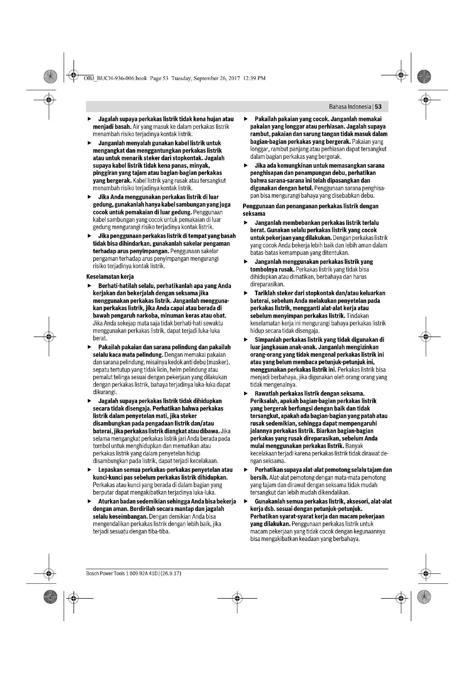 Bahasa Indonesia Petunjuk-Petunjuk untuk Keselamatan Kerja Petunjuk-Petunjuk Umum untuk Perkakas Listrik Bacalah semua petunjuk- petunjuk untuk keselamatan kerja dan petunjuk-petunjuk untuk penggunaan. Kesalahan dalam menjalankan petunjuk-petunjuk untuk keselamatan kerja dan petunjuk-petunjuk untuk penggunaan dapat mengakibatkan kontak listrik, kebakaran dan/atau luka- luka yang berat. Simpanlah semua petunjuk-petunjuk untuk keselamatan kerja dan petunjuk-petunjuk lainnya untuk penggunaan di masa depan. Kata „perkakas listrik“ yang disebutkan di dalam petunjuk- petunjuk untuk keselamatan kerja adalah sebutan untuk perkakas listrik pakai listrik jaringan (dengan kabel) dan untuk perkakas listrik tenaga baterai (tanpa kabel listrik). Keselamatan kerja di tempat kerja Jagalah supaya tempat kerja selalu bersih dan terang. Tempat kerja yang tidak rapi atau tidak terang dapat mengakibatkan terjadinya kecelakaan. Janganlah menggunakan perkakas listrik di tempat di mana dapat terjadi ledakan, di mana ada cairan, gas atau debu yang mudah terbakar. Perkakas listrik dapat memancarkan bunga api yang lalu mengakibatkan debu atau uap terbakar. Selama menggunakan perkakas listrik, jauhkan anak- anak dan orang-orang lain dari tempat kerja. Jika konsentrasi terganggu, bisa jadi Anda tidak bisa mengen- dalikan perkakas listrik tersebut. Keamanan listrik Steker dari perkakas listrik harus cocok pada stopkontak. Janganlah sekali-kali merubah steker. Janganlah menggunakan steker perantara bersama dengan perkakas listrik yang mempunyai hubungan arde. Steker yang tidak dirubah dan stopkontak yang cocok mengurangi bahaya terjadinya kontak listrik. Jagalah supaya badan Anda tidak bersentuhan dengan permukaan yang mempunyai hubungan arde, misalnya pipa-pipa, radiator pemanas ruangan, kompor listrik dan lemari es. Ada risiko besar terjadi kontak listrik, jika badan Anda mempunyai hubungan arde. PERHATIKANLAH OBJ_BUCH-936-006.book Page 52 Tuesday, September 26, 2017 12:39 PMBahasa Indonesia | 53 Bosch Power Tools 1 609 92A 41D | (26.9.17) Jagalah supaya perkakas listrik tidak kena hujan atau menjadi basah. Air yang masuk ke dalam perkakas listrik menambah risiko terjadinya kontak listrik. Janganlah menyalah gunakan kabel listrik untuk mengangkat dan menggantungkan perkakas listrik atau untuk menarik steker dari stopkontak. Jagalah supaya kabel listrik tidak kena panas, minyak, pinggiran yang tajam atau bagian-bagian perkakas yang bergerak. Kabel listrik yang rusak atau tersangkut menambah risiko terjadinya kontak listrik. Jika Anda menggunakan perkakas listrik di luar gedung, gunakanlah hanya kabel sambungan yang juga cocok untuk pemakaian di luar gedung. Penggunaan kabel sambungan yang cocok untuk pemakaian di luar gedung mengurangi risiko terjadinya kontak listrik. Jika penggunaan perkakas listrik di tempat yang basah tidak bisa dihindarkan, gunakanlah sakelar pengaman terhadap arus penyimpangan. Penggunaan sakelar pengaman terhadap arus penyimpangan mengurangi risiko terjadinya kontak listrik. Keselamatan kerja Berhati-hatilah selalu, perhatikanlah apa yang Anda kerjakan dan bekerjalah dengan seksama jika menggunakan perkakas listrik. Janganlah mengguna- kan perkakas listrik, jika Anda capai atau berada di bawah pengaruh narkoba, minuman keras atau obat. Jika Anda sekejap mata saja tidak berhati-hati sewaktu menggunakan perkakas listrik, dapat terjadi luka-luka berat. Pakailah pakaian dan sarana pelindung dan pakailah selalu kaca mata pelindung. Dengan memakai pakaian dan sarana pelindung, misalnya kedok anti debu (masker), sepatu tertutup yang tidak licin, helm pelindung atau pemalut telinga sesuai dengan pekerjaan yang dilakukan dengan perkakas listrik, bahaya terjadinya luka-luka dapat dikurangi. Jagalah supaya perkakas listrik tidak dihidupkan secara tidak disengaja. Perhatikan bahwa perkakas listrik dalam penyetelan mati, jika steker disambungkan pada pengadaan listrik dan/atau baterai, jika perkakas listrik diangkat atau dibawa. Jika selama mengangkat perkakas listrik jari Anda berada pada tombol untuk menghidupkan dan mematikan atau perkakas listrik yang dalam penyetelan hidup disambungkan pada listrik, dapat terjadi kecelakaan. Lepaskan semua perkakas-perkakas penyetelan atau kunci-kunci pas sebelum perkakas listrik dihidupkan. Perkakas atau kunci yang berada di dalam bagian yang berputar dapat mengakibatkan terjadinya luka-luka. Aturkan badan sedemikian sehingga Anda bisa bekerja dengan aman. Berdirilah secara mantap dan jagalah selalu keseimbangan. Dengan demikian Anda bisa mengendalikan perkakas listrik dengan lebih baik, jika terjadi sesuatu dengan tiba-tiba. Pakailah pakaian yang cocok. Janganlah memakai pakaian yang longgar atau perhiasan. Jagalah supaya rambut, pakaian dan sarung tangan tidak masuk dalam bagian-bagian perkakas yang bergerak. Pakaian yang longgar, rambut panjang atau perhiasan dapat tersangkut dalam bagian perkakas yang bergerak. Jika ada kemungkinan untuk memasangkan sarana penghisapan dan penampungan debu, perhatikan bahwa sarana-sarana ini telah dipasangkan dan digunakan dengan betul. Penggunaan sarana penghisa- pan bisa mengurangi bahaya yang disebabkan debu. Penggunaan dan penanganan perkakas listrik dengan seksama Janganlah membebankan perkakas listrik terlalu berat. Gunakan selalu perkakas listrik yang cocok untuk pekerjaan yang dilakukan. Dengan perkakas listrik yang cocok Anda bekerja lebih baik dan lebih aman dalam batas-batas kemampuan yang ditentukan. Janganlah menggunakan perkakas listrik yang tombolnya rusak. Perkakas listrik yang tidak bisa dihidupkan atau dimatikan, berbahaya dan harus direparasikan. Tariklah steker dari stopkontak dan/atau keluarkan baterai, sebelum Anda melakukan penyetelan pada perkakas listrik, mengganti alat-alat kerja atau sebelum menyimpan perkakas listrik. Tindakan keselamatan kerja ini mengurangi bahaya perkakas listrik hidup secara tidak disengaja. Simpanlah perkakas listrik yang tidak digunakan di luar jangkauan anak-anak. Janganlah m