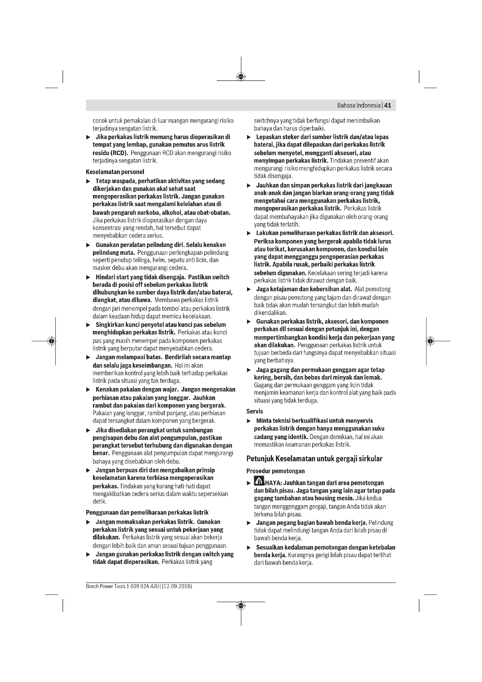 Tanda pemotongan 0° (9) menunjukkan posisi mata gergaji pada pemotongan persegi. Tanda pemotongan 45° (8) menunjukkan posisi mata gergaji pada pemotongan 45°. Untuk melakukan pemotongan yang tepat, dekatkan mesin gergaji bundar pada benda kerja seperti terlihat pada gambar. Sebaiknya dilakukan uji coba pemotongan dahulu. Cara penggunaan u Perhatikan tegangan listrik! Tegangan jaringan listrik harus sesuai dengan tegangan listrik yang tercantum pada label tipe perkakas listrik. Perkakas listrik dengan daya sebesar 230V seperti yang diindikasikan pada label dapat juga dioperasikan pada daya 220 V. Menghidupkan/mematikan perkakas listrik u Pastikan bahwa Anda dapat mengoperasikan tombol untuk menghidupkan dan mematikan tanpa perlu melepaskan handle. Untuk penggunaan perkakas listrik pertama kali, tekan switch pengaman (2) dan tekan serta tahan kemudian tombol on/off (1). Untuk menonaktifkan perkakas listrik, lepaskan tombol on/ off (1). Catatan: Demi alasan keselamatan, tombol on/off (1) tidak bisa dikunci, melainkan selama penggunaan perkakas, tombol harus selalu ditekan. Petunjuk pengoperasian u Sebelum mulai dengan pekerjaan pada perkakas listrik, tariklah steker dari stopkontak. Lindungi mata gergaji dari benturan dan tumbukan. Gerakkan perkakas listrik secara merata dan dengan dorongan ringan ke arah pemotongan. Dorongan yang terlalu kuat akan sangat mengurangi masa pakai alat kerja dan dapat merusak perkakas listrik. Daya dan kualitas pemotongan tergantung pada keadaan dan bentuk gigi dari mata gergaji. Karena itu, hanya gunakan mata gergaji yang tajam dan sesuai untuk bahan yang akan dikerjakan. Menggergaji kayu Pemilihan mata gergaji yang sesuai didasarkan pada jenis kayu, kualitas kayu dan jenis pemotongan, apakah memanjang atau melintang. Pada pemotongan memanjang pada kayu cemara terdapat serpihan kayu yang berbentuk spiral dan panjang. Debu kayu beech dan kayu oak sangat berbahaya bagi kesehatan, karena itu, hanya operasikan perkakas dengan pengisap debu. Menggergaji dengan mistar sejajar (lihat gambar C) Mistar sejajar (10) memungkinkan pemotongan yang tepat pada sepanjang tepi benda kerja atau bagian dari potongan yang sama. Lepaskan baut kupu-kupu (7) dan geser skala pada mistar sejajar (10) melalui pemandu pada pelat dasar (12). Atur lebar pemotongan yang diinginkan sebagai nilai skala pada tanda pemotongan yang sesuai (9) atau (8), lihat pada bab "Tanda pemotongan". Kencangkan kembali baut kupu-kupu (7). Menggergaji dengan alat penghenti (lihat gambar D) Untuk memotong benda-benda yang besar atau memotong tepian yang lurus, Anda bisa mengencangkan sebuah papan atau lis sebagai penghenti benda kerja dan memandu gergaji bundar dengan pelat dasar pada alat penghenti. Bahasa Indonesia | 45 Bosch Power Tools 1 609 92A 4JU | (12.09.2018)46 | Tiếng Việt 1 609 92A 4JU | (12.09.2018) Bosch Power Tools Perawatan dan servis Perawatan dan pembersihan u Sebelum mulai dengan pekerjaan pada perkakas listrik, tariklah steker dari stopkontak. u Perkakas listrik dan lubang ventilasi harus selalu dibersihkan agar perkakas dapat digunakan dengan baik dan aman. Kap pelindung harus selalu dapat bergerak secara bebas dan harus dapat menutup sendiri. Karena itu, jaga kebersihan area di sekitar kap pelindung. Bersihkan debu dan serpihan menggunakan sikat. Mata gergaji yang tidak dilapisi bisa dilindungi dari korotan dengan mengolesinya dengan minyak yang tidak mengandung asam. Sebelum menggunakan mesin gergaji, bersihkan mata gergaji dari minyak karena kayu bisa tercemar karenanya. Sisa-sisa damar dan lem pada mata gergaji akan memengaruhi hasil pemotongan. Karena itu, bersihkan mata gergaji setelah penggunaan. Jika kabel listrik harus diganti, pekerjaan ini harus dilakukan oleh Bosch atau Service Center untuk perkakas listrik Bosch yang resmi, agar keselamatan kerja selalu terjamin. Layanan pelanggan dan konsultasi penggunaan Layanan pelanggan Bosch menjawab semua pertanyaan Anda tentang reparasi dan perawatan serta tentang suku cadang produk ini. Gambaran teknis (exploded view) dan informasi mengenai suku cadang dapat ditemukan di: www.bosch-pt.com Tim konsultasi penggunaan Bosch akan membantu Anda menjawab pertanyaan seputar produk kami beserta aksesorinya. www.powertool-portal.de, portal internet untuk perajin dan tukang. Jika Anda hendak menanyakan sesuatu atau memesan suku cadang, selalu sebutkan nomor model yang terdiri atas 10angka dan tercantum pada label tipe produk. Indonesia PT Robert Bosch Palma Tower 10th Floor Jalan RA Kartini II-S Kaveling 6 Pondok Pinang, Kebayoran Lama Jakarta Selatan 12310 Tel.: (021) 3005 5800 Fax: (021) 3005 5801 E-Mail: boschpowertools@id.bosch.com www.bosch-pt.co.id Cara membuang Perkakas listrik, aksesori, dan kemasan sebaiknya didaur ulang secara ramah lingkungan. Jangan membuang perkakas listrik ke dalam sampah rumah tangga! Tiếng Việt Hướng dẫn an toàn Hướng dẫn an toàn chung cho dụng cụ điện