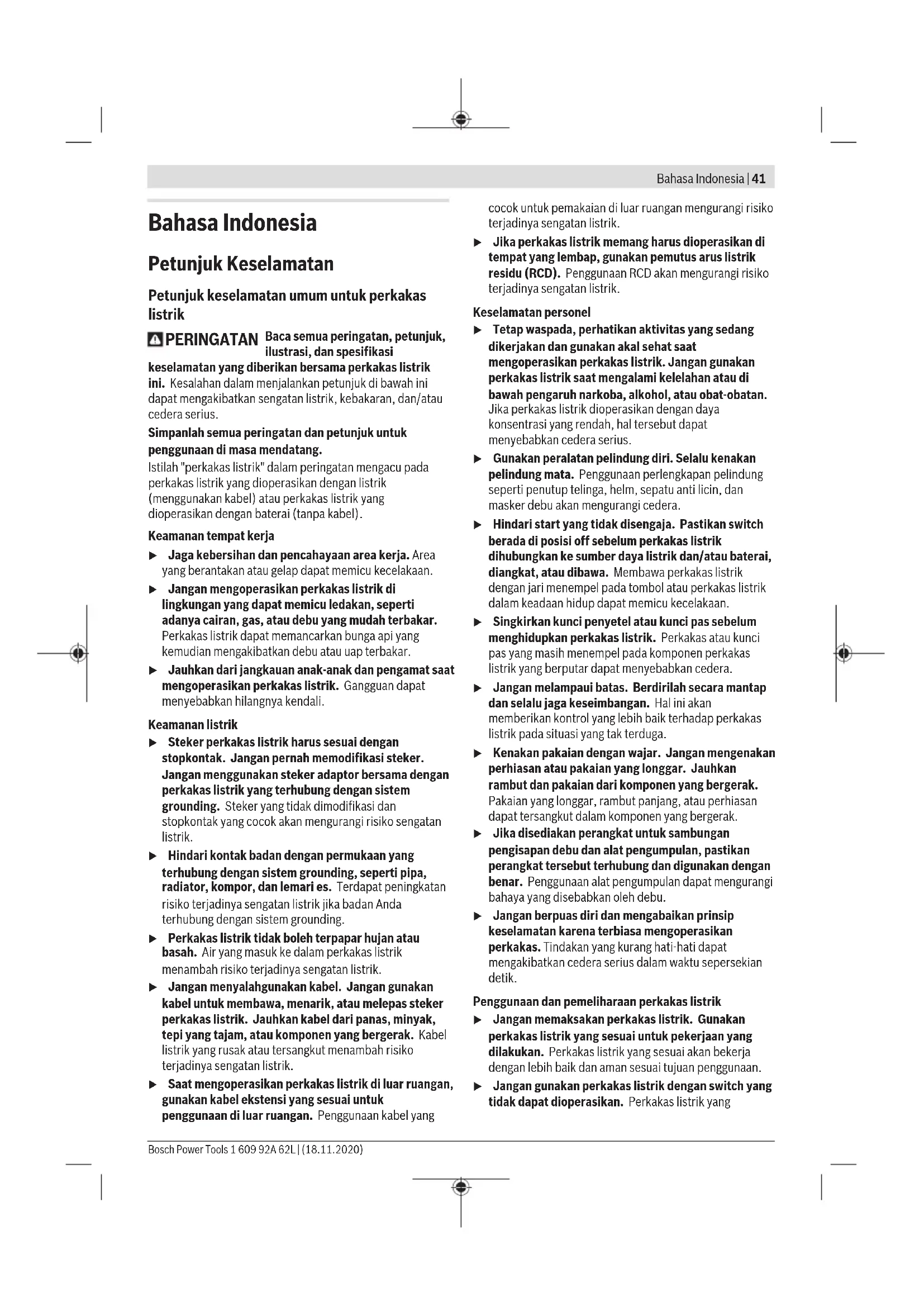 โทรศัพท์ 02 7587555 โทรสาร 02 7587525 สามารถดูที่อยู่ศูนย์บริการอื่นๆ ได้ที่: www.bosch-pt.com/serviceaddresses การกำจัดขยะ เครื่องมือไฟฟ้า อุปกรณ์ประกอบ และหีบห่อ ต้องนำ ไปแยกประเภทวัสดุเพื่อการรีไซเคิลที่เป็นมิตรต่อสิ่งแวดล้อม อย่าทิ้งเครื่องมือไฟฟ้าลงในขยะครัวเรือน! 1 609 92A 62L | (18.11.2020) Bosch Power ToolsBahasa Indonesia | 41 Bahasa Indonesia Petunjuk Keselamatan Petunjuk keselamatan umum untuk perkakas listrik PERINGATAN Baca semua peringatan, petunjuk, ilustrasi, dan spesifikasi keselamatan yang diberikan bersama perkakas listrik ini. Kesalahan dalam menjalankan petunjuk di bawah ini dapat mengakibatkan sengatan listrik, kebakaran, dan/atau cedera serius. Simpanlah semua peringatan dan petunjuk untuk penggunaan di masa mendatang. Istilah "perkakas listrik" dalam peringatan mengacu pada perkakas listrik yang dioperasikan dengan listrik (menggunakan kabel) atau perkakas listrik yang dioperasikan dengan baterai (tanpa kabel). Keamanan tempat kerja u Jaga kebersihan dan pencahayaan area kerja. Area yang berantakan atau gelap dapat memicu kecelakaan. u Jangan mengoperasikan perkakas listrik di lingkungan yang dapat memicu ledakan, seperti adanya cairan, gas, atau debu yang mudah terbakar. Perkakas listrik dapat memancarkan bunga api yang kemudian mengakibatkan debu atau uap terbakar. u Jauhkan dari jangkauan anak-anak dan pengamat saat mengoperasikan perkakas listrik. Gangguan dapat menyebabkan hilangnya kendali. Keamanan listrik u Steker perkakas listrik harus sesuai dengan stopkontak. Jangan pernah memodifikasi steker. Jangan menggunakan steker adaptor bersama dengan perkakas listrik yang terhubung dengan sistem grounding. Steker yang tidak dimodifikasi dan stopkontak yang cocok akan mengurangi risiko sengatan listrik. u Hindari kontak badan dengan permukaan yang terhubung dengan sistem grounding, seperti pipa, radiator, kompor, dan lemari es. Terdapat peningkatan risiko terjadinya sengatan listrik jika badan Anda terhubung dengan sistem grounding. u Perkakas listrik tidak boleh terpapar hujan atau basah. Air yang masuk ke dalam perkakas listrik menambah risiko terjadinya sengatan listrik. u Jangan menyalahgunakan kabel. Jangan gunakan kabel untuk membawa, menarik, atau melepas steker perkakas listrik. Jauhkan kabel dari panas, minyak, tepi yang tajam, atau komponen yang bergerak. Kabel listrik yang rusak atau tersangkut menambah risiko terjadinya sengatan listrik. u Saat mengoperasikan perkakas listrik di luar ruangan, gunakan kabel ekstensi yang sesuai untuk penggunaan di luar ruangan. Penggunaan kabel yang cocok untuk pemakaian di luar ruangan mengurangi risiko terjadinya sengatan listrik. u Jika perkakas listrik memang harus dioperasikan di tempat yang lembap, gunakan pemutus arus listrik residu (RCD). Penggunaan RCD akan mengurangi risiko terjadinya sengatan listrik. Keselamatan personel u Tetap waspada, perhatikan aktivitas yang sedang dikerjakan dan gunakan akal sehat saat mengoperasikan perkakas listrik. Jangan gunakan perkakas listrik saat mengalami kelelahan atau di bawah pengaruh narkoba, alkohol, atau obat-obatan. Jika perkakas listrik dioperasikan dengan daya konsentrasi yang rendah, hal tersebut dapat menyebabkan cedera serius. u Gunakan peralatan pelindung diri. Selalu kenakan pelindung mata. Penggunaan perlengkapan pelindung seperti penutup telinga, helm, sepatu anti licin, dan masker debu akan mengurangi cedera. u Hindari start yang tidak disengaja. Pastikan switch berada di posisi off sebelum perkakas listrik dihubungkan ke sumber daya listrik dan/atau baterai, diangkat, atau dibawa. Membawa perkakas listrik dengan jari menempel pada tombol atau perkakas listrik dalam keadaan hidup dapat memicu kecelakaan. u Singkirkan kunci penyetel atau kunci pas sebelum menghidupkan perkakas listrik. Perkakas atau kunci pas yang masih menempel pada komponen perkakas listrik yang berputar dapat menyebabkan cedera. u Jangan melampaui batas. Berdirilah secara mantap dan selalu jaga keseimbangan. Hal ini akan memberikan kontrol yang lebih baik terhadap perkakas listrik pada situasi yang tak terduga. u Kenakan pakaian dengan wajar. Jangan mengenakan perhiasan atau pakaian yang longgar. Jauhkan rambut dan pakaian dari komponen yang bergerak. Pakaian yang longgar, rambut panjang, atau perhiasan dapat tersangkut dalam komponen yang bergerak. u Jika disediakan perangkat untuk sambungan pengisapan debu dan alat pengumpulan, pastikan perangkat tersebut terhubung dan digunakan dengan benar. Penggunaan alat pengumpulan dapat mengurangi bahaya yang disebabkan oleh debu. u Jangan berpuas diri dan mengabaikan prinsip keselamatan karena terbiasa mengoperasikan perkakas. Tindakan yang kurang hati-hati dapat mengakibatkan cedera serius dalam waktu sepersekian detik. Penggunaan dan pemeliharaan perkakas listrik u Jangan memaksakan perkakas listrik. Gunakan perkakas listrik yang sesuai untuk pekerjaan yang dilakukan. Perkakas listrik yang sesuai akan bekerja dengan lebih baik dan aman sesuai tujuan penggunaan. u Jangan gunakan perkakas listrik dengan switch yang tidak dapat dioperasikan. Perkakas listrik yang Bosch Power Tools 1 609 92A 62L | (18.11.2020)42 | Bahasa Indonesia switchnya yang tidak berfungsi dapat menimbulkan bahaya dan harus diperbaiki. u Lepaskan steker dari sumber listrik dan/atau lepas baterai, jika dapat dilepaskan dari perkakas listrik sebelum menyetel, mengganti aksesori, atau menyimpan perkakas listrik. Tindakan preventif akan mengurangi risiko menghidupkan perkakas listrik secara tidak disengaja. u Jauhkan dan simpan perkakas listrik dari jangkauan anak-anak dan jangan biarkan 