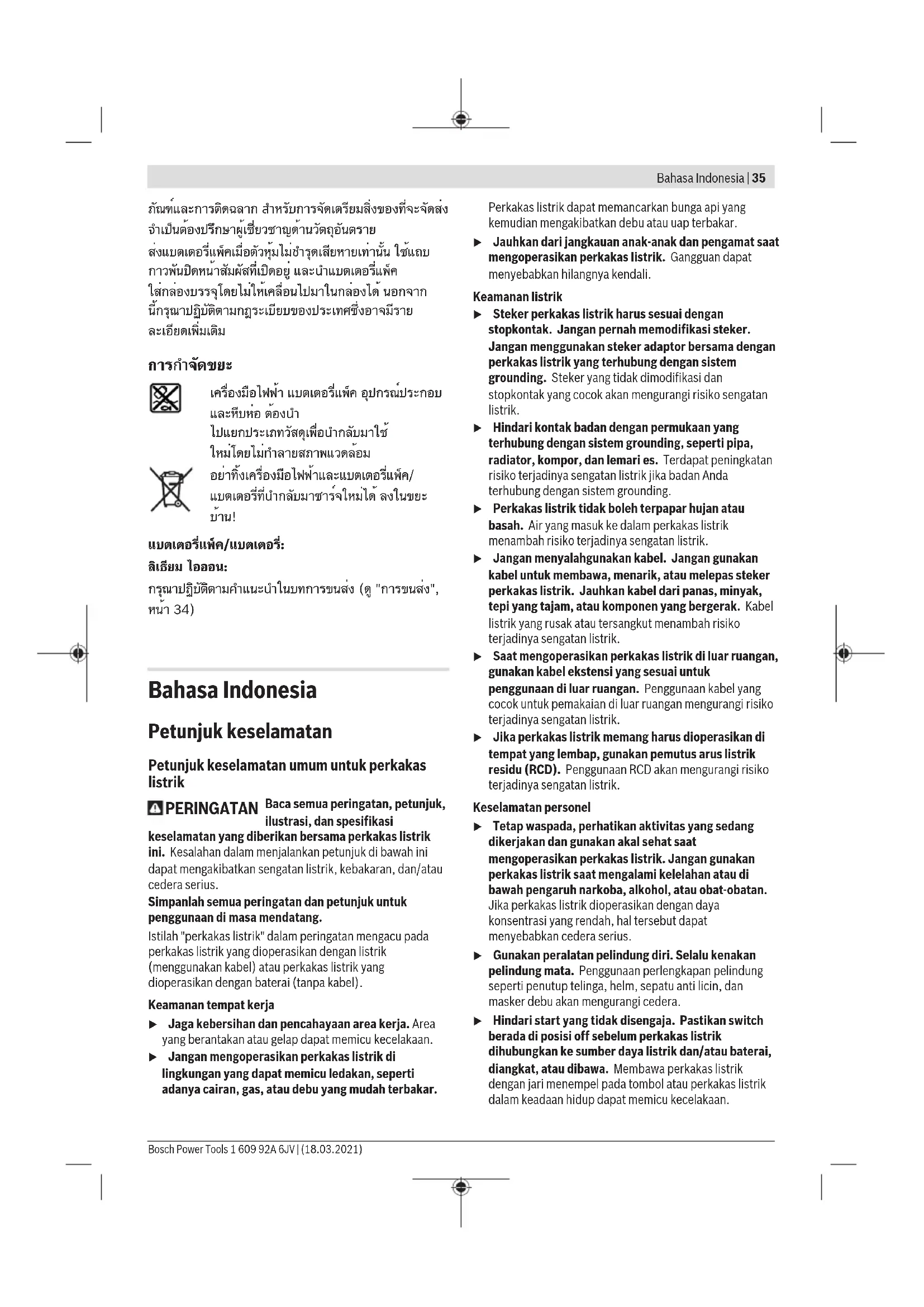 แบตเตอรี่แพ็ค/แบตเตอรี่: ลิเธียม ไอออน: กรุณาปฏิบัติตามคำแนะนำในบทการขนส่ง (ดู "การขนส่ง", หน้า34) Bahasa Indonesia Petunjuk keselamatan Petunjuk keselamatan umum untuk perkakas listrik PERINGATAN Baca semua peringatan, petunjuk, ilustrasi, dan spesifikasi keselamatan yang diberikan bersama perkakas listrik ini. Kesalahan dalam menjalankan petunjuk di bawah ini dapat mengakibatkan sengatan listrik, kebakaran, dan/atau cedera serius. Simpanlah semua peringatan dan petunjuk untuk penggunaan di masa mendatang. Istilah "perkakas listrik" dalam peringatan mengacu pada perkakas listrik yang dioperasikan dengan listrik (menggunakan kabel) atau perkakas listrik yang dioperasikan dengan baterai (tanpa kabel). Keamanan tempat kerja u Jaga kebersihan dan pencahayaan area kerja. Area yang berantakan atau gelap dapat memicu kecelakaan. u Jangan mengoperasikan perkakas listrik di lingkungan yang dapat memicu ledakan, seperti adanya cairan, gas, atau debu yang mudah terbakar. Perkakas listrik dapat memancarkan bunga api yang kemudian mengakibatkan debu atau uap terbakar. u Jauhkan dari jangkauan anak-anak dan pengamat saat mengoperasikan perkakas listrik. Gangguan dapat menyebabkan hilangnya kendali. Keamanan listrik u Steker perkakas listrik harus sesuai dengan stopkontak. Jangan pernah memodifikasi steker. Jangan menggunakan steker adaptor bersama dengan perkakas listrik yang terhubung dengan sistem grounding. Steker yang tidak dimodifikasi dan stopkontak yang cocok akan mengurangi risiko sengatan listrik. u Hindari kontak badan dengan permukaan yang terhubung dengan sistem grounding, seperti pipa, radiator, kompor, dan lemari es. Terdapat peningkatan risiko terjadinya sengatan listrik jika badan Anda terhubung dengan sistem grounding. u Perkakas listrik tidak boleh terpapar hujan atau basah. Air yang masuk ke dalam perkakas listrik menambah risiko terjadinya sengatan listrik. u Jangan menyalahgunakan kabel. Jangan gunakan kabel untuk membawa, menarik, atau melepas steker perkakas listrik. Jauhkan kabel dari panas, minyak, tepi yang tajam, atau komponen yang bergerak. Kabel listrik yang rusak atau tersangkut menambah risiko terjadinya sengatan listrik. u Saat mengoperasikan perkakas listrik di luar ruangan, gunakan kabel ekstensi yang sesuai untuk penggunaan di luar ruangan. Penggunaan kabel yang cocok untuk pemakaian di luar ruangan mengurangi risiko terjadinya sengatan listrik. u Jika perkakas listrik memang harus dioperasikan di tempat yang lembap, gunakan pemutus arus listrik residu (RCD). Penggunaan RCD akan mengurangi risiko terjadinya sengatan listrik. Keselamatan personel u Tetap waspada, perhatikan aktivitas yang sedang dikerjakan dan gunakan akal sehat saat mengoperasikan perkakas listrik. Jangan gunakan perkakas listrik saat mengalami kelelahan atau di bawah pengaruh narkoba, alkohol, atau obat-obatan. Jika perkakas listrik dioperasikan dengan daya konsentrasi yang rendah, hal tersebut dapat menyebabkan cedera serius. u Gunakan peralatan pelindung diri. Selalu kenakan pelindung mata. Penggunaan perlengkapan pelindung seperti penutup telinga, helm, sepatu anti licin, dan masker debu akan mengurangi cedera. u Hindari start yang tidak disengaja. Pastikan switch berada di posisi off sebelum perkakas listrik dihubungkan ke sumber daya listrik dan/atau baterai, diangkat, atau dibawa. Membawa perkakas listrik dengan jari menempel pada tombol atau perkakas listrik dalam keadaan hidup dapat memicu kecelakaan. Bosch Power Tools 1 609 92A 6JV | (18.03.2021)36 | Bahasa Indonesia u Singkirkan kunci penyetel atau kunci pas sebelum menghidupkan perkakas listrik. Perkakas atau kunci pas yang masih menempel pada komponen perkakas listrik yang berputar dapat menyebabkan cedera. u Jangan melampaui batas. Berdirilah secara mantap dan selalu jaga keseimbangan. Hal ini akan memberikan kontrol yang lebih baik terhadap perkakas listrik pada situasi yang tak terduga. u Kenakan pakaian dengan wajar. Jangan mengenakan perhiasan atau pakaian yang longgar. Jauhkan rambut dan pakaian dari komponen yang bergerak. Pakaian yang longgar, rambut panjang, atau perhiasan dapat tersangkut dalam komponen yang bergerak. u Jika disediakan perangkat untuk sambungan pengisapan debu dan alat pengumpulan, pastikan perangkat tersebut terhubung dan digunakan dengan benar. Penggunaan alat pengumpulan dapat mengurangi bahaya yang disebabkan oleh debu. u Jangan berpuas diri dan mengabaikan prinsip keselamatan karena terbiasa mengoperasikan perkakas. Tindakan yang kurang hati-hati dapat mengakibatkan cedera serius dalam waktu sepersekian detik. Penggunaan dan pemeliharaan perkakas listrik u Jangan memaksakan perkakas listrik. Gunakan perkakas listrik yang sesuai untuk pekerjaan yang dilakukan. Perkakas listrik yang sesuai akan bekerja dengan lebih baik dan aman sesuai tujuan penggunaan. u Jangan gunakan perkakas listrik dengan switch yang tidak dapat dioperasikan. Perkakas listrik yang switchnya yang tidak berfungsi dapat menimbulkan bahaya dan harus diperbaiki. u Lepaskan steker dari sumber listrik dan/atau lepas baterai, jika dapat dilepaskan dari perkakas listrik sebelum menyetel, mengganti aksesori, atau menyimpan perkakas listrik. Tindakan preventif akan mengurangi risiko menghidupkan perkakas listrik secara tidak disengaja. u Jauhkan dan simpan perkakas listrik dari jangkauan anak-anak dan jangan biarkan orang-orang yang tidak mengetahui cara menggunakan perkakas listrik, mengoperasikan perkakas listrik. Perkakas listrik dapat membahayakan jika digunakan oleh orang-orang yang tidak terlatih. u Lakukan pemeliharaan perkakas listrik dan aksesori. Periksa komponen yang bergerak apabila tidak lurus atau terikat, kerusakan komponen, dan kondisi lain yang dapat mengganggu pengoperasian perkakas listrik. Apabila rusak, perbaiki perkakas listrik sebelum digunakan. Kecelakaan serin