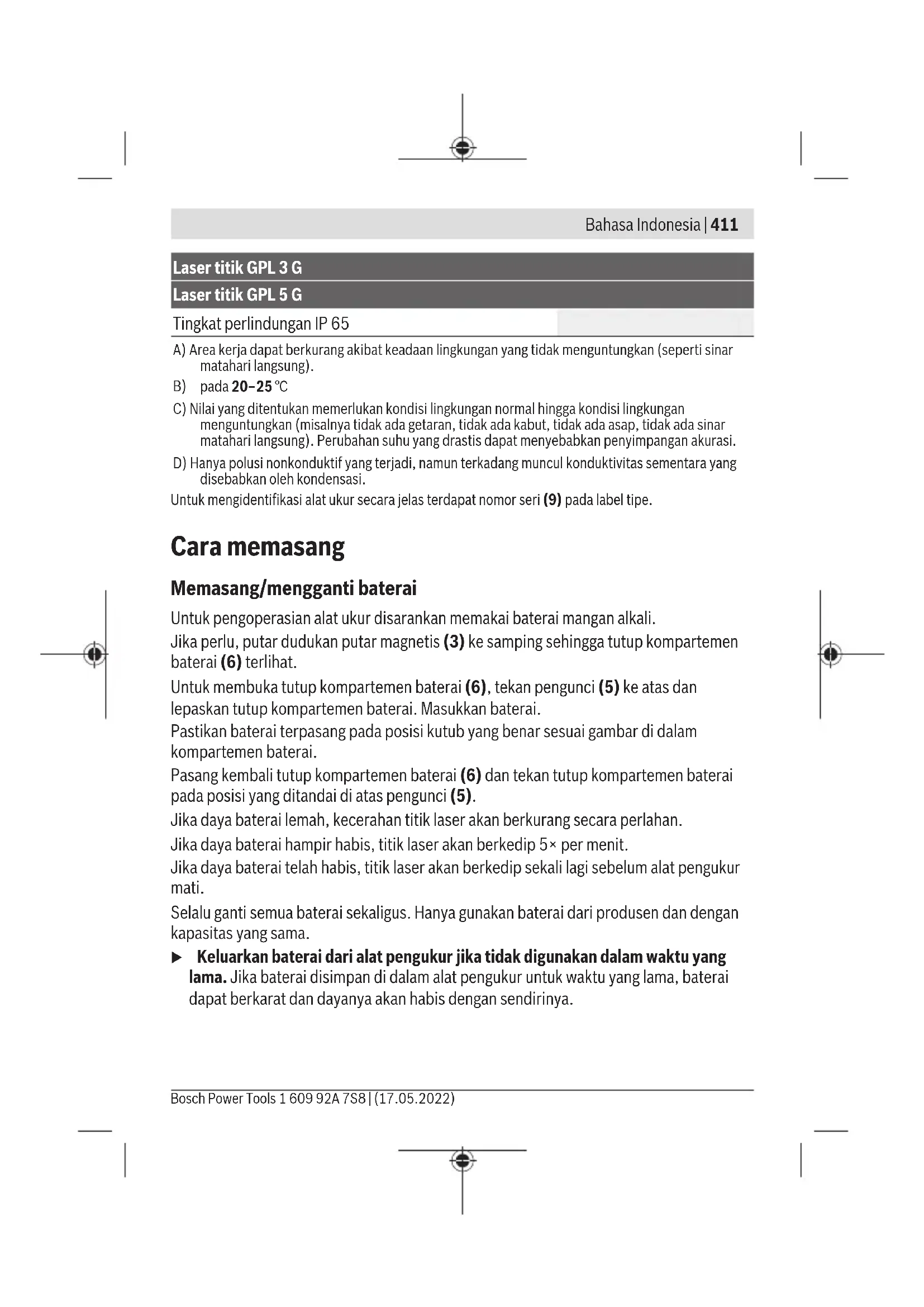 pada 20–25°C C) Nilai yang ditentukan memerlukan kondisi lingkungan normal hingga kondisi lingkungan menguntungkan (misalnya tidak ada getaran, tidak ada kabut, tidak ada asap, tidak ada sinar matahari langsung). Perubahan suhu yang drastis dapat menyebabkan penyimpangan akurasi. D) Hanya polusi nonkonduktif yang terjadi, namun terkadang muncul konduktivitas sementara yang disebabkan oleh kondensasi. Untuk mengidentifikasi alat ukur secara jelas terdapat nomor seri (9) pada label tipe. Cara memasang Memasang/mengganti baterai Untuk pengoperasian alat ukur disarankan memakai baterai mangan alkali. Jika perlu, putar dudukan putar magnetis(3) ke samping sehingga tutup kompartemen baterai(6) terlihat. Untuk membuka tutup kompartemen baterai (6), tekan pengunci (5) ke atas dan lepaskan tutup kompartemen baterai. Masukkan baterai. Pastikan baterai terpasang pada posisi kutub yang benar sesuai gambar di dalam kompartemen baterai. Pasang kembali tutup kompartemen baterai (6) dan tekan tutup kompartemen baterai pada posisi yang ditandai di atas pengunci (5). Jika daya baterai lemah, kecerahan titik laser akan berkurang secara perlahan. Jika daya baterai hampir habis, titik laser akan berkedip 5× per menit. Jika daya baterai telah habis, titik laser akan berkedip sekali lagi sebelum alat pengukur mati. Selalu ganti semua baterai sekaligus. Hanya gunakan baterai dari produsen dan dengan kapasitas yang sama. u Keluarkan baterai dari alat pengukur jika tidak digunakan dalam waktu yang lama. Jika baterai disimpan di dalam alat pengukur untuk waktu yang lama, baterai dapat berkarat dan dayanya akan habis dengan sendirinya. Bosch Power Tools 1 609 92A 7S8 | (17.05.2022)412 | Bahasa Indonesia Penggunaan Cara penggunaan u Lindungilah alat ukur dari cairan dan sinar matahari langsung. u Jauhkan alat pengukur dari suhu atau perubahan suhu yang ekstrem. Jangan biarkan alat pengukur berada terlalu lama di dalam kendaraan. Saat perubahan suhu besar, biarkan alat ukur menyesuaikan suhu lingkungan terlebih dulu dan selalu lakukan pemeriksaan akurasi sebelum melanjutkan pekerjaan dengan (lihat „Pemeriksaan keakuratan alat ukur“, Halaman413). Pada suhu atau perubahan suhu ekstrem, ketepatan alat pengukur dapat terganggu. u Hindari guncangan atau benturan yang keras pada alat ukur. Apabila setelah terjadi pengaruh eksternal yang kuat pada alat ukur, disarankan untuk memeriksa akurasi alat ukur sebelum digunakan kembali (lihat „Pemeriksaan keakuratan alat ukur“, Halaman413). u Matikan alat ukur saat memindahkan. Jika alat ukur dimatikan, unit pendulum akan terkunci yang dapat rusak jika terkena guncangan. Mengaktifkan/menonaktifkan perkakas listrik Untuk menyalakan alat pengukur, geser tombol on/off (2) ke posisi ON. Alat pengukur segera mengeluarkan sinar laser dari outlet sinar laser (1) begitu dinyalakan. u Jangan mengarahkan sinar laser pada orang lain atau binatang dan jangan melihat ke sinar laser, juga tidak dari jarak jauh. Untuk mematikan alat pengukur, geser tombol on/off (2) ke posisi OFF. Unit pendulum akan terkunci ketika alat pengukur dimatikan. u Jangan biarkan alat ukur yang aktif berada di luar pengawasan dan matikan alat ukur setelah digunakan. Sinar laser dapat menyilaukan mata orang lain. Saat suhu pengoperasian melebihi batas maksimum yang diperbolehkan sebesar 45°C, alat akan mati untuk melindungi dioda laser. Setelah alat pengukur menjadi dingin, alat pengukur siap dipakai dan bisa dihidupkan kembali. Penonaktifan otomatis Alat pengukur mati secara otomatis setelah 60menit pengoperasian. Penonaktifan otomatis akan diatur ulang pada 60menit apabila alat pengukur yang dihidupkan berada di luar area perataan otomatis (titik laser berkedip terus-menerus). Levelling otomatis Pasang alat pengukur pada permukaan yang datar dan stabil atau kencangkan pada tripod(11). 1 609 92A 7S8 | (17.05.2022) Bosch Power ToolsBahasa Indonesia | 413 Untuk penggunaan titik laser bawah, putar alat pengukur pada dudukan putar magnetis(3) sehingga titik laser dapat terlihat di atas permukaan lantai. Setelah dihidupkan, perataan otomatis akan menyeimbangkan keadaan yang tidak rata di dalam area perataan otomatis sebesar ±4° secara otomatis. Perataan selesai begitu titik laser menyala terus-menerus dan tidak lagi bergerak. Jika perataan otomatis tidak dapat dilakukan, misalnya karena permukaan posisi alat pengukur menyimpang lebih dari 4° dari posisi horizontal, titik laser akan berkedip terus- menerus dalam tempo yang cepat. Pada situasi tersebut, letakkan alat pengukur secara horizontal dan tunggu hingga perataan otomatis dimulai. Titik laser akan menyala terus-menerus begitu alat pengukur berada di dalam area perataan otomatis sebesar ±4°. Jika selama pengoperasian, alat pengukur mengalami guncangan atau dipindahkan, alat pengukur akan melakukan perataan secara otomatis. Setelah perataan ulang dilakukan, periksa posisi dari titik laser horizontal atau vertikal terkait titik acuannya untuk menghindari terjadinya kesalahan akibat alat pengukur bergeser. Pemeriksaan keakuratan alat ukur Pengaruh terhadap ketelitian Suhu sekitar memberikan pengaruh terbesar. Khususnya perbedaan suhu dari tanah ke atas dapat mempengaruhi sinar laser. Berhubung perbedaan dari lapisan-lapisan suhu di dekat tanah paling besar, alat ukur mulai jarak pengukuran sebesar 20 m sebaiknya selalu dipasang pada tripod. Selain itu alat ukur sebaiknya dipasang di bagian tengah permukaan kerja. Selain pengaruh dari luar, pengaruh khusus perangkat juga dapat menyebabkan kerusakan (seperti misalnya benturan atau guncangan keras). Oleh karena itu, periksa ketepatan levelling terlebih dahulu sebelum memulai proses. Jika pada pemeriksaan akurasi ternyata hasil pengukuran melebihi ambang batas maksimal, bawa alat pengukur ke Service Center Bosch untuk reparasi. Memeriksa akurasi perataan horizontal Untuk melakukan pemeriksaan ini diperlukan jarak kosong sepanjang 5m pada permukaan yang stabil di antara dua dinding A dan B. – Pasang alat peng