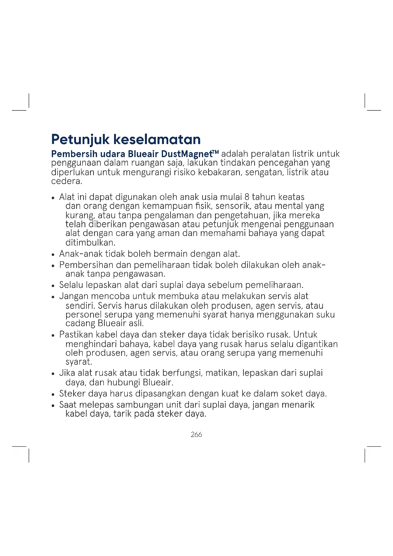 - Jangan mencoba untuk membuka atau melakukan servis alat sendiri. Servis harus dilakukan oleh produsen, agen servis, atau personel serupa yang memenuhi syarat hanya menggunakan suku cadang Blueair asli.