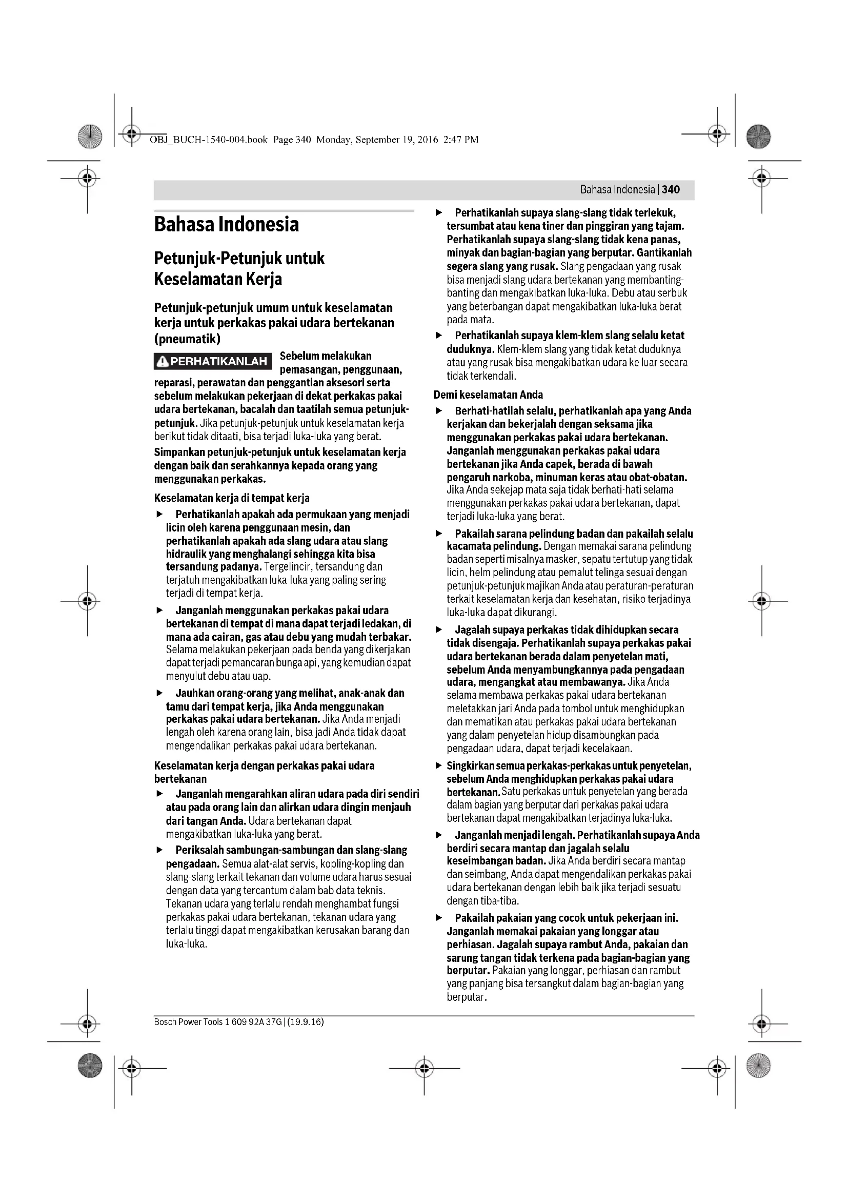 OBJ_BUCH-1540-004.book Page 339 Monday, September 19, 2016 2:47 PMBahasa Indonesia | 340 Bosch Power Tools 1 609 92A 37G | (19.9.16) Bahasa Indonesia Petunjuk-Petunjuk untuk Keselamatan Kerja Petunjuk-petunjuk umum untuk keselamatan kerja untuk perkakas pakai udara bertekanan (pneumatik) Sebelum melakukan pemasangan, penggunaan, reparasi, perawatan dan penggantian aksesori serta sebelum melakukan pekerjaan di dekat perkakas pakai udara bertekanan, bacalah dan taatilah semua petunjuk- petunjuk. Jika petunjuk-petunjuk untuk keselamatan kerja berikut tidak ditaati, bisa terjadi luka-luka yang berat. Simpankan petunjuk-petunjuk untuk keselamatan kerja dengan baik dan serahkannya kepada orang yang menggunakan perkakas. Keselamatan kerja di tempat kerja Perhatikanlah apakah ada permukaan yang menjadi licin oleh karena penggunaan mesin, dan perhatikanlah apakah ada slang udara atau slang hidraulik yang menghalangi sehingga kita bisa tersandung padanya. Tergelincir, tersandung dan terjatuh mengakibatkan luka-luka yang paling sering terjadi di tempat kerja. Janganlah menggunakan perkakas pakai udara bertekanan di tempat di mana dapat terjadi ledakan, di mana ada cairan, gas atau debu yang mudah terbakar. Selama melakukan pekerjaan pada benda yang dikerjakan dapat terjadi pemancaran bunga api, yang kemudian dapat menyulut debu atau uap. Jauhkan orang-orang yang melihat, anak-anak dan tamu dari tempat kerja, jika Anda menggunakan perkakas pakai udara bertekanan. Jika Anda menjadi lengah oleh karena orang lain, bisa jadi Anda tidak dapat mengendalikan perkakas pakai udara bertekanan. Keselamatan kerja dengan perkakas pakai udara bertekanan Janganlah mengarahkan aliran udara pada diri sendiri atau pada orang lain dan alirkan udara dingin menjauh dari tangan Anda. Udara bertekanan dapat mengakibatkan luka-luka yang berat. Periksalah sambungan-sambungan dan slang-slang pengadaan. Semua alat-alat servis, kopling-kopling dan slang-slang terkait tekanan dan volume udara harus sesuai dengan data yang tercantum dalam bab data teknis. Tekanan udara yang terlalu rendah menghambat fungsi perkakas pakai udara bertekanan, tekanan udara yang terlalu tinggi dapat mengakibatkan kerusakan barang dan luka-luka. Perhatikanlah supaya slang-slang tidak terlekuk, tersumbat atau kena tiner dan pinggiran yang tajam. Perhatikanlah supaya slang-slang tidak kena panas, minyak dan bagian-bagian yang berputar. Gantikanlah segera slang yang rusak. Slang pengadaan yang rusak bisa menjadi slang udara bertekanan yang membanting- banting dan mengakibatkan luka-luka. Debu atau serbuk yang beterbangan dapat mengakibatkan luka-luka berat pada mata. Perhatikanlah supaya klem-klem slang selalu ketat duduknya. Klem-klem slang yang tidak ketat duduknya atau yang rusak bisa mengakibatkan udara ke luar secara tidak terkendali. Demi keselamatan Anda Berhati-hatilah selalu, perhatikanlah apa yang Anda kerjakan dan bekerjalah dengan seksama jika menggunakan perkakas pakai udara bertekanan. Janganlah menggunakan perkakas pakai udara bertekanan jika Anda capek, berada di bawah pengaruh narkoba, minuman keras atau obat-obatan. Jika Anda sekejap mata saja tidak berhati-hati selama menggunakan perkakas pakai udara bertekanan, dapat terjadi luka-luka yang berat. Pakailah sarana pelindung badan dan pakailah selalu kacamata pelindung. Dengan memakai sarana pelindung badan seperti misalnya masker, sepatu tertutup yang tidak licin, helm pelindung atau pemalut telinga sesuai dengan petunjuk-petunjuk majikan Anda atau peraturan-peraturan terkait keselamatan kerja dan kesehatan, risiko terjadinya luka-luka dapat dikurangi. Jagalah supaya perkakas tidak dihidupkan secara tidak disengaja. Perhatikanlah supaya perkakas pakai udara bertekanan berada dalam penyetelan mati, sebelum Anda menyambungkannya pada pengadaan udara, mengangkat atau membawanya. Jika Anda selama membawa perkakas pakai udara bertekanan meletakkan jari Anda pada tombol untuk menghidupkan dan mematikan atau perkakas pakai udara bertekanan yang dalam penyetelan hidup disambungkan pada pengadaan udara, dapat terjadi kecelakaan.