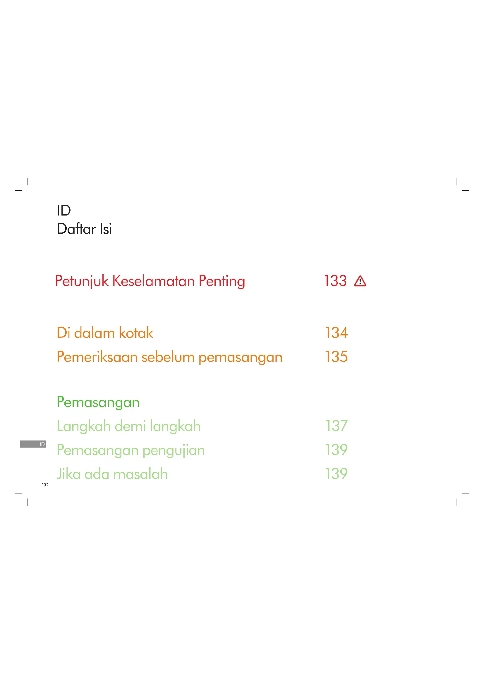 Petunjuk Keselamatan Penting Di dalam kotak Pemeriksaan sebelum pemasangan Pemasangan Langkah demi langkah Pemasangan pengujian Jika ada masalah
