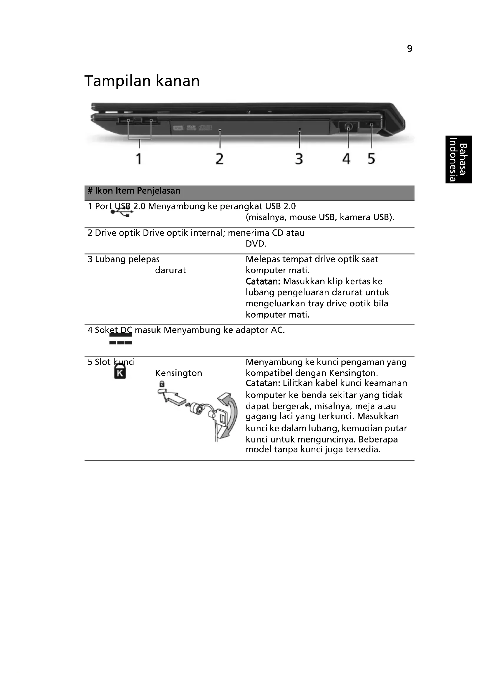 biru bila dalam mode AC. 2 Pembaca kartu Multi-in-1 Menerima Secure Digital (SD), MultiMediaCard (MMC), Memory Stick (MS), Memory Stick Pro (MS PRO), xD-Picture Card (xD). Catatan: Tekan untuk melepas/ memasang kartu. Hanya satu kartu yang bisa beroperasi saat Anda menggunakannya. # Ikon Item Penjelasan 1 Tempat baterai Untuk memasang unit baterai komputer.8 Bahasa Indonesia Tampilan kiri # Ikon Item Penjelasan 1 Port Ethernet (RJ-45) Tersambung ke jaringan berbasis Ethernet 10/100/1000. 2 Slot ventilasi Membuat komputer tetap dingin, sekalipun digunakan pada waktu yang lama. 3 Konektor Acer EasyPort IV Menghubungkan ke Acer EasyPort IV. 4 Port layar ekternal (VGA) Menghubungkan perangkat tampilan (mis., monitor eksternal, proyektor LCD). 5 Port USB 2.0 Menyambung ke perangkat USB 2.0 (misalnya, mouse USB, kamera USB). 6 Soket masuk mikrofon Menerima input dari mikrofon eksternal. Jack headphones/ pengeras suara/ line-out Menyambung ke perangkat sambungan keluar audio (misalnya, speaker, headphone).9 Bahasa Indonesia Tampilan kanan # Ikon Item Penjelasan 1 Port USB 2.0 Menyambung ke perangkat USB 2.0 (misalnya, mouse USB, kamera USB). 2 Drive optik Drive optik internal; menerima CD atau DVD. 3 Lubang pelepas darurat Melepas tempat drive optik saat komputer mati. Catatan: Masukkan klip kertas ke lubang pengeluaran darurat untuk mengeluarkan tray drive optik bila komputer mati. 4 Soket DC masuk Menyambung ke adaptor AC. 5 Slot kunci Kensington Menyambung ke kunci pengaman yang kompatibel dengan Kensington. Catatan: Lilitkan kabel kunci keamanan komputer ke benda sekitar yang tidak dapat bergerak, misalnya, meja atau gagang laci yang terkunci. Masukkan kunci ke dalam lubang, kemudian putar kunci untuk menguncinya. Beberapa model tanpa kunci juga tersedia.10 Bahasa Indonesia Tampilan bawah # Ikon Item Penjelasan 1 Tempat baterai Untuk memasang unit baterai komputer. 2 Pengunci baterai Mengunci baterai pada tempatnya. 3 Tempat memori Untuk memasang memori utama komputer. 4 Bay hard disk Untuk memasang hard disk komputer (dipasang dengan sekrup). 5 Lubang ventilasi dan kipas pendingin Membuat komputer tetap dingin, sekalipun digunakan pada waktu yang lama. Catatan: Jangan tutupi atau halangi celah kipas. 6 Kait pelepas baterai Untuk melepas baterai agar dapat dikeluarkan. 7 Pengait pelepas Acer MediaBay Mengunci atau membuka penguncian perangkat Acer MediaBay (hanya untuk model-model tertentu).11 Bahasa Indonesia Lingkungan