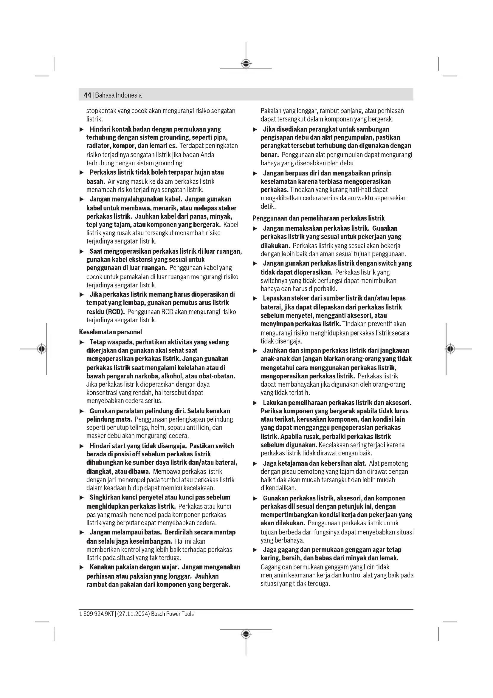 แบตเตอรี่แพ็ค/แบตเตอรี่: ลิเธียม ไอออน: กรุณาปฏิบัติตามคำแนะนำในบทการขนส่ง (ดู "การขนส่ง", หน้า43) Bahasa Indonesia Petunjuk Keselamatan Petunjuk keselamatan umum untuk perkakas listrik PERINGATAN Baca semua peringatan, petunjuk, ilustrasi, dan spesifikasi keselamatan yang diberikan bersama perkakas listrik ini. Kesalahan dalam menjalankan petunjuk di bawah ini dapat mengakibatkan sengatan listrik, kebakaran, dan/atau cedera serius. Simpanlah semua peringatan dan petunjuk untuk penggunaan di masa mendatang. Istilah "perkakas listrik" dalam peringatan mengacu pada perkakas listrik yang dioperasikan dengan listrik (menggunakan kabel) atau perkakas listrik yang dioperasikan dengan baterai (tanpa kabel). Keamanan tempat kerja u Jaga kebersihan dan pencahayaan area kerja. Area yang berantakan atau gelap dapat memicu kecelakaan. u Jangan mengoperasikan perkakas listrik di lingkungan yang dapat memicu ledakan, seperti adanya cairan, gas, atau debu yang mudah terbakar. Perkakas listrik dapat memancarkan bunga api yang kemudian mengakibatkan debu atau uap terbakar. u Jauhkan dari jangkauan anak-anak dan pengamat saat mengoperasikan perkakas listrik. Gangguan dapat menyebabkan hilangnya kendali. Keamanan listrik u Steker perkakas listrik harus sesuai dengan stopkontak. Jangan pernah memodifikasi steker. Jangan menggunakan steker adaptor bersama dengan perkakas listrik yang terhubung dengan sistem grounding. Steker yang tidak dimodifikasi dan Bosch Power Tools 1 609 92A 9KT | (27.11.2024)44 | Bahasa Indonesia stopkontak yang cocok akan mengurangi risiko sengatan listrik. u Hindari kontak badan dengan permukaan yang terhubung dengan sistem grounding, seperti pipa, radiator, kompor, dan lemari es. Terdapat peningkatan risiko terjadinya sengatan listrik jika badan Anda terhubung dengan sistem grounding. u Perkakas listrik tidak boleh terpapar hujan atau basah. Air yang masuk ke dalam perkakas listrik menambah risiko terjadinya sengatan listrik. u Jangan menyalahgunakan kabel. Jangan gunakan kabel untuk membawa, menarik, atau melepas steker perkakas listrik. Jauhkan kabel dari panas, minyak, tepi yang tajam, atau komponen yang bergerak. Kabel listrik yang rusak atau tersangkut menambah risiko terjadinya sengatan listrik. u Saat mengoperasikan perkakas listrik di luar ruangan, gunakan kabel ekstensi yang sesuai untuk penggunaan di luar ruangan. Penggunaan kabel yang cocok untuk pemakaian di luar ruangan mengurangi risiko terjadinya sengatan listrik. u Jika perkakas listrik memang harus dioperasikan di tempat yang lembap, gunakan pemutus arus listrik residu (RCD). Penggunaan RCD akan mengurangi risiko terjadinya sengatan listrik. Keselamatan personel u Tetap waspada, perhatikan aktivitas yang sedang dikerjakan dan gunakan akal sehat saat mengoperasikan perkakas listrik. Jangan gunakan perkakas listrik saat mengalami kelelahan atau di bawah pengaruh narkoba, alkohol, atau obat-obatan. Jika perkakas listrik dioperasikan dengan daya konsentrasi yang rendah, hal tersebut dapat menyebabkan cedera serius. u Gunakan peralatan pelindung diri. Selalu kenakan pelindung mata. Penggunaan perlengkapan pelindung seperti penutup telinga, helm, sepatu anti licin, dan masker debu akan mengurangi cedera. u Hindari start yang tidak disengaja. Pastikan switch berada di posisi off sebelum perkakas listrik dihubungkan ke sumber daya listrik dan/atau baterai, diangkat, atau dibawa. Membawa perkakas listrik dengan jari menempel pada tombol atau perkakas listrik dalam keadaan hidup dapat memicu kecelakaan. u Singkirkan kunci penyetel atau kunci pas sebelum menghidupkan perkakas listrik. Perkakas atau kunci pas yang masih menempel pada komponen perkakas listrik yang berputar dapat menyebabkan cedera. u Jangan melampaui batas. Berdirilah secara mantap dan selalu jaga keseimbangan. Hal ini akan memberikan kontrol yang lebih baik terhadap perkakas listrik pada situasi yang tak terduga. u Kenakan pakaian dengan wajar. Jangan mengenakan perhiasan atau pakaian yang longgar. Jauhkan rambut dan pakaian dari komponen yang bergerak. Pakaian yang longgar, rambut panjang, atau perhiasan dapat tersangkut dalam komponen yang bergerak. u Jika disediakan perangkat untuk sambungan pengisapan debu dan alat pengumpulan, pastikan perangkat tersebut terhubung dan digunakan dengan benar. Penggunaan alat pengumpulan dapat mengurangi bahaya yang disebabkan oleh debu. u Jangan berpuas diri dan mengabaikan prinsip keselamatan karena terbiasa mengoperasikan perkakas. Tindakan yang kurang hati-hati dapat mengakibatkan cedera serius dalam waktu sepersekian detik. Penggunaan dan pemeliharaan perkakas listrik u Jangan memaksakan perkakas listrik. Gunakan perkakas listrik yang sesuai untuk pekerjaan yang dilakukan. Perkakas listrik yang sesuai akan bekerja dengan lebih baik dan aman sesuai tujuan penggunaan. u Jangan gunakan perkakas listrik dengan switch yang tidak dapat dioperasikan. Perkakas listrik yang switchnya yang tidak berfungsi dapat menimbulkan bahaya dan harus diperbaiki. u Lepaskan steker dari sumber listrik dan/atau lepas baterai, jika dapat dilepaskan dari perkakas listrik sebelum menyetel, mengganti aksesori, atau menyimpan perkakas listrik. Tindakan preventif akan mengurangi risiko menghidupkan perkakas listrik secara tidak disengaja. u Jauhkan dan simpan perkakas listrik dari jangkauan anak-anak dan jangan biarkan orang-orang yang tidak mengetahui cara menggunakan perkakas listrik, mengoperasikan perkakas listrik. Perkakas listrik dapat membahayakan jika digunakan oleh orang-orang yang tidak terlatih. u Lakukan pemeliharaan perkakas listrik dan aksesori. Periksa komponen yang bergerak apabila tidak lurus atau terikat, kerusakan komponen, dan kondisi lain yang dapat mengganggu pengoperasian perkakas listrik. Apabila rusak, perbaiki perkakas listrik sebelum digunakan. Kecelakaan serin