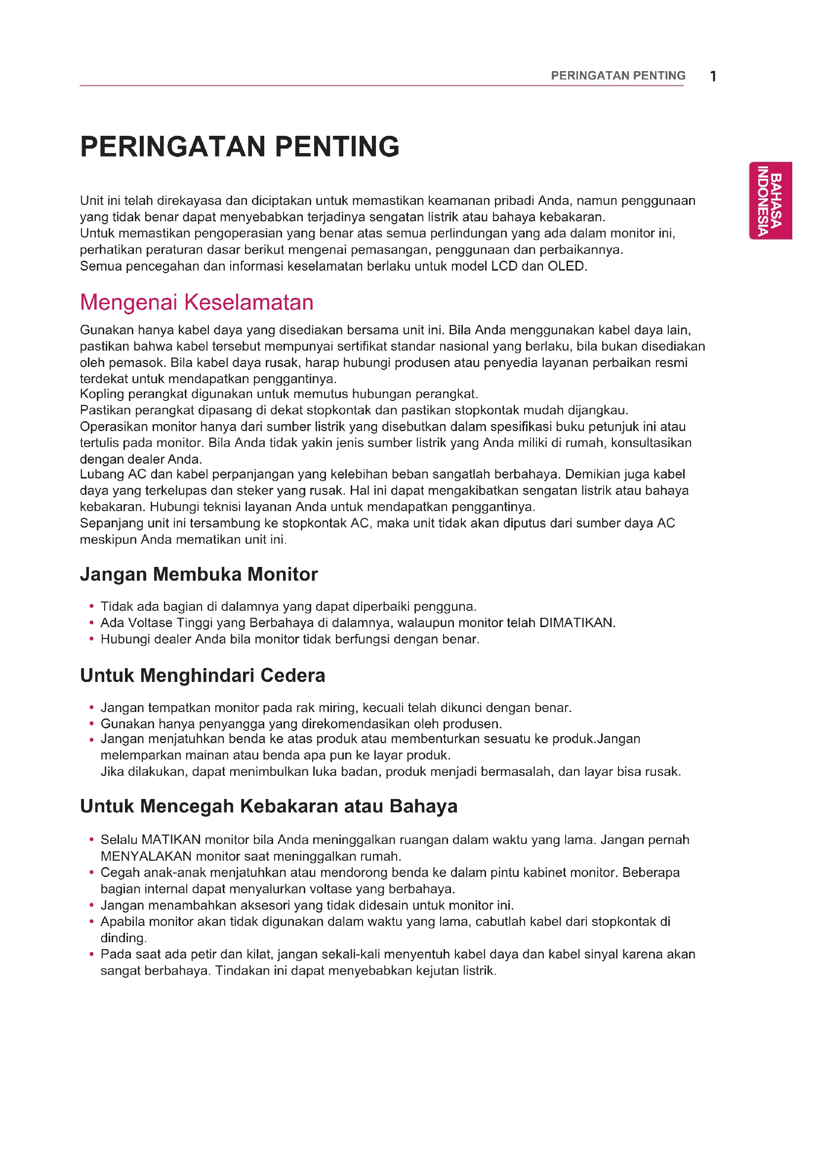 PERINGATAN PENTING Unit ini telah direkayasa dan diciptakan untuk memastikan keamanan pribadi Anda, namun penggunaan yang tidak benar dapat menyebabkan terjadinya sengatan listrik atau bahaya kebakaran.Untuk memastikan pengoperasian yang benar atas semua perlindungan yang ada dalam monitor ini, perhatikan peraturan dasar berikut mengenai pemasangan, penggunaan dan perbaikannya. Semua pencegahan dan informasi keselamatan berlaku untuk model LCD dan OLED. Mengenai Keselamatan Gunakan hanya kabel daya yang disediakan bersama unit ini. Bila Anda menggunakan kabel daya lain, pastikan bahwa kabel tersebut mempunyai sertifikat standar nasional yang berlaku, bila bukan disediakan oleh pemasok. Bila kabel daya rusak, harap hubungi produsen atau penyedia layanan perbaikan resmi terdekat untuk mendapatkan penggantinya.Kopling perangkat digunakan untuk memutus hubungan perangkat.Pastikan perangkat dipasang di dekat stopkontak dan pastikan stopkontak mudah dijangkau.Operasikan monitor hanya dari sumber listrik yang disebutkan dalam spesifikasi buku petunjuk ini atau tertulis pada monitor. Bila Anda tidak yakin jenis sumber listrik yang Anda miliki di rumah, konsultasikan dengan dealer Anda.Lubang AC dan kabel perpanjangan yang kelebihan beban sangatlah berbahaya. Demikian juga kabel daya yang terkelupas dan steker yang rusak. Hal ini dapat mengakibatkan sengatan listrik atau bahaya kebakaran. Hubungi teknisi layanan Anda untuk mendapatkan penggantinya.Sepanjang unit ini tersambung ke stopkontak AC, maka unit tidak akan diputus dari sumber daya AC meskipun Anda mematikan unit ini. Jangan Membuka Monitor
