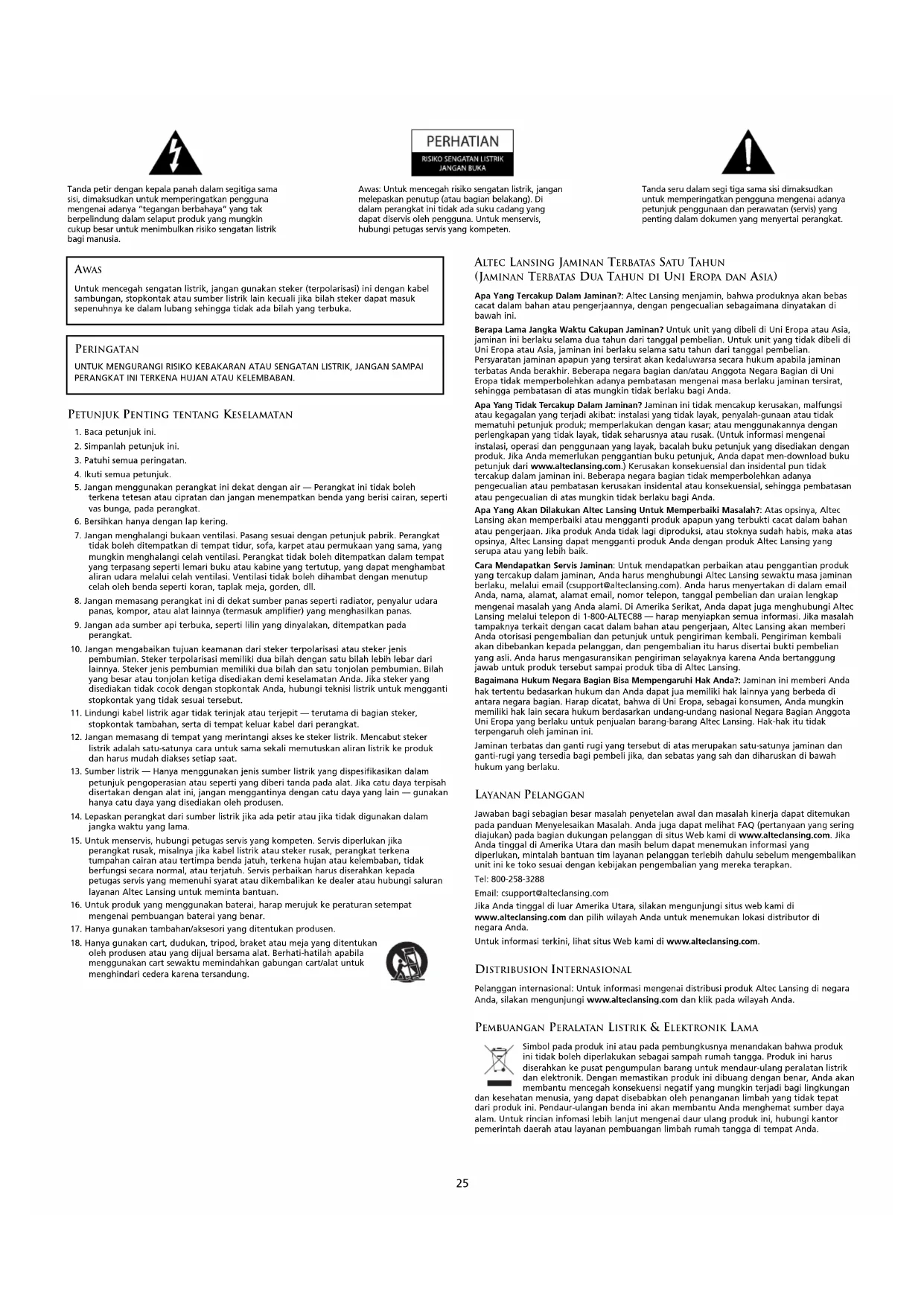 (JAMINAN TERBATAS DUA TAHUN DI UNI EROPA DAN ASIA) Apa Yang Tercakup Dalam Jaminan?: Altec Lansing menjamin, bahwa produknya akan bebas cacat dalam bahan atau pengerjaannya, dengan pengecualian sebagaimana dinyatakan di bawah ini. Berapa Lama Jangka Waktu Cakupan Jaminan? Untuk unit yang dibeli di Uni Eropa atau Asia, jaminan ini berlaku selama dua tahun dari tanggal pembelian. Untuk unit yang tidak dibeli di Uni Eropa atau Asia, jaminan ini berlaku selama satu tahun dari tanggal pembelian. Persyaratan jaminan apapun yang tersirat akan kedaluwarsa secara hukum apabila jaminan terbatas Anda berakhir. Beberapa negara bagian dan/atau Anggota Negara Bagian di Uni Eropa tidak memperbolehkan adanya pembatasan mengenai masa berlaku jaminan tersirat, sehingga pembatasan di atas mungkin tidak berlaku bagi Anda. Apa Yang Tidak Tercakup Dalam Jaminan? Jaminan ini tidak mencakup kerusakan, malfungsi atau kegagalan yang terjadi akibat: instalasi yang tidak layak, penyalah-gunaan atau tidak mematuhi petunjuk produk; memperlakukan dengan kasar; atau menggunakannya dengan perlengkapan yang tidak layak, tidak seharusnya atau rusak. (Untuk informasi mengenai instalasi, operasi dan penggunaan yang layak, bacalah buku petunjuk yang disediakan dengan produk. Jika Anda memerlukan penggantian buku petunjuk, Anda dapat men-download buku petunjuk dari www.alteclansing.com.) Kerusakan konsekuensial dan insidental pun tidak tercakup dalam jaminan ini. Beberapa negara bagian tidak memperbolehkan adanya pengecualian atau pembatasan kerusakan insidental atau konsekuensial, sehingga pembatasan atau pengecualian di atas mungkin tidak berlaku bagi Anda. Apa Yang Akan Dilakukan Altec Lansing Untuk Memperbaiki Masalah?: Atas opsinya, Altec Lansing akan memperbaiki atau mengganti produk apapun yang terbukti cacat dalam bahan atau pengerjaan. Jika produk Anda tidak lagi diproduksi, atau stoknya sudah habis, maka atas opsinya, Altec Lansing dapat mengganti produk Anda dengan produk Altec Lansing yang serupa atau yang lebih baik. Cara Mendapatkan Servis Jaminan: Untuk mendapatkan perbaikan atau penggantian produk yang tercakup dalam jaminan, Anda harus menghubungi Altec Lansing sewaktu masa jaminan berlaku, melalui email (csupport@alteclansing.com). Anda harus menyertakan di dalam email Anda, nama, alamat, alamat email, nomor telepon, tanggal pembelian dan uraian lengkap mengenai masalah yang Anda alami. Di Amerika Serikat, Anda dapat juga menghubungi Altec Lansing melalui telepon di 1-800-ALTEC88 — harap menyiapkan semua informasi. Jika masalah tampaknya terkait dengan cacat dalam bahan atau pengerjaan, Altec Lansing akan memberi Anda otorisasi pengembalian dan petunjuk untuk pengiriman kembali. Pengiriman kembali akan dibebankan kepada pelanggan, dan pengembalian itu harus disertai bukti pembelian yang asli. Anda harus mengasuransikan pengiriman selayaknya karena Anda bertanggung jawab untuk produk tersebut sampai produk tiba di Altec Lansing. Bagaimana Hukum Negara Bagian Bisa Mempengaruhi Hak Anda?: Jaminan ini memberi Anda hak tertentu bedasarkan hukum dan Anda dapat jua memiliki hak lainnya yang berbeda di antara negara bagian. Harap dicatat, bahwa di Uni Eropa, sebagai konsumen, Anda mungkin memiliki hak lain secara hukum berdasarkan undang-undang nasional Negara Bagian Anggota Uni Eropa yang berlaku untuk penjualan barang-barang Altec Lansing. Hak-hak itu tidak terpengaruh oleh jaminan ini. Jaminan terbatas dan ganti rugi yang tersebut di atas merupakan satu-satunya jaminan dan ganti-rugi yang tersedia bagi pembeli jika, dan sebatas yang sah dan diharuskan di bawah hukum yang berlaku. LAYANAN PELANGGAN Jawaban bagi sebagian besar masalah penyetelan awal dan masalah kinerja dapat ditemukan pada panduan Menyelesaikan Masalah. Anda juga dapat melihat FAQ (pertanyaan yang sering diajukan) pada bagian dukungan pelanggan di situs Web kami di www.alteclansing.com. Jika Anda tinggal di Amerika Utara dan masih belum dapat menemukan informasi yang diperlukan, mintalah bantuan tim layanan pelanggan terlebih dahulu sebelum mengembalikan unit ini ke toko sesuai dengan kebijakan pengembalian yang mereka terapkan. Tel: 800-258-3288 Email: csupport@alteclansing.com Jika Anda tinggal di luar Amerika Utara, silakan mengunjungi situs web kami di www.alteclansing.com dan pilih wilayah Anda untuk menemukan lokasi distributor di negara Anda. Untuk informasi terkini, lihat situs Web kami di www.alteclansing.com. DISTRIBUSION INTERNASIONAL Pelanggan internasional: Untuk informasi mengenai distribusi produk Altec Lansing di negara Anda, silakan mengunjungi www.alteclansing.com dan klik pada wilayah Anda.