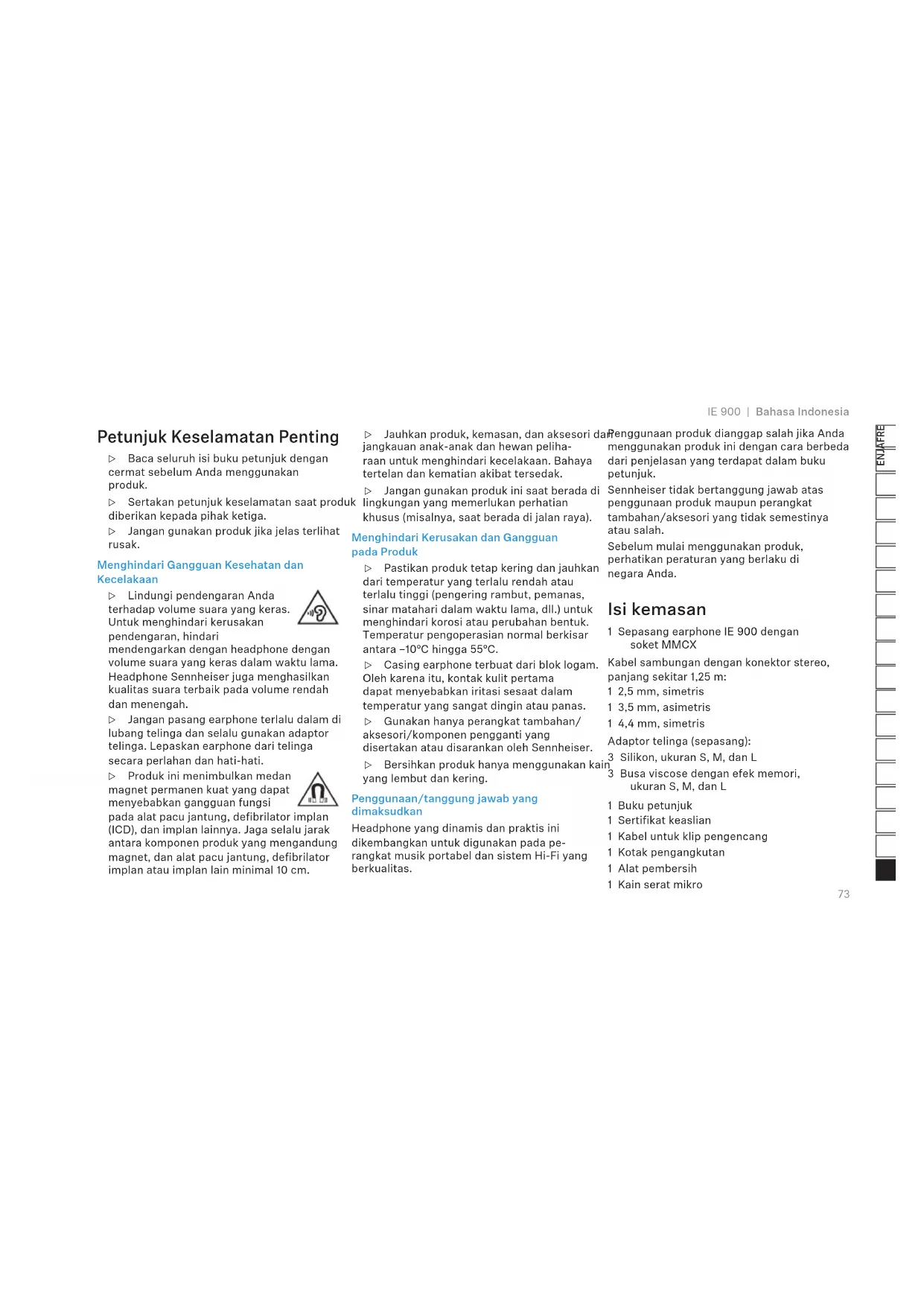 IE 900 | Bahasa Indonesia Petunjuk Keselamatan Penting ▷ Baca seluruh isi buku petunjuk dengan cermat sebelum Anda menggunakan produk. ▷ Sertakan petunjuk keselamatan saat produk diberikan kepada pihak ketiga. ▷ Jangan gunakan produk jika jelas terlihat rusak. Menghindari Gangguan Kesehatan dan Kecelakaan ▷ Lindungi pendengaran Anda terhadap volume suara yang keras. Untuk menghindari kerusakan pendengaran, hindari mendengarkan dengan headphone dengan volume suara yang keras dalam waktu lama. Headphone Sennheiser juga menghasilkan kualitas suara terbaik pada volume rendah dan menengah. ▷ Jangan pasang earphone terlalu dalam di lubang telinga dan selalu gunakan adaptor telinga. Lepaskan earphone dari telinga secara perlahan dan hati-hati. ▷ Produk ini menimbulkan medan magnet permanen kuat yang dapat menyebabkan gangguan fungsi pada alat pacu jantung, defibrilator implan (ICD), dan implan lainnya. Jaga selalu jarak antara komponen produk yang mengandung magnet, dan alat pacu jantung, defibrilator implan atau implan lain minimal 10 cm. ▷ Jauhkan produk, kemasan, dan aksesori dari jangkauan anak-anak dan hewan peliha- raan untuk menghindari kecelakaan. Bahaya tertelan dan kematian akibat tersedak. ▷ Jangan gunakan produk ini saat berada di lingkungan yang memerlukan perhatian khusus (misalnya, saat berada di jalan raya). Menghindari Kerusakan dan Gangguan pada Produk ▷ Pastikan produk tetap kering dan jauhkan dari temperatur yang terlalu rendah atau terlalu tinggi (pengering rambut, pemanas, sinar matahari dalam waktu lama, dll.) untuk menghindari korosi atau perubahan bentuk. Temperatur pengoperasian normal berkisar antara –10°C hingga 55°C. ▷ Casing earphone terbuat dari blok logam. Oleh karena itu, kontak kulit pertama dapat menyebabkan iritasi sesaat dalam temperatur yang sangat dingin atau panas. ▷ Gunakan hanya perangkat tambahan/ aksesori/komponen pengganti yang disertakan atau disarankan oleh Sennheiser. ▷ Bersihkan produk hanya menggunakan kain yang lembut dan kering. Penggunaan/tanggung jawab yang dimaksudkan Headphone yang dinamis dan praktis ini dikembangkan untuk digunakan pada pe- rangkat musik portabel dan sistem Hi-Fi yang berkualitas. Penggunaan produk dianggap salah jika Anda menggunakan produk ini dengan cara berbeda dari penjelasan yang terdapat dalam buku petunjuk. Sennheiser tidak bertanggung jawab atas penggunaan produk maupun perangkat tambahan/aksesori yang tidak semestinya atau salah. Sebelum mulai menggunakan produk, perhatikan peraturan yang berlaku di negara Anda. Isi kemasan 1 Sepasang earphone IE 900 dengan soket MMCX Kabel sambungan dengan konektor stereo, panjang sekitar 1,25 m: 1 2,5 mm, simetris 1 3,5 mm, asimetris 1 4,4 mm, simetris Adaptor telinga (sepasang): 3 Silikon, ukuran S, M, dan L 3 Busa viscose dengan efek memori, ukuran S, M, dan L 1 Buku petunjuk 1 Sertifikat keaslian 1 Kabel untuk klip pengencang 1 Kotak pengangkutan 1 Alat pembersih 1 Kain serat mikro74 Bahasa Indonesia | IE 900 Sennheiser IE 900 Anda Pencarian suara yang ideal adalah aspirasi terhadap kesempurnaan tanpa henti bagi pecinta musik dengan ekspektasi yang tinggi. Terinspirasi dari antusiasme ini, IE 900 adalah produk flagship baru dalam seri earphone praktis Sennheiser dan menetapkan standar baru dalam kualitas suara. Dari casing yang indah, melalui versi yang disempurnakan dari konverter XWB 7 mm yang diakui hingga karakteristik konduksi saluran suara: Setiap aspek sekecil apa pun diperhatikan selama pengembangan untuk membuat pengetahuan akustik Sennheiser yang luas terdengar dalam earphone praktis ini. Desain akustik baru ini dilengkapi dengan kumparan suara yang disempurnakan yang mengoptimalkan performa dalam frekuensi tinggi untuk suara yang jernih dan alami. Resonansi dan distorsi alami diminimalisir oleh foil membran yang dioptimalkan. Beberapa penyempurnaan adalah reproduksi suara yang sangat alami untuk memberikan sesuatu yang terbaik bagi penikmat audio dengan ekspektasi yang tinggi. IE 900 diproduksi oleh tim ahli dengan pengamatan toleransi produk yang ketat di pabrik utama Sennheiser di Jerman. Setiap konverter suara diuji sepenuhnya dua kali – baik secara satu per satu maupun bersamaan, setelah dipasang sisi kanan dan kiri earphone. Konverter suara dipilih dari sisi kanan dan kiri untuk disesuaikan satu sama lain secara optimal. Perhatian terhadap detail ini ditunjukkan dalam desain premium yang terinspirasi audio profesional. Setiap casing dibuat secara presisi dari blok aluminium berkualitas tinggi yang khusus untuk menjamin kualitas audio paling tinggi dan juga daya tahan yang luar biasa. IE 900 menawarkan konektivitas yang sangat baik dengan sambungan Fidelity