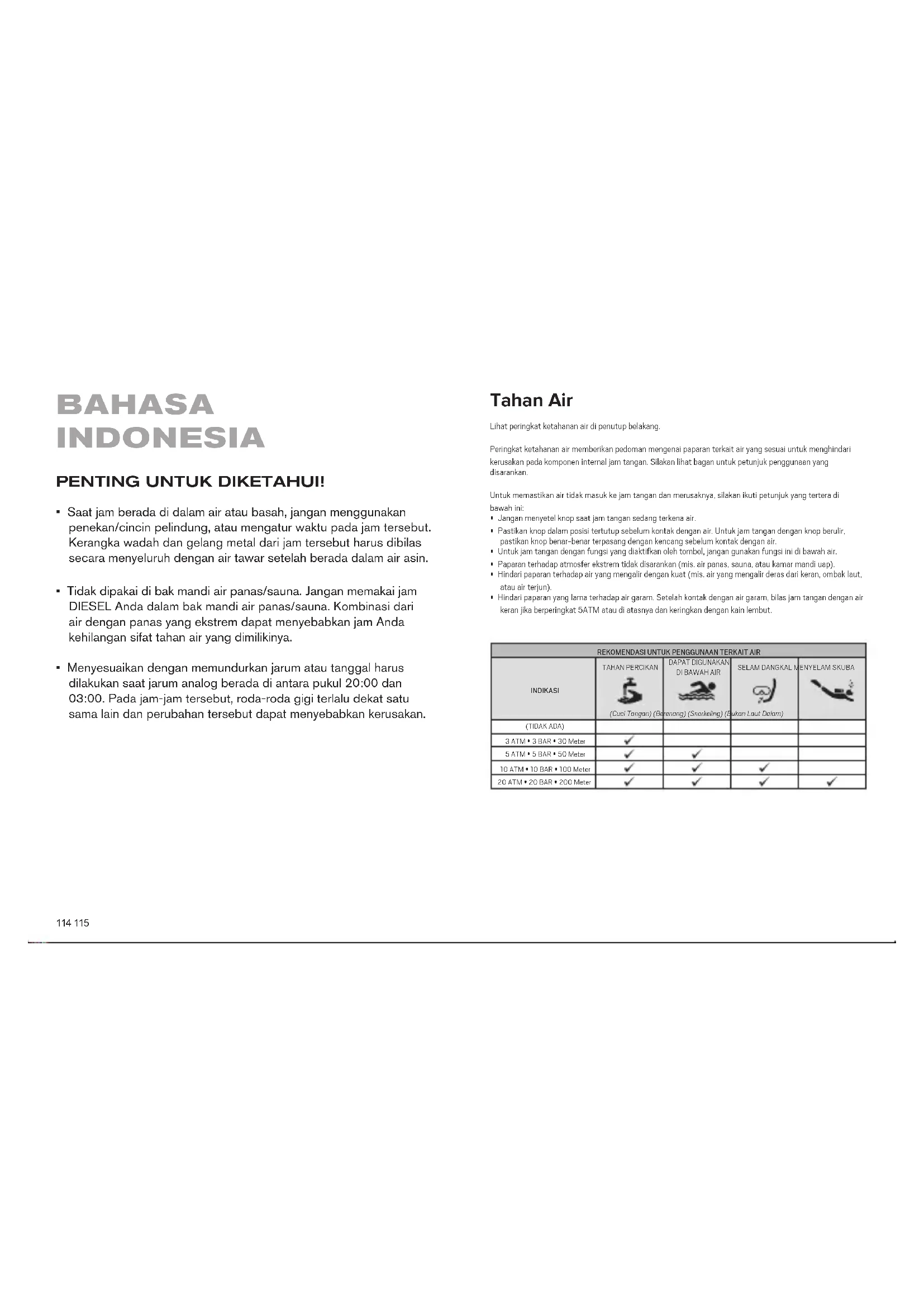 - Menyesuaikan dengan memundurkan jarum atau tanggal harus dilakukan saat jarum analog berada di antara pukul 20:00 dan 03:00. Pada jam-jam tersebut, roda-roda gigi terlalu dekat satu sama lain dan perubahan tersebut dapat menyebabkan kerusakan. Tahan Air Lihat peringkat ketahanan air di penutup belakang.Peringkat ketahanan air memberikan pedoman mengenai paparan terkait air yang sesuai untuk menghindari kerusakan pada komponen internal jam tangan. Silakan lihat bagan untuk petunjuk penggunaan yang disarankan.Untuk memastikan air tidak masuk ke jam tangan dan merusaknya, silakan ikuti petunjuk yang tertera di bawah ini:• Jangan menyetel knop saat jam tangan sedang terkena air.• Pastikan knop dalam posisi tertutup sebelum kontak dengan air. Untuk jam tangan dengan knop berulir, pastikan knop benar-benar terpasang dengan kencang sebelum kontak dengan air.• Untuk jam tangan dengan fungsi yang diaktifkan oleh tombol, jangan gunakan fungsi ini di bawah air.• Paparan terhadap atmosfer ekstrem tidak disarankan (mis. air panas, sauna, atau kamar mandi uap).• Hindari paparan terhadap air yang mengalir dengan kuat (mis. air yang mengalir deras dari keran, ombak laut, atau air terjun).• Hindari paparan yang lama terhadap air garam. Setelah kontak dengan air garam, bilas jam tangan dengan air keran jika berperingkat 5ATM atau di atasnya dan keringkan dengan kain lembut.REKOMENDASI UNTUK PENGGUNAAN TERKAIT AIRINDIKASITAHAN PERCIKANDAPAT DIGUNAKAN DI BAWAH AIRSELAM DANGKAL MENYELAM SKUBA(Cuci Tangan) (Berenang) (Snorkeling) (Bukan Laut Dalam)(TIDAK ADA)3 ATM • 3 BAR • 30 Meter5 ATM • 5 BAR • 50 Meter10 ATM • 10 BAR • 100 Meter20 ATM • 20 BAR • 200 Meter116 117 Jam Hari/Tanggal 2305 PENGATURAN TANGGAL