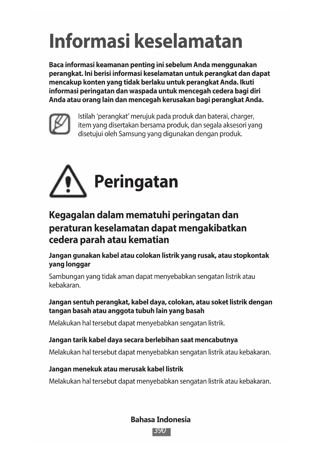 Informasi keselamatan Baca informasi keamanan penting ini sebelum Anda menggunakan perangkat. Ini berisi informasi keselamatan untuk perangkat dan dapat mencakup konten yang tidak berlaku untuk perangkat Anda. Ikuti informasi peringatan dan waspada untuk mencegah cedera bagi diri Anda atau orang lain dan mencegah kerusakan bagi perangkat Anda.Istilah ‘perangkat’ merujuk pada produk dan baterai, charger, item yang disertakan bersama produk, dan segala aksesori yang disetujui oleh Samsung yang digunakan dengan produk. Peringatan Kegagalan dalam mematuhi peringatan dan peraturan keselamatan dapat mengakibatkan cedera parah atau kematian Jangan gunakan kabel atau colokan listrik yang rusak, atau stopkontak yang longgarSambungan yang tidak aman dapat menyebabkan sengatan listrik atau kebakaran.Jangan sentuh perangkat, kabel daya, colokan, atau soket listrik dengan tangan basah atau anggota tubuh lain yang basahMelakukan hal tersebut dapat menyebabkan sengatan listrik.Jangan tarik kabel daya secara berlebihan saat mencabutnyaMelakukan hal tersebut dapat menyebabkan sengatan listrik atau kebakaran.Jangan menekuk atau merusak kabel listrikMelakukan hal tersebut dapat menyebabkan sengatan listrik atau kebakaran.Bahasa Indonesia