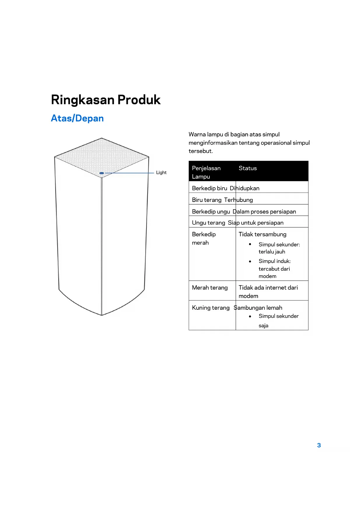 Dengan simpul tersambung ke daya dan dihidupkan, tekan terus tombol Reset pada bagian bawah. Lampu di bagian atas simpul akan berubah menjadi merah, dan pudar secara berkedip. Jangan lepaskan tombol hingga lampu mati lalu kemudian berubah menjadi merah terang.33 Spesifikasi Linksys Velop Nama Model