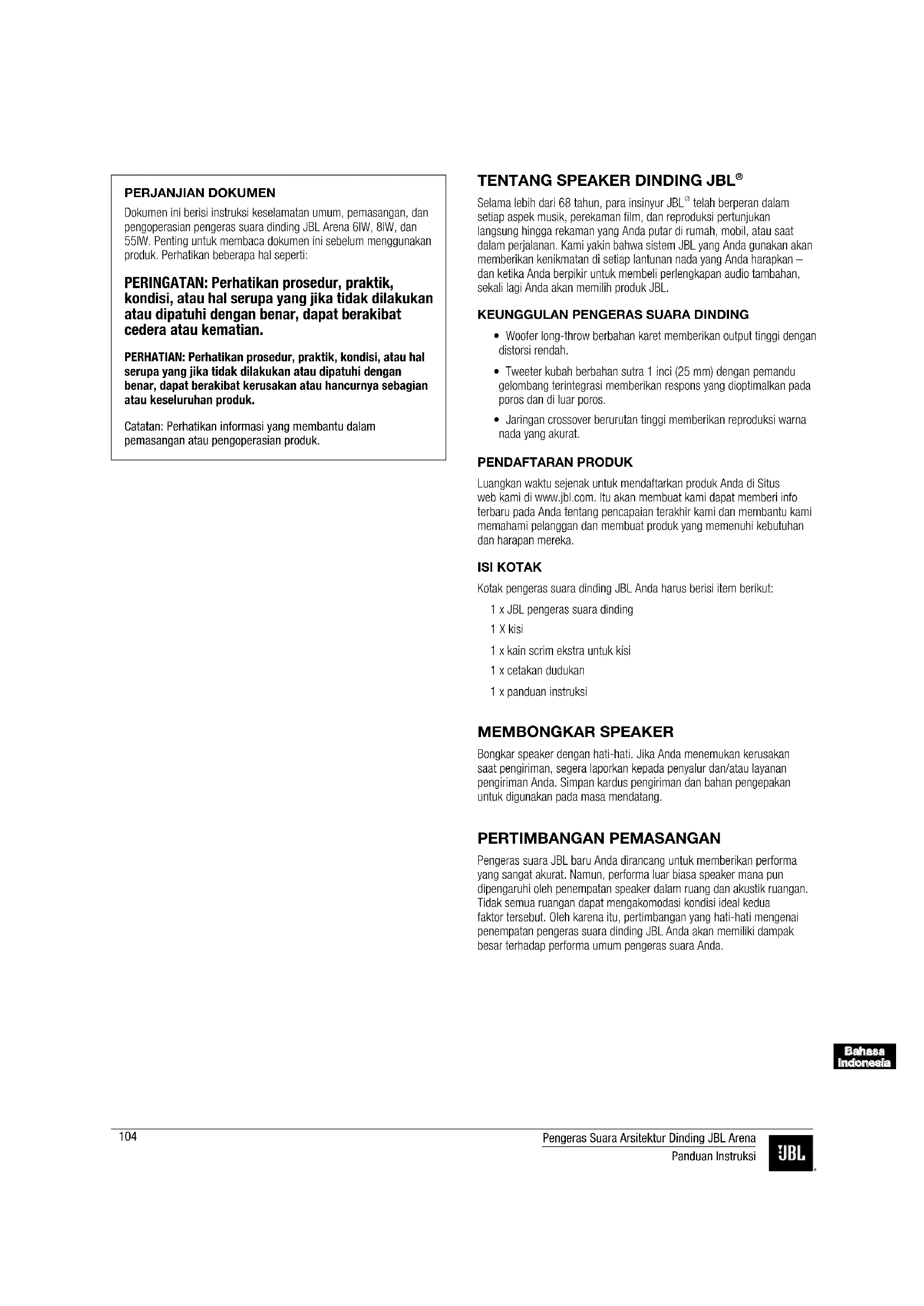 - Jaringan crossover berurutan tinggi memberikan reproduksi warna nada yang akurat. PENDAFTARAN PRODUK Luangkan waktu sejenak untuk mendaftarkan produk Anda di Situs web kami di www.jbl.com. Itu akan membuat kami dapat memberi info terbaru pada Anda tentang pencapaian terakhir kami dan membantu kami memahami pelanggan dan membuat produk yang memenuhi kebutuhan dan harapan mereka. ISI KOTAK Kotak pengeras suara dinding JBL Anda harus berisi item berikut: 1 x JBL pengeras suara dinding 1 X kisi 1 x kain scrim ekstra untuk kisi 1 x cetakan dudukan 1 x panduan instruksi MEMBONGKAR SPEAKER Bongkar speaker dengan hati-hati. Jika Anda menemukan kerusakan saat pengiriman, segera laporkan kepada penyalur dan/atau layanan pengiriman Anda. Simpan kardus pengiriman dan bahan pengepakan untuk digunakan pada masa mendatang. PERTIMBANGAN PEMASANGAN Pengeras suara JBL baru Anda dirancang untuk memberikan performa yang sangat akurat. Namun, performa luar biasa speaker mana pun dipengaruhi oleh penempatan speaker dalam ruang dan akustik ruangan. Tidak semua ruangan dapat mengakomodasi kondisi ideal kedua faktor tersebut. Oleh karena itu, pertimbangan yang hati-hati mengenai penempatan pengeras suara dinding JBL Anda akan memiliki dampak besar terhadap performa umum pengeras suara Anda. PERJANJIAN DOKUMEN Dokumen ini berisi instruksi keselamatan umum, pemasangan, dan pengoperasian pengeras suara dinding JBL Arena 6IW, 8IW, dan 55IW. Penting untuk membaca dokumen ini sebelum menggunakan produk. Perhatikan beberapa hal seperti: PERINGATAN: Perhatikan prosedur, praktik, kondisi, atau hal serupa yang jika tidak dilakukan atau dipatuhi dengan benar, dapat berakibat cedera atau kematian. PERHATIAN: Perhatikan prosedur, praktik, kondisi, atau hal serupa yang jika tidak dilakukan atau dipatuhi dengan benar, dapat berakibat kerusakan atau hancurnya sebagian atau keseluruhan produk. Catatan: Perhatikan informasi yang membantu dalam pemasangan atau pengoperasian produk.105 Pengeras Suara Arsitektur Dinding JBL Arena Panduan Instruksi Bahasa Indonesia