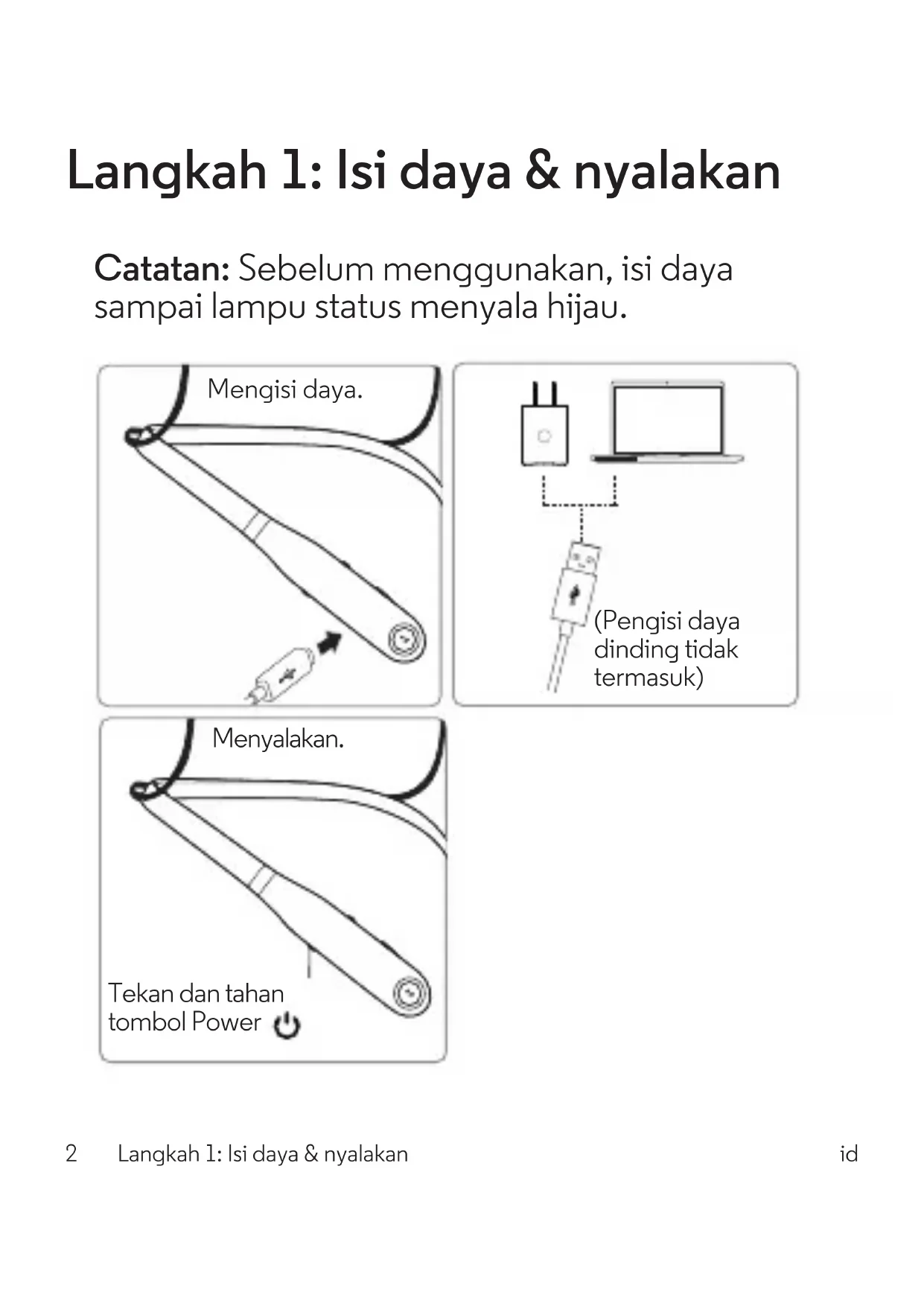 tekan dan tahan atau +Lanjutan Lanjutan 7id Lampu Status Modus pasangan Tersambung Baterai lemah Mengisi daya Pengisian daya selesai Pemeriksaan level pengisian daya Mematikan daya berkedip biru menyala biru tanpa berkedip berkedip merah menyala merah tanpa berkedip menyala hijau tanpa berkedip menyala hijau tanpa berkedip selama 2 detik menerang/meredup biruLanjutan Pemeriksaan Level Pengisian Daya 8 id Catatan: Tidak tersedia pada semua model. Catatan: Baterai Anda dirancang untuk bertahan selama umur produk. Baterai hanya boleh dilepaskan oleh pabrik daur ulang. Upaya apa pun untuk melepaskan atau mengganti baterai akan merusak produk dan membatalkan garansi. Power Tekan dengan cepat untuk mendengar waktu putar yang tersisa.Lanjutan Atur ulang 9id Matikan Bluetooth untuk semua perangkat yang tersambung. Hidupkan earbud nirkabel, kemudian tekan dan tahan dan kedua tombol volume sampai lampu status menunjukkan warna merah dan biru secara bergantian. Anda akan mendengar nada. Catatan: Produk ini mengandung magnet terbuka dan dapat merusak informasi magnetis, seperti setrip pada kartu kredit dan KTP.Lanjutan Perangkat kedua 10 id Anda menggunakan telepon atau tablet? Ataukah dua buah telepon? Sambungkan dengan keduanya pada saat yang bersamaan. 1 Pasangkan dengan perangkat pertama Anda menggunakan langkah-langkah dalam "Pasangkan dengan Bluetooth™" di halaman 3. 2 Matikan Bluetooth pada perangkat pertama Anda (telepon, tablet, atau komputer Anda). 3 Matikan earbud nirkabel. Kemudian nyalakan kembali. 4 Pasangkan dengan perangkat kedua Anda menggunakan langkah-langkah dalam "Pasangkan dengan Bluetooth™" di halaman 3. 5 Pada perangkat pertama Anda, nyalakan kembali Bluetooth untuk menyambungkannya secara bersamaan. Anda akan mendengar nada saat perangkat pertama tersambung. Kiat: Untuk beralih dan memainkan audio dari perangkat tersambung kedua, berikan jeda pada musik di perangkat yang sedang digunakan, kemudian tekan putar pada perangkat kedua.Bantuan & lainnya Bantuan & lainnya 11id