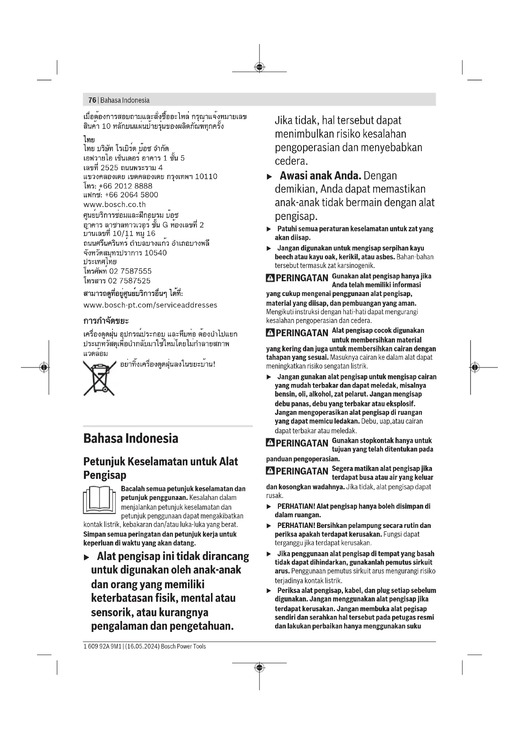 อย่าทิ้งเครื่องดูดฝุ่นลงในขยะบ้าน! Bahasa Indonesia Petunjuk Keselamatan untuk Alat Pengisap Bacalah semua petunjuk keselamatan dan petunjuk penggunaan. Kesalahan dalam menjalankan petunjuk keselamatan dan petunjuk penggunaan dapat mengakibatkan kontak listrik, kebakaran dan/atau luka-luka yang berat. Simpan semua peringatan dan petunjuk kerja untuk keperluan di waktu yang akan datang. u Alat pengisap ini tidak dirancang untuk digunakan oleh anak-anak dan orang yang memiliki keterbatasan fisik, mental atau sensorik, atau kurangnya pengalaman dan pengetahuan. Jika tidak, hal tersebut dapat menimbulkan risiko kesalahan pengoperasian dan menyebabkan cedera. u Awasi anak Anda. Dengan demikian, Anda dapat memastikan anak-anak tidak bermain dengan alat pengisap. u Patuhi semua peraturan keselamatan untuk zat yang akan diisap. u Jangan digunakan untuk mengisap serpihan kayu beech atau kayu oak, kerikil, atau asbes. Bahan-bahan tersebut termasuk zat karsinogenik. PERINGATAN Gunakan alat pengisap hanya jika Anda telah memiliki informasi yang cukup mengenai penggunaan alat pengisap, material yang diisap, dan pembuangan yang aman. Mengikuti instruksi dengan hati-hati dapat mengurangi kesalahan pengoperasian dan cedera. PERINGATAN Alat pengisap cocok digunakan untuk membersihkan material yang kering dan juga untuk membersihkan cairan dengan tahapan yang sesuai. Masuknya cairan ke dalam alat dapat meningkatkan risiko sengatan listrik. u Jangan gunakan alat pengisap untuk mengisap cairan yang mudah terbakar dan dapat meledak, misalnya bensin, oli, alkohol, zat pelarut. Jangan mengisap debu panas, debu yang terbakar atau eksplosif. Jangan mengoperasikan alat pengisap di ruangan yang dapat memicu ledakan. Debu, uap,atau cairan dapat terbakar atau meledak. PERINGATAN Gunakan stopkontak hanya untuk tujuan yang telah ditentukan pada panduan pengoperasian. PERINGATAN Segera matikan alat pengisap jika terdapat busa atau air yang keluar dan kosongkan wadahnya. Jika tidak, alat pengisap dapat rusak. u PERHATIAN! Alat pengisap hanya boleh disimpan di dalam ruangan. u PERHATIAN! Bersihkan pelampung secara rutin dan periksa apakah terdapat kerusakan. Fungsi dapat terganggu jika terdapat kerusakan. u Jika penggunaan alat pengisap di tempat yang basah tidak dapat dihindarkan, gunakanlah pemutus sirkuit arus. Penggunaan pemutus sirkuit arus mengurangi risiko terjadinya kontak listrik. u Periksa alat pengisap, kabel, dan plug setiap sebelum digunakan. Jangan menggunakan alat pengisap jika terdapat kerusakan. Jangan membuka alat pegisap sendiri dan serahkan hal tersebut pada petugas resmi dan lakukan perbaikan hanya menggunakan suku 1 609 92A 9M1 | (16.05.2024) Bosch Power ToolsBahasa Indonesia | 77 cadang asli. Alat pengisap, kabel, dan steker yang rusak menambah risiko terjadinya kontak listrik. u Kabel jangan sampai tertarik. Jangan menarik kabel saat akan melepas plug dari stopkontak atau mengggerakkan alat pengisap. Kabel yang rusak membuat risiko terjadinya kontak listrik menjadi lebih besar. u Selalu lepas steker dari stopkontak sebelum melakukan perawatan atau pembersihan, melakukan penyetelan, mengganti bagian aksesori, atau meletakkan alat pengisap. Tindakan pencegahan ini dilakukan untuk menghindari penyalaan alat pengisap yang tidak diinginkan. u Upayakanlah agar ada pertukaran udara di tempat kerja. u Serahkan perbaikan alat pengisap hanya pada petugas resmi dengan menggunakan suku cadang asli. Dengan demikian, keselamatan kerja dengan alat pengisap selalu terjamin. PERINGATAN Alat pengisap berisi debu yang berisiko bagi kesehatan. Lakukan proses pengosongan, perawatan, pembersihan kontainer debu hanya oleh orang yang ahli. Diperlukan peralatan keselamatan yang sesuai. Jangan mengoperasikan alat pengisap tanpa sistem penyaring yang lengkap dan terpasang dengan cermat. Jika tidak, hal tersebut dapat membahayakan kesehatan. u Periksa kondisi slang pengisap yang sesuai sebelum memulai pengoperasian awal. Selain itu, biarkan slang pengisap terpasang pada alat agar debu tidak keluar. Jika tidak, bisa jadi Anda menghirup debu. u Jangan menggunakan alat pengisap sebagai tempat duduk. Alat pengisap dapat rusak jika diduduki. u Gunakan kabel daya dan slang pengisap dengan hati- hati. Anda dapat membahayakan orang lain dengan benda tersebut. u Jangan membersihkan alat pengisap di bawah air yang mengalir langsung. Air yang masuk ke bagian atas alat pengisap dapat menimbulkan risiko terjadinya kontak listrik. u Jangan memodifikasi dan membuka baterai. Terdapat risiko korsleting. u Asap dapat keluar apabila terjadi kerusakan atau penggunaan yang tidak tepat pada baterai. Baterai dapat terbakar atau meledak. Biarkan udara segar mengalir masuk dan kunjungi dokter apabila mengalami gangguan kesehatan. Asap tersebut dapat mengganggu saluran pernafasan. u Penggunaan yang salah pada baterai atau baterai yang rusak dapat menyebabkan keluarnya cairan yang mudah terbakar dari baterai. Hindari terkena cairan ini. Jika tanpa sengaja terkena cairan ini, segera bilas dengan air. Jika cairan tersebut terkena mata, segara hubungi dokter untuk pertolongan lebih lanjut. Cairan yang keluar dari baterai dapat menyebabkan iritasi pada kulit atau luka bakar. u Baterai dapat rusak akibat benda-benda lancip, seperti jarum, obeng, atau tekanan keras dari luar. Hal ini dapat menyebabkan terjading hubungan singkat internal dan baterai dapat terbakar, berasap, meledak, atau mengalami panas berlebih. u Jika baterai tidak digunakan, jauhkan baterai dari klip kertas, uang logam, kunci, paku, sekrup, atau benda- benda kecil dari logam lainnya, yang dapat menjembatani kontak-kontak. Korsleting antara kontak- kontak baterai dapat mengakibatkan kebakaran atau api. u Hanya dengan cara ini, baterai dapat terlindung dari kelebihan muatan. u Hanya isi ulang daya baterai menggunakan alat pengisi daya yang dianjurkan oleh produsen. Alat pengisi daya baterai yang khusus untuk mengisi daya bate
