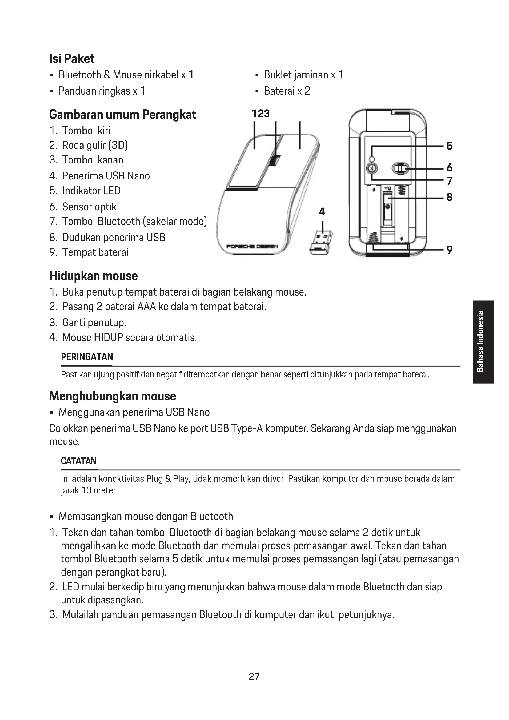 PERINGATAN Pastikan ujung positif dan negatif ditempatkan dengan benar seperti ditunjukkan pada tempat baterai. Menghubungkan mouse