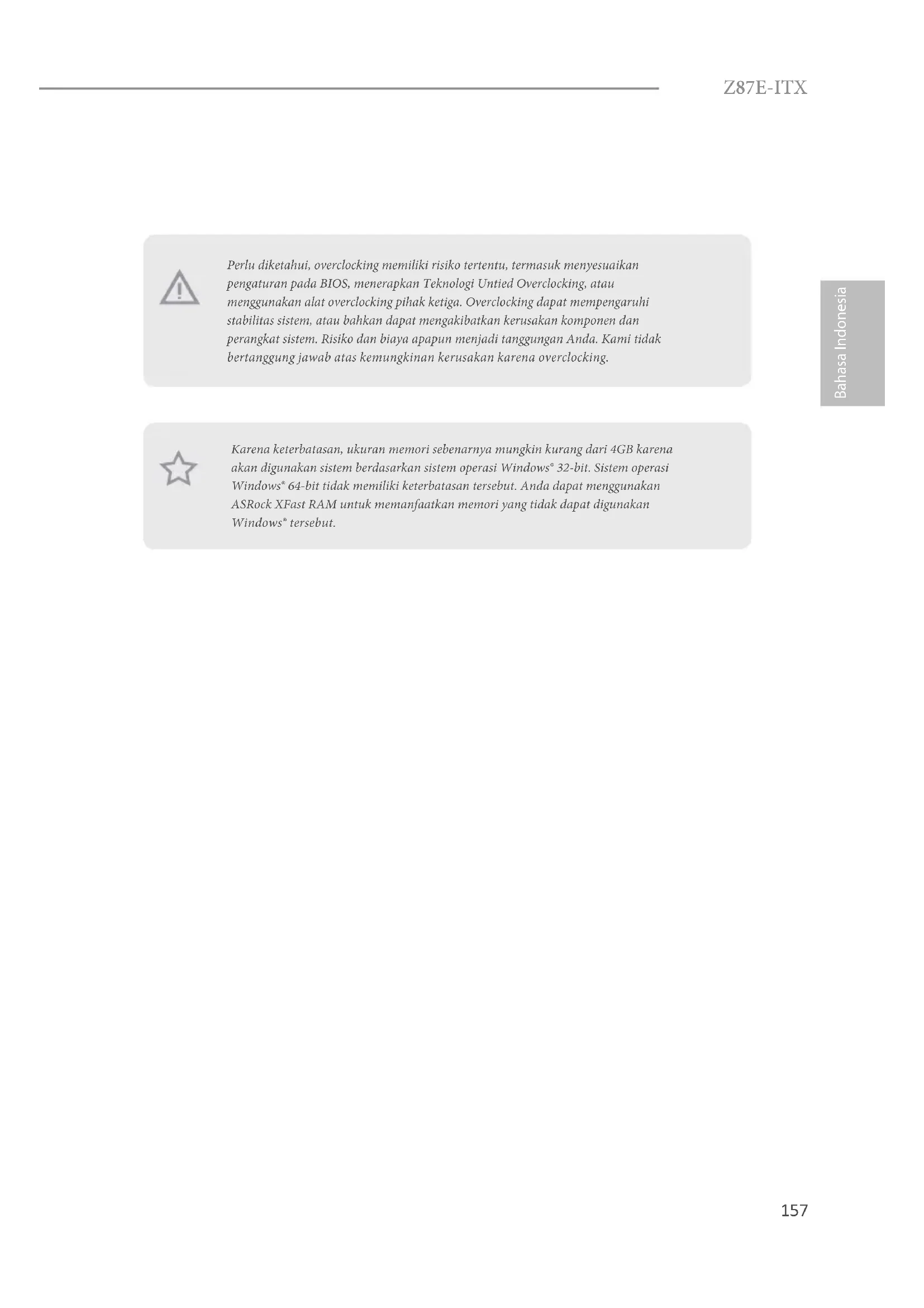 Bahasa Indonesia Perlu diketahui, overclocking memiliki risiko tertentu, termasuk menyesuaikan pengaturan pada BIOS, menerapkan Teknologi Untied Overclocking, atau menggunakan alat overclocking pihak ketiga. Overclocking dapat mempengaruhi stabilitas sistem, atau bahkan dapat mengakibatkan kerusakan komponen dan perangkat sistem. Risiko dan biaya apapun menjadi tanggungan Anda. Kami tidak bertanggung jawab atas kemungkinan kerusakan karena overclocking. Karena keterbatasan, ukuran memori sebenarnya mungkin kurang dari 4GB karena akan digunakan sistem berdasarkan sistem operasi Windows® 32-bit. Sistem operasi Windows® 64-bit tidak memiliki keterbatasan tersebut. Anda dapat menggunakan ASRock XFast RAM untuk memanfaatkan memori yang tidak dapat digunakan Windows® tersebut.158 Bahasa Indonesia