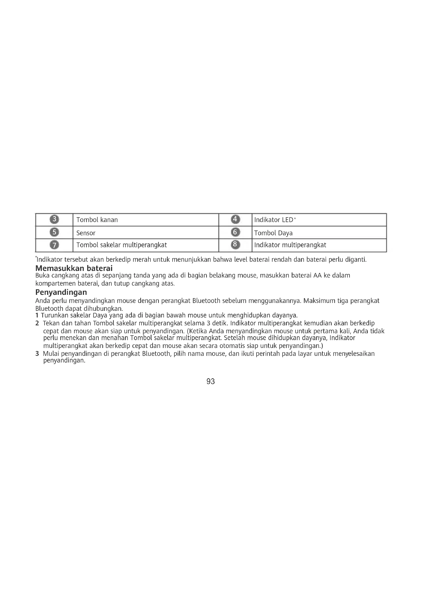 Indikator tersebut akan berkedip merah untuk menunjukkan bahwa level baterai rendah dan baterai perlu diganti. Memasukkan baterai Buka cangkang atas di sepanjang tanda yang ada di bagian belakang mouse, masukkan baterai AA ke dalam kompartemen baterai, dan tutup cangkang atas. Penyandingan Anda perlu menyandingkan mouse dengan perangkat Bluetooth sebelum menggunakannya. Maksimum tiga perangkat Bluetooth dapat dihubungkan. 1 Turunkan sakelar Daya yang ada di bagian bawah mouse untuk menghidupkan dayanya. 2 Tekan dan tahan Tombol sakelar multiperangkat selama 3 detik. Indikator multiperangkat kemudian akan berkedip cepat dan mouse akan siap untuk penyandingan. (Ketika Anda menyandingkan mouse untuk pertama kali, Anda tidak perlu menekan dan menahan Tombol sakelar multiperangkat. Setelah mouse dihidupkan dayanya, Indikator multiperangkat akan berkedip cepat dan mouse akan secara otomatis siap untuk penyandingan.) 3 Mulai penyandingan di perangkat Bluetooth, pilih nama mouse, dan ikuti perintah pada layar untuk menyelesaikan penyandingan. 934 Tekan Tombol sakelar multiperangkat untuk Indikator multiperangkat yang sesuai untuk menghidupkan. Kemudian tekan dan tahan Tombol sakelar multiperangkat selama 3 detik dan lakukan langkah sebelumnya untuk menyandingkan dengan perangkat Bluetooth lainnya. Mouse tersebut hanya mendukung perangkat yang menjalankan Windows 10, Windows 8.1, macOS 10.10, iOS 13.1, HarmonyOS 2, Android 5.0 atau versi selanjutnya, atau Linux. Penggunaan Tekan Tombol sakelar multiperangkat untuk beralih di antara beberapa perangkat Bluetooth. Informasi keselamatan