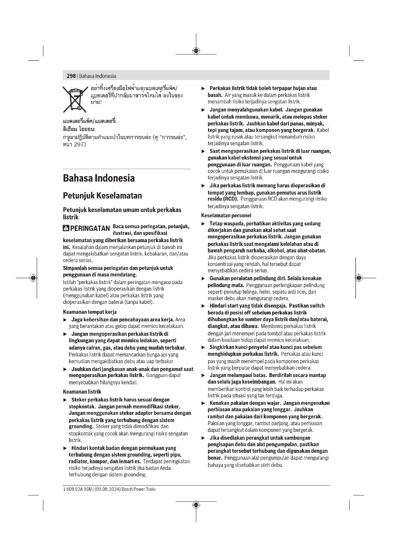 แบตเตอรี่แพ็ค/แบตเตอรี่: ลิเธียม ไอออน: กรุณาปฏิบัติตามคำแนะนำในบทการขนส่ง (ดู "การขนส่ง", หน้า297) Bahasa Indonesia Petunjuk Keselamatan Petunjuk keselamatan umum untuk perkakas listrik PERINGATAN Baca semua peringatan, petunjuk, ilustrasi, dan spesifikasi keselamatan yang diberikan bersama perkakas listrik ini. Kesalahan dalam menjalankan petunjuk di bawah ini dapat mengakibatkan sengatan listrik, kebakaran, dan/atau cedera serius. Simpanlah semua peringatan dan petunjuk untuk penggunaan di masa mendatang. Istilah "perkakas listrik" dalam peringatan mengacu pada perkakas listrik yang dioperasikan dengan listrik (menggunakan kabel) atau perkakas listrik yang dioperasikan dengan baterai (tanpa kabel). Keamanan tempat kerja u Jaga kebersihan dan pencahayaan area kerja. Area yang berantakan atau gelap dapat memicu kecelakaan. u Jangan mengoperasikan perkakas listrik di lingkungan yang dapat memicu ledakan, seperti adanya cairan, gas, atau debu yang mudah terbakar. Perkakas listrik dapat memancarkan bunga api yang kemudian mengakibatkan debu atau uap terbakar. u Jauhkan dari jangkauan anak-anak dan pengamat saat mengoperasikan perkakas listrik. Gangguan dapat menyebabkan hilangnya kendali. Keamanan listrik u Steker perkakas listrik harus sesuai dengan stopkontak. Jangan pernah memodifikasi steker. Jangan menggunakan steker adaptor bersama dengan perkakas listrik yang terhubung dengan sistem grounding. Steker yang tidak dimodifikasi dan stopkontak yang cocok akan mengurangi risiko sengatan listrik. u Hindari kontak badan dengan permukaan yang terhubung dengan sistem grounding, seperti pipa, radiator, kompor, dan lemari es. Terdapat peningkatan risiko terjadinya sengatan listrik jika badan Anda terhubung dengan sistem grounding. u Perkakas listrik tidak boleh terpapar hujan atau basah. Air yang masuk ke dalam perkakas listrik menambah risiko terjadinya sengatan listrik. u Jangan menyalahgunakan kabel. Jangan gunakan kabel untuk membawa, menarik, atau melepas steker perkakas listrik. Jauhkan kabel dari panas, minyak, tepi yang tajam, atau komponen yang bergerak. Kabel listrik yang rusak atau tersangkut menambah risiko terjadinya sengatan listrik. u Saat mengoperasikan perkakas listrik di luar ruangan, gunakan kabel ekstensi yang sesuai untuk penggunaan di luar ruangan. Penggunaan kabel yang cocok untuk pemakaian di luar ruangan mengurangi risiko terjadinya sengatan listrik. u Jika perkakas listrik memang harus dioperasikan di tempat yang lembap, gunakan pemutus arus listrik residu (RCD). Penggunaan RCD akan mengurangi risiko terjadinya sengatan listrik. Keselamatan personel u Tetap waspada, perhatikan aktivitas yang sedang dikerjakan dan gunakan akal sehat saat mengoperasikan perkakas listrik. Jangan gunakan perkakas listrik saat mengalami kelelahan atau di bawah pengaruh narkoba, alkohol, atau obat-obatan. Jika perkakas listrik dioperasikan dengan daya konsentrasi yang rendah, hal tersebut dapat menyebabkan cedera serius. u Gunakan peralatan pelindung diri. Selalu kenakan pelindung mata. Penggunaan perlengkapan pelindung seperti penutup telinga, helm, sepatu anti licin, dan masker debu akan mengurangi cedera. u Hindari start yang tidak disengaja. Pastikan switch berada di posisi off sebelum perkakas listrik dihubungkan ke sumber daya listrik dan/atau baterai, diangkat, atau dibawa. Membawa perkakas listrik dengan jari menempel pada tombol atau perkakas listrik dalam keadaan hidup dapat memicu kecelakaan. u Singkirkan kunci penyetel atau kunci pas sebelum menghidupkan perkakas listrik. Perkakas atau kunci pas yang masih menempel pada komponen perkakas listrik yang berputar dapat menyebabkan cedera. u Jangan melampaui batas. Berdirilah secara mantap dan selalu jaga keseimbangan. Hal ini akan memberikan kontrol yang lebih baik terhadap perkakas listrik pada situasi yang tak terduga. u Kenakan pakaian dengan wajar. Jangan mengenakan perhiasan atau pakaian yang longgar. Jauhkan rambut dan pakaian dari komponen yang bergerak. Pakaian yang longgar, rambut panjang, atau perhiasan dapat tersangkut dalam komponen yang bergerak. u Jika disediakan perangkat untuk sambungan pengisapan debu dan alat pengumpulan, pastikan perangkat tersebut terhubung dan digunakan dengan benar. Penggunaan alat pengumpulan dapat mengurangi bahaya yang disebabkan oleh debu. 1 609 92A 9SM | (09.08.2024) Bosch Power ToolsBahasa Indonesia | 299 u Jangan berpuas diri dan mengabaikan prinsip keselamatan karena terbiasa mengoperasikan perkakas. Tindakan yang kurang hati-hati dapat mengakibatkan cedera serius dalam waktu sepersekian detik. Penggunaan dan pemeliharaan perkakas listrik u Jangan memaksakan perkakas listrik. Gunakan perkakas listrik yang sesuai untuk pekerjaan yang dilakukan. Perkakas listrik yang sesuai akan bekerja dengan lebih baik dan aman sesuai tujuan penggunaan. u Jangan gunakan perkakas listrik dengan switch yang tidak dapat dioperasikan. Perkakas listrik yang switchnya yang tidak berfungsi dapat menimbulkan bahaya dan harus diperbaiki. u Lepaskan steker dari sumber listrik dan/atau lepas baterai, jika dapat dilepaskan dari perkakas listrik sebelum menyetel, mengganti aksesori, atau menyimpan perkakas listrik. Tindakan preventif akan mengurangi risiko menghidupkan perkakas listrik secara tidak disengaja. u Jauhkan dan simpan perkakas listrik dari jangkauan anak-anak dan jangan biarkan orang-orang yang tidak mengetahui cara menggunakan perkakas listrik, mengoperasikan perkakas listrik. Perkakas listrik dapat membahayakan jika digunakan oleh orang-orang yang tidak terlatih. u Lakukan pemeliharaan perkakas listrik dan aksesori. Periksa komponen yang bergerak apabila tidak lurus atau terikat, kerusakan komponen, dan kondisi lain yang dapat mengganggu pengoperasian perkakas listrik. Apabila rusak, perbaiki perkakas listrik sebelum digunakan. Kecelakaan ser