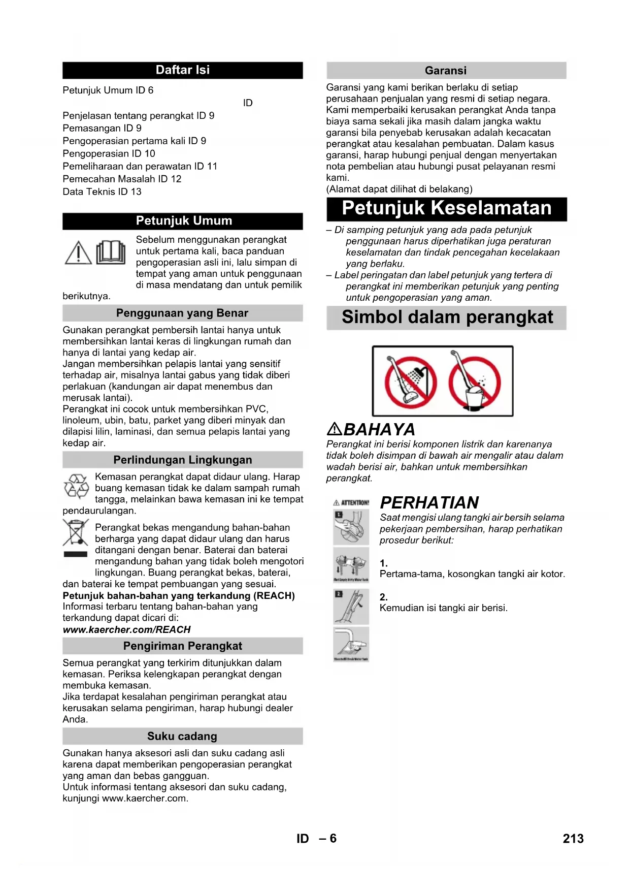 Салмағы (керек-жарақтарсыз жəне тазалағыш құралсыз) 2,4 кг Ұзындығы 305 мм Ені 226 мм Биіктігі 1220 мм 212 KK– 6 Sebelum menggunakan perangkat untuk pertama kali, baca panduan pengoperasian asli ini, lalu simpan di tempat yang aman untuk penggunaan di masa mendatang dan untuk pemilik berikutnya.Gunakan perangkat pembersih lantai hanya untuk membersihkan lantai keras di lingkungan rumah dan hanya di lantai yang kedap air.Jangan membersihkan pelapis lantai yang sensitif terhadap air, misalnya lantai gabus yang tidak diberi perlakuan (kandungan air dapat menembus dan merusak lantai).Perangkat ini cocok untuk membersihkan PVC, linoleum, ubin, batu, parket yang diberi minyak dan dilapisi lilin, laminasi, dan semua pelapis lantai yang kedap air.Kemasan perangkat dapat didaur ulang. Harap buang kemasan tidak ke dalam sampah rumah tangga, melainkan bawa kemasan ini ke tempat pendaurulangan.Perangkat bekas mengandung bahan-bahan berharga yang dapat didaur ulang dan harus ditangani dengan benar. Baterai dan baterai mengandung bahan yang tidak boleh mengotori lingkungan. Buang perangkat bekas, baterai, dan baterai ke tempat pembuangan yang sesuai.Petunjuk bahan-bahan yang terkandung (REACH)Informasi terbaru tentang bahan-bahan yang terkandung dapat dicari di: www.kaercher.com/REACHSemua perangkat yang terkirim ditunjukkan dalam kemasan. Periksa kelengkapan perangkat dengan membuka kemasan.Jika terdapat kesalahan pengiriman perangkat atau kerusakan selama pengiriman, harap hubungi dealer Anda.Gunakan hanya aksesori asli dan suku cadang asli karena dapat memberikan pengoperasian perangkat yang aman dan bebas gangguan.Untuk informasi tentang aksesori dan suku cadang, kunjungi www.kaercher.com.Garansi yang kami berikan berlaku di setiap perusahaan penjualan yang resmi di setiap negara. Kami memperbaiki kerusakan perangkat Anda tanpa biaya sama sekali jika masih dalam jangka waktu garansi bila penyebab kerusakan adalah kecacatan perangkat atau kesalahan pembuatan. Dalam kasus garansi, harap hubungi penjual dengan menyertakan nota pembelian atau hubungi pusat pelayanan resmi kami.(Alamat dapat dilihat di belakang)– Di samping petunjuk yang ada pada petunjuk penggunaan harus diperhatikan juga peraturan keselamatan dan tindak pencegahan kecelakaan yang berlaku.– Label peringatan dan label petunjuk yang tertera di perangkat ini memberikan petunjuk yang penting untuk pengoperasian yang aman. Daftar Isi Petunjuk Umum ID 6 Penjelasan tentang perangkat ID 9Pemasangan ID 9Pengoperasian pertama kali ID 9Pengoperasian ID 10Pemeliharaan dan perawatan ID 11Pemecahan Masalah ID 12Data Teknis ID 13 Petunjuk Umum Penggunaan yang Benar Perlindungan Lingkungan Pengiriman Perangkat Suku cadang Garansi Petunjuk Keselamatan Simbol dalam perangkat BAHAYA Perangkat ini berisi komponen listrik dan karenanya tidak boleh disimpan di bawah air mengalir atau dalam wadah berisi air, bahkan untuk membersihkan perangkat. PERHATIAN Saat mengisi ulang tangki air bersih selama pekerjaan pembersihan, harap perhatikan prosedur berikut: Pertama-tama, kosongkan tangki air kotor. Kemudian isi tangki air berisi. 213ID– 7 BAHAYA Petunjuk tentang situasi berbahaya yang segera mengancam yang dapat menyebabkan terluka parah atau kematian. 몇 PERINGATAN Petunjuk tentang situasi yang mungkin berbahaya yang dapat menyebabkan terluka parah atau kematian. 몇 HATI-HATI Petunjuk tentang situasi yang mungkin berbahaya yang dapat menyebabkan cedera ringan. PERHATIAN Petunjuk tentang situasi yang mungkin berbahaya yang dapat menyebabkan kerusakan properti. BAHAYA Jangan merendam perangkat ke dalam air! Pastikan perangkat dan aksesori berada dalam kondisi baik sebelum digunakan. Jangan gunakan jika tidak dalam kondisi baik. Ganti segera alat pengisi daya beserta kabel pengisian daya dengan komponen asli jika kerusakan terlihat. Untuk perawatan secara umum- dan pemeliharaan, perangkat harus dimatikan dan steker harus dicabut. Pekerjaan perbaikan pada perangkat hanya boleh dilakukan oleh pusat servis resmi. Perangkat berisi komponen listrik dan tidak boleh dibersihkan di bawah air mengalir. Jangan masukkan benda konduktif (misalnya, obeng atau serupa) ke dalam soket pengisian daya. Jangan menyentuh kontak atau kabel. Data tegangan pada pelat nama harus sesuai dengan tegangan pasokan. Jangan tarik kabel daya pada tepian yang tajam dan jangan menghimpit kabel daya. 몇 PERINGATAN Perangkat hanya boleh tersambung dengan sambungan yang sesuai dari penyedia listrik yaitu IEC 60364. Perangkat ini hanya boleh menggunakan listrik pengganti yang sesuai. Tegangan listrik harus sama dengan yang tercantum di perangkat. Untuk alasan keselamatan, sebaiknya selalu operasikan perangkat menggunakan pemutus arus (maks. 30mA). BAHAYA Bahaya sengatan listrik. Jangan pernah menyentuh steker dan stopkontak dalam kondisi tangan basah. Jangan gunakan perangkat pengisian daya dalam keadaan kotor atau basah. Jangan operasikan perangkat pengisian daya di lingkungan eksplosif. Jangan bawa perangkat pengisian daya dengan memegang kabel listriknya. Gunakan dan simpan alat pengisi daya hanya di dalam ruang kering. Jauhkan kabel lisrik dari panas, tepi tajam, oli, dan komponen perangkat yang bergerak. Kabel ekstensi dengan banyak soket dan pengoperasian banyak perangkat secara bersamaan harus dihindari. Jangan cabut konektor dengan menarik kabel listrik dari stopkontak. Jangan tutupi perangkat pengisian daya dan jaga slot ventilasi perangkat pengisian daya tetap bebas. Jangan buka perangkat pengisian daya. Lakukan perbaikan hanya menggunakan jasa teknisi ahli. Hanya gunakan perangkat pengisian daya untuk pengisian daya unit baterai yang disetujui. Ganti segera alat pengisi daya beserta kabel pengisian daya dengan komponen asli jika kerusakan terlihat. BAHAYA Bahaya sengatan listrik. Jangan biarkan baterai terkena sinar matahari kuat, panas, dan api. 몇 PERINGATAN Isi daya baterai hanya dengan perangkat pengisi