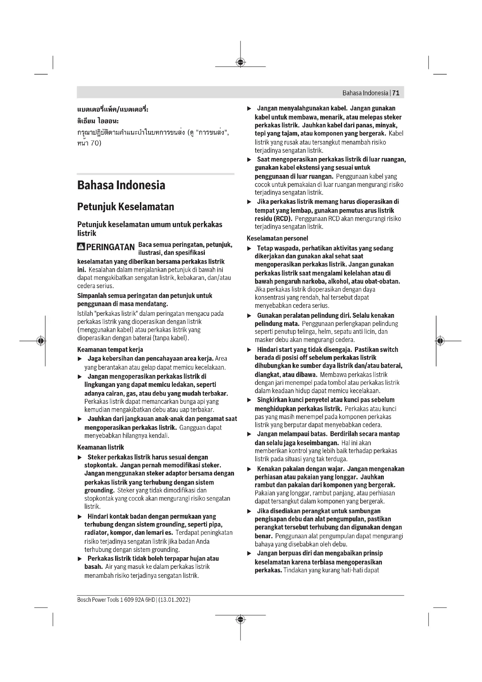 1 609 92A 6HD | (13.01.2022) Bosch Power ToolsBahasa Indonesia | 71 แบตเตอรี่แพ็ค/แบตเตอรี่: ลิเธียม ไอออน: กรุณาปฏิบัติตามคำแนะนำในบทการขนส่ง (ดู "การขนส่ง", หน้า70) Bahasa Indonesia Petunjuk Keselamatan Petunjuk keselamatan umum untuk perkakas listrik PERINGATAN Baca semua peringatan, petunjuk, ilustrasi, dan spesifikasi keselamatan yang diberikan bersama perkakas listrik ini. Kesalahan dalam menjalankan petunjuk di bawah ini dapat mengakibatkan sengatan listrik, kebakaran, dan/atau cedera serius. Simpanlah semua peringatan dan petunjuk untuk penggunaan di masa mendatang. Istilah "perkakas listrik" dalam peringatan mengacu pada perkakas listrik yang dioperasikan dengan listrik (menggunakan kabel) atau perkakas listrik yang dioperasikan dengan baterai (tanpa kabel). Keamanan tempat kerja u Jaga kebersihan dan pencahayaan area kerja. Area yang berantakan atau gelap dapat memicu kecelakaan. u Jangan mengoperasikan perkakas listrik di lingkungan yang dapat memicu ledakan, seperti adanya cairan, gas, atau debu yang mudah terbakar. Perkakas listrik dapat memancarkan bunga api yang kemudian mengakibatkan debu atau uap terbakar. u Jauhkan dari jangkauan anak-anak dan pengamat saat mengoperasikan perkakas listrik. Gangguan dapat menyebabkan hilangnya kendali. Keamanan listrik u Steker perkakas listrik harus sesuai dengan stopkontak. Jangan pernah memodifikasi steker. Jangan menggunakan steker adaptor bersama dengan perkakas listrik yang terhubung dengan sistem grounding. Steker yang tidak dimodifikasi dan stopkontak yang cocok akan mengurangi risiko sengatan listrik. u Hindari kontak badan dengan permukaan yang terhubung dengan sistem grounding, seperti pipa, radiator, kompor, dan lemari es. Terdapat peningkatan risiko terjadinya sengatan listrik jika badan Anda terhubung dengan sistem grounding. u Perkakas listrik tidak boleh terpapar hujan atau basah. Air yang masuk ke dalam perkakas listrik menambah risiko terjadinya sengatan listrik. u Jangan menyalahgunakan kabel. Jangan gunakan kabel untuk membawa, menarik, atau melepas steker perkakas listrik. Jauhkan kabel dari panas, minyak, tepi yang tajam, atau komponen yang bergerak. Kabel listrik yang rusak atau tersangkut menambah risiko terjadinya sengatan listrik. u Saat mengoperasikan perkakas listrik di luar ruangan, gunakan kabel ekstensi yang sesuai untuk penggunaan di luar ruangan. Penggunaan kabel yang cocok untuk pemakaian di luar ruangan mengurangi risiko terjadinya sengatan listrik. u Jika perkakas listrik memang harus dioperasikan di tempat yang lembap, gunakan pemutus arus listrik residu (RCD). Penggunaan RCD akan mengurangi risiko terjadinya sengatan listrik. Keselamatan personel u Tetap waspada, perhatikan aktivitas yang sedang dikerjakan dan gunakan akal sehat saat mengoperasikan perkakas listrik. Jangan gunakan perkakas listrik saat mengalami kelelahan atau di bawah pengaruh narkoba, alkohol, atau obat-obatan. Jika perkakas listrik dioperasikan dengan daya konsentrasi yang rendah, hal tersebut dapat menyebabkan cedera serius. u Gunakan peralatan pelindung diri. Selalu kenakan pelindung mata. Penggunaan perlengkapan pelindung seperti penutup telinga, helm, sepatu anti licin, dan masker debu akan mengurangi cedera. u Hindari start yang tidak disengaja. Pastikan switch berada di posisi off sebelum perkakas listrik dihubungkan ke sumber daya listrik dan/atau baterai, diangkat, atau dibawa. Membawa perkakas listrik dengan jari menempel pada tombol atau perkakas listrik dalam keadaan hidup dapat memicu kecelakaan. u Singkirkan kunci penyetel atau kunci pas sebelum menghidupkan perkakas listrik. Perkakas atau kunci pas yang masih menempel pada komponen perkakas listrik yang berputar dapat menyebabkan cedera. u Jangan melampaui batas. Berdirilah secara mantap dan selalu jaga keseimbangan. Hal ini akan memberikan kontrol yang lebih baik terhadap perkakas listrik pada situasi yang tak terduga. u Kenakan pakaian dengan wajar. Jangan mengenakan perhiasan atau pakaian yang longgar. Jauhkan rambut dan pakaian dari komponen yang bergerak. Pakaian yang longgar, rambut panjang, atau perhiasan dapat tersangkut dalam komponen yang bergerak. u Jika disediakan perangkat untuk sambungan pengisapan debu dan alat pengumpulan, pastikan perangkat tersebut terhubung dan digunakan dengan benar. Penggunaan alat pengumpulan dapat mengurangi bahaya yang disebabkan oleh debu. u Jangan berpuas diri dan mengabaikan prinsip keselamatan karena terbiasa mengoperasikan perkakas. Tindakan yang kurang hati-hati dapat Bosch Power Tools 1 609 92A 6HD | (13.01.2022)72 | Bahasa Indonesia mengakibatkan cedera serius dalam waktu sepersekian detik. Penggunaan dan pemeliharaan perkakas listrik u Jangan memaksakan perkakas listrik. Gunakan perkakas listrik yang sesuai untuk pekerjaan yang dilakukan. Perkakas listrik yang sesuai akan bekerja dengan lebih baik dan aman sesuai tujuan penggunaan. u Jangan gunakan perkakas listrik dengan switch yang tidak dapat dioperasikan. Perkakas listrik yang switchnya yang tidak berfungsi dapat menimbulkan bahaya dan harus diperbaiki. u Lepaskan steker dari sumber listrik dan/atau lepas baterai, jika dapat dilepaskan dari perkakas listrik sebelum menyetel, mengganti aksesori, atau menyimpan perkakas listrik. Tindakan preventif akan mengurangi risiko menghidupkan perkakas listrik secara tidak disengaja. u Jauhkan dan simpan perkakas listrik dari jangkauan anak-anak dan jangan biarkan orang-orang yang tidak mengetahui cara menggunakan perkakas listrik, mengoperasikan perkakas listrik. Perkakas listrik dapat membahayakan jika digunakan oleh orang-orang yang tidak terlatih. u Lakukan pemeliharaan perkakas listrik dan aksesori. Periksa komponen yang bergerak apabila tidak lurus atau terikat, kerusakan komponen, dan kondisi lain yang dapat mengganggu pengoperasian perkakas listrik. Apabila 