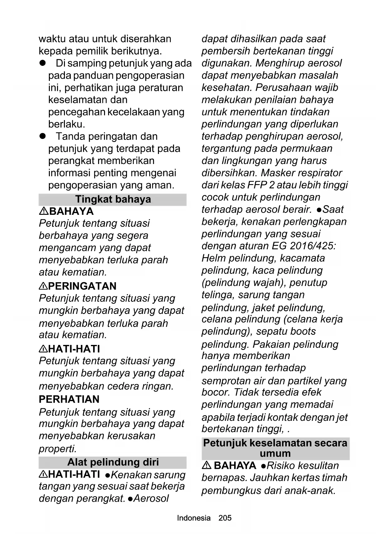 Petunjuk Keselamatan Pembersih bertekanan tinggi Bacalah petunjuk keselamatan ini dan panduan pengoperasian asli sebelum Anda menggunakan perangkat untuk pertama kalinya. Ikuti langkah-langkah sebagaimana dijelaskan. Simpan kedua dokumen tersebut untuk digunakan di lainIndonesia 205 waktu atau untuk diserahkan kepada pemilik berikutnya. Di samping petunjuk yang ada pada panduan pengoperasian ini, perhatikan juga peraturan keselamatan dan pencegahan kecelakaan yang berlaku. Tanda peringatan dan petunjuk yang terdapat pada perangkat memberikan informasi penting mengenai pengoperasian yang aman. Tingkat bahaya BAHAYA Petunjuk tentang situasi berbahaya yang segera mengancam yang dapat menyebabkan terluka parah atau kematian. 몇 PERINGATAN Petunjuk tentang situasi yang mungkin berbahaya yang dapat menyebabkan terluka parah atau kematian. 몇 HATI-HATI Petunjuk tentang situasi yang mungkin berbahaya yang dapat menyebabkan cedera ringan. PERHATIAN Petunjuk tentang situasi yang mungkin berbahaya yang dapat menyebabkan kerusakan properti. Alat pelindung diri 몇 HATI-HATI Kenakan sarung tangan yang sesuai saat bekerja dengan perangkat. Aerosol dapat dihasilkan pada saat pembersih bertekanan tinggi digunakan. Menghirup aerosol dapat menyebabkan masalah kesehatan. Perusahaan wajib melakukan penilaian bahaya untuk menentukan tindakan perlindungan yang diperlukan terhadap penghirupan aerosol, tergantung pada permukaan dan lingkungan yang harus dibersihkan. Masker respirator dari kelas FFP 2 atau lebih tinggi cocok untuk perlindungan terhadap aerosol berair. Saat bekerja, kenakan perlengkapan perlindungan yang sesuai dengan aturan EG 2016/425: Helm pelindung, kacamata pelindung, kaca pelindung (pelindung wajah), penutup telinga, sarung tangan pelindung, jaket pelindung, celana pelindung (celana kerja pelindung), sepatu boots pelindung. Pakaian pelindung hanya memberikan perlindungan terhadap semprotan air dan partikel yang bocor. Tidak tersedia efek perlindungan yang memadai apabila terjadi kontak dengan jet bertekanan tinggi, . Petunjuk keselamatan secara umum BAHAYA Risiko kesulitan bernapas. Jauhkan kertas timah pembungkus dari anak-anak.206 Indonesia 몇 PERINGATAN Gunakan hanya perangkat seperti yang ditujukan. Patuhi kondisi wilayah setempat dan perhatikan kewaspadaan saat bekerja dengan perangkat jika ada orang lain, terutama anak- anak. Penggunaan perangkat ini bukan ditujukan untuk digunakan oleh seseorang yang mempunyai keterbatasan fisik, sensorik, atau kemampuan kecerdasan, serta kurang pengalaman dan/atau pengetahuan. Hanya orang- orang yang diinstruksikan untuk menangani perangkat atau telah menunjukkan kemampuan mereka untuk mengoperasikan perangkat tersebut dan secara tegas diberi wewenang untuk menggunakan perangkat dapat menggunakan perangkat ini. Pastikan anak-anak diawasi sehingga tidak bermain-main dengan perangkat ini. Anak- anak dan remaja tidak diizinkan untuk mengoperasikan perangkat ini. 몇 HATI-HATI Perlengkapan keselamatan disediakan untuk melindungi Anda. Jangan pernah memodifikasi atau mengabaikan perlengkapan keselamatan. Bahaya sengatan listrik BAHAYA Sambungkan perangkat kelas perlindungan I hanya pada sumber arus listrik yang sesuai. Tegangan yang tertera pada pelat tipe harus sesuai dengan tegangan sumber arus listrik. Patuhi nilai sekering minimum untuk soket, lihat bab Data Teknis dalam panduan pengoperasian. Operasikan perangkat hanya dengan residual current circuit breaker (maksimal 30 mA). Sambungkan perangkat dengan steker ke jaringan listrik. Jangan menggunakan sambungan yang tidak dapat dipisah ke jaringan listrik. Steker digunakan untuk memutuskan jaringan. Jangan pernah memegang konektor dan soket dengan tangan basah. Plug utama dan kopling kabel tambahan harus tahan air dan tidak boleh diletakkan di dalam air. Kopling tidak boleh diletakkan di permukaan tanah. Gunakan drum kabel untuk memastikan bahwa soket listrik berada setidaknya 60 mm di atas tanah. Seluruh komponen yang dialiri arus listrik dan berada di area kerja harus terlindung dari semprotan air. Hanya gunakan kabel ekstensi yang tahan air dengan cross- section minimal yang ditentukan dalam panduan pengoperasian. Hindari membuat sambungan di dalam air. Jangan membersihkan perangkatIndonesia 207 dengan semprotan air bertekanan tinggi atau rendah. 몇 PERINGATAN