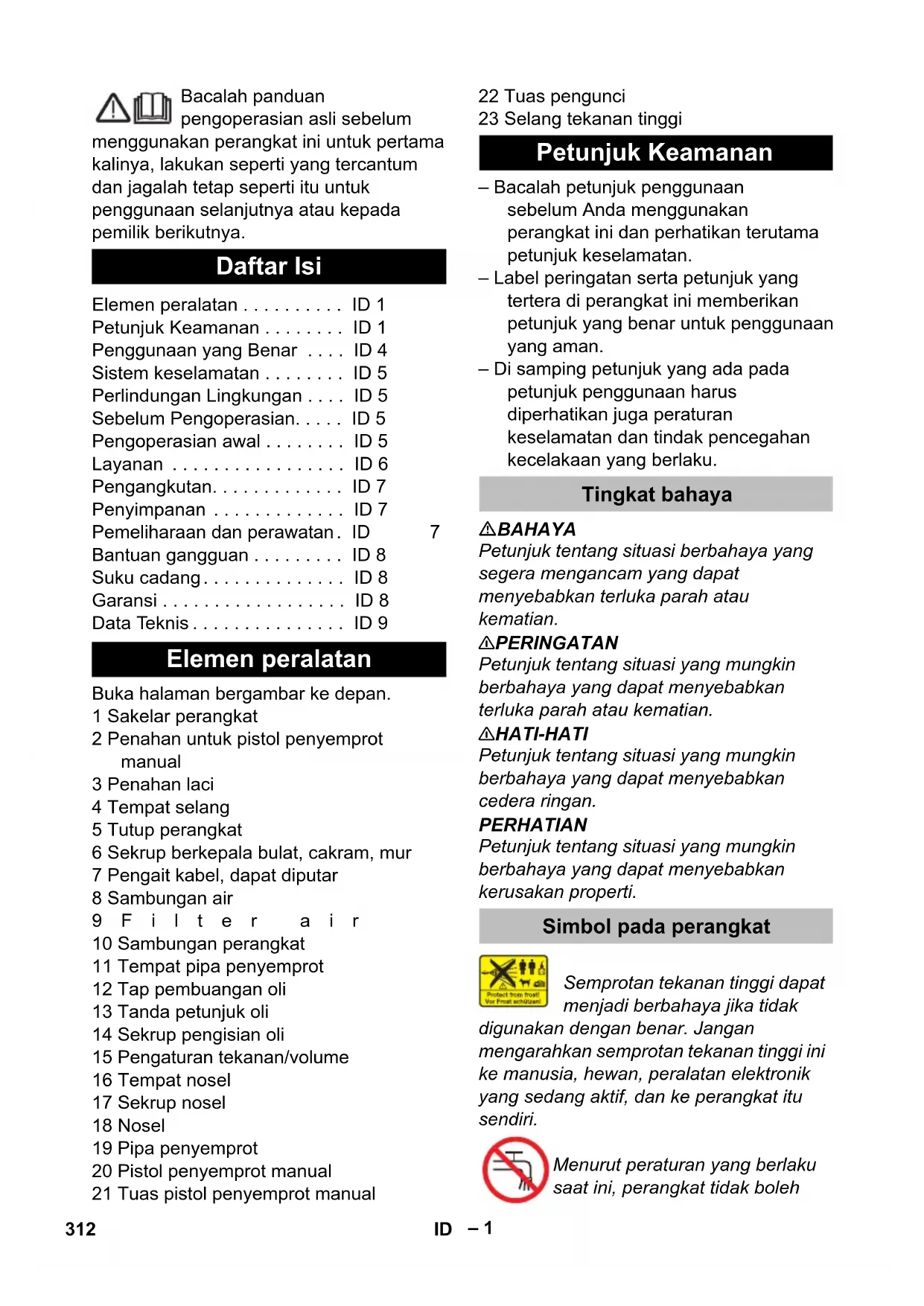 dB(A) 95 93 Produtos de consumo Quantidade de óleo l 0,4 Tipo de óleo -- 15W40 Medidas e massas Comprimento mm 700 Largura mm 455 Altura mm 1010 Massa kg 55,4 60,9 311BR– 1 Bacalah panduan pengoperasian asli sebelum menggunakan perangkat ini untuk pertama kalinya, lakukan seperti yang tercantum dan jagalah tetap seperti itu untuk penggunaan selanjutnya atau kepada pemilik berikutnya. Buka halaman bergambar ke depan. 1 Sakelar perangkat 2 Penahan untuk pistol penyemprot manual 3 Penahan laci 4 Tempat selang 5 Tutup perangkat 6 Sekrup berkepala bulat, cakram, mur 7 Pengait kabel, dapat diputar 8 Sambungan air 9Filter air 10 Sambungan perangkat 11 Tempat pipa penyemprot 12 Tap pembuangan oli 13 Tanda petunjuk oli 14 Sekrup pengisian oli 15 Pengaturan tekanan/volume 16 Tempat nosel 17 Sekrup nosel 18 Nosel 19 Pipa penyemprot 20 Pistol penyemprot manual 21 Tuas pistol penyemprot manual 22 Tuas pengunci 23 Selang tekanan tinggi – Bacalah petunjuk penggunaan sebelum Anda menggunakan perangkat ini dan perhatikan terutama petunjuk keselamatan. – Label peringatan serta petunjuk yang tertera di perangkat ini memberikan petunjuk yang benar untuk penggunaan yang aman. – Di samping petunjuk yang ada pada petunjuk penggunaan harus diperhatikan juga peraturan keselamatan dan tindak pencegahan kecelakaan yang berlaku. BAHAYA Petunjuk tentang situasi berbahaya yang segera mengancam yang dapat menyebabkan terluka parah atau kematian. 몇 PERINGATAN Petunjuk tentang situasi yang mungkin berbahaya yang dapat menyebabkan terluka parah atau kematian. 몇 HATI-HATI Petunjuk tentang situasi yang mungkin berbahaya yang dapat menyebabkan cedera ringan. PERHATIAN Petunjuk tentang situasi yang mungkin berbahaya yang dapat menyebabkan kerusakan properti. Semprotan tekanan tinggi dapat menjadi berbahaya jika tidak digunakan dengan benar. Jangan mengarahkan semprotan tekanan tinggi ini ke manusia, hewan, peralatan elektronik yang sedang aktif, dan ke perangkat itu sendiri. Menurut peraturan yang berlaku saat ini, perangkat tidak boleh Daftar Isi Elemen peralatan . . . . . . . . . . ID 1 Petunjuk Keamanan . . . . . . . . ID 1 Penggunaan yang Benar . . . . ID 4 Sistem keselamatan . . . . . . . . ID 5 Perlindungan Lingkungan . . . . ID 5 Sebelum Pengoperasian. . . . . ID 5 Pengoperasian awal . . . . . . . . ID 5 Layanan . . . . . . . . . . . . . . . . . ID 6 Pengangkutan. . . . . . . . . . . . . ID 7 Penyimpanan . . . . . . . . . . . . . ID 7 Pemeliharaan dan perawatan. ID 7 Bantuan gangguan . . . . . . . . . ID 8 Suku cadang. . . . . . . . . . . . . . ID 8 Garansi . . . . . . . . . . . . . . . . . . ID 8 Data Teknis . . . . . . . . . . . . . . . ID 9 Elemen peralatan Petunjuk Keamanan Tingkat bahaya Simbol pada perangkat 312 ID– 2 dioperasikan jika belum ada sistem pemisahan jaringan air minum. Gunakan sistem yang sesuai dengan Fa. Kärcher atau sistem pemisahan lainnya yang sesuai dengan EN 12729 jenis BA. Air yang mengalir melalui sistem pemisahan adalah air yang tidak boleh diminum. Permukaan perangkat sangat panas dan dapat menimbulkan luka bakar. Bahaya sengatan listrik. Rumahan hanya boleh dibuka oleh teknisi listrik. – Periksa apakah tegangan yang ada sesuai dengan tegangan yang tercantum dalam perangkat. – Perlindungan minimal pada stopkontak (lihat Data Teknis). – Pelindung kelas I - Perangkat hanya boleh disambungkan dengan sumber listrik yang dihubung ke ground (dibumikan) berdasarkan peraturan. – Kami sarankan untuk menyambungkan perangkat ini hanya pada stopkontak yang diamankan dengan circuit breaker 30 mA. – Kabel sambungan listrik yang disarankan oleh produsen perangkat ini harus digunakan. Demikian juga bila diperlukan penggantian kabel. Lihat petunjuk penggunaan untuk nomor pemesanan dan tipe. – Periksa bila terdapat kerusakan pada kabel steker dan steker sebelum digunakan. Kabel steker yang rusak harus segera diganti di pusat servis resmi/teknisi yang berkompeten. – Perangkat hanya boleh disambungkan dengan sambungan elektris yang dipasang oleh teknisi listrik sesuai dengan IEC 60364-1. – Proses penyalaan menyebabkan turunnya tegangan listrik dalam waktu yang singkat. – Pada kondisi listrik yang tidak bagus dapat menyebabkan gangguan pada perangkat lain. – Jangan pernah menyentuh steker dan stopkontak dalam kondisi tangan basah. – Perhatikan bahwa kabel steker atau kabel tambahan tidak boleh terlalu pendek, tertindih, tertarik, atau lecet dan rusak. Kabel harus terlindungi dari panas, minyak, dan pinggiran yang tajam. – Kabel sambungan harus mempunyai penampang lintang yang sesuai petunjuk penggunaan dan terlindungi dari cipratan air. Sambungan kabel tidak boleh tergeletak di air. – Steker dan konektor kabel ekstensi harus terlindung dari air dan tidak boleh dimasukkan ke dalam air. Selain itu, konektor kabel tidak boleh diletakkan di lantai. Sebaiknya gunakan gulungan kabel untuk memastikan stopkontak berjarak 60 mm dari permukaan lantai. – Kabel ekstensi listrik yang tidak cocok dapat berbahaya. Gunakan hanya kabel ekstensi listrik yang disetujui untuk luar ruangan dan bertanda sesuai dengan penampang lintang yang cukup. – Periksa secara berkala apakah ada kerusakan pada kabel listrik, misalnya adanya tanda-tanda sobek atau kabel listrik sudah usang. Bila ditemukan kerusakan, kabel harus diganti terlebih dulu sebelum menggunakan perangkat lebih lanjut. – Saat mengganti soket konektor pada kabel listrik atau kabel sambungan harus tetap terlindung dari cipratan air dan harus kuat secara mekanis. – Perangkat tidak boleh dibersihkan dengan cara menyemprot baik menggunakan selang biasa atau selang tekanan tinggi (bahaya korslet atau kerusakan lainnya). – Jangan gunakan perangkat pada temperatur di bawah 0 °C. Sambungan listrik 313ID– 3 – Perhatikan peraturan dari perusahan pemasok air. – Sambungan semua selang harus kencang. – Selang tekanan tinggi tidak boleh rusak. Selang tekanan tinggi yang rusak harus segera diganti. Gunakan katup, konektor, dan