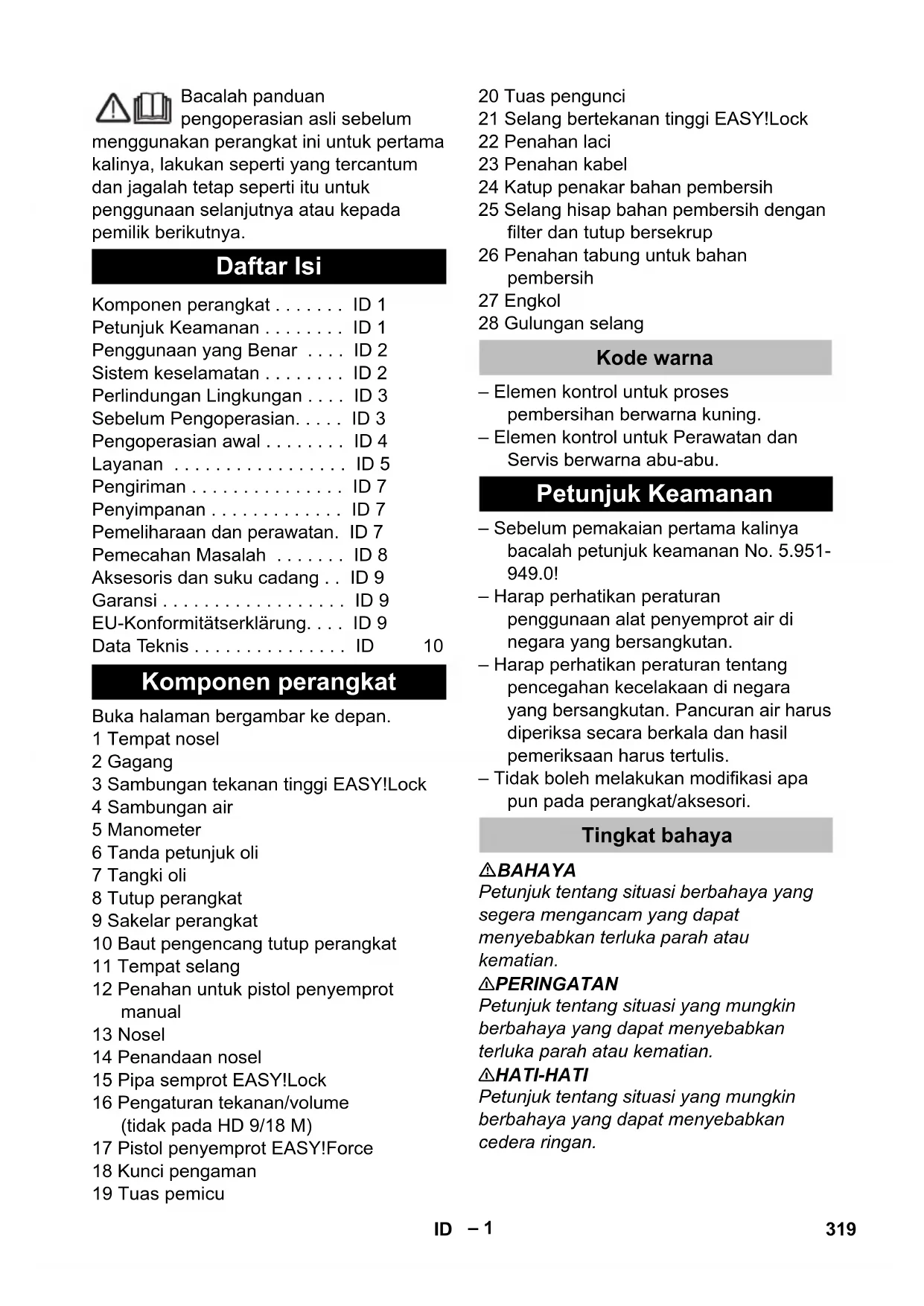 дБ(А) 91 88 Робочі матеріали Кількість мастила l 0,5 0,75 Вид мастила SAE 90 Hypoid Розміри та вага Довжина мм 554 ширина мм 509 висота мм 1000 Вага без додаткового обладнання (MX) кг 48,6 42,1 (49) 47 (55) 48 (50) 318 UK– 1 Bacalah panduan pengoperasian asli sebelum menggunakan perangkat ini untuk pertama kalinya, lakukan seperti yang tercantum dan jagalah tetap seperti itu untuk penggunaan selanjutnya atau kepada pemilik berikutnya. Buka halaman bergambar ke depan. 1 Tempat nosel 2 Gagang 3 Sambungan tekanan tinggi EASY!Lock 4 Sambungan air 5 Manometer 6 Tanda petunjuk oli 7 Tangki oli 8 Tutup perangkat 9 Sakelar perangkat 10 Baut pengencang tutup perangkat 11 Tempat selang 12 Penahan untuk pistol penyemprot manual 13 Nosel 14 Penandaan nosel 15 Pipa semprot EASY!Lock 16 Pengaturan tekanan/volume (tidak pada HD 9/18 M) 17 Pistol penyemprot EASY!Force 18 Kunci pengaman 19 Tuas pemicu 20 Tuas pengunci 21 Selang bertekanan tinggi EASY!Lock 22 Penahan laci 23 Penahan kabel 24 Katup penakar bahan pembersih 25 Selang hisap bahan pembersih dengan filter dan tutup bersekrup 26 Penahan tabung untuk bahan pembersih 27 Engkol 28 Gulungan selang – Elemen kontrol untuk proses pembersihan berwarna kuning. – Elemen kontrol untuk Perawatan dan Servis berwarna abu-abu. – Sebelum pemakaian pertama kalinya bacalah petunjuk keamanan No. 5.951- 949.0! – Harap perhatikan peraturan penggunaan alat penyemprot air di negara yang bersangkutan. – Harap perhatikan peraturan tentang pencegahan kecelakaan di negara yang bersangkutan. Pancuran air harus diperiksa secara berkala dan hasil pemeriksaan harus tertulis. – Tidak boleh melakukan modifikasi apa pun pada perangkat/aksesori. BAHAYA Petunjuk tentang situasi berbahaya yang segera mengancam yang dapat menyebabkan terluka parah atau kematian. 몇 PERINGATAN Petunjuk tentang situasi yang mungkin berbahaya yang dapat menyebabkan terluka parah atau kematian. 몇 HATI-HATI Petunjuk tentang situasi yang mungkin berbahaya yang dapat menyebabkan cedera ringan. Daftar Isi Komponen perangkat . . . . . . . ID 1 Petunjuk Keamanan . . . . . . . . ID 1 Penggunaan yang Benar . . . . ID 2 Sistem keselamatan . . . . . . . . ID 2 Perlindungan Lingkungan . . . . ID 3 Sebelum Pengoperasian. . . . . ID 3 Pengoperasian awal . . . . . . . . ID 4 Layanan . . . . . . . . . . . . . . . . . ID 5 Pengiriman . . . . . . . . . . . . . . . ID 7 Penyimpanan . . . . . . . . . . . . . ID 7 Pemeliharaan dan perawatan. ID 7 Pemecahan Masalah . . . . . . . ID 8 Aksesoris dan suku cadang . . ID 9 Garansi . . . . . . . . . . . . . . . . . . ID 9 EU-Konformitätserklärung. . . . ID 9 Data Teknis . . . . . . . . . . . . . . . ID 10 Komponen perangkat Kode warna Petunjuk Keamanan Tingkat bahaya 319ID– 2 PERHATIAN Petunjuk tentang situasi yang mungkin berbahaya yang dapat menyebabkan kerusakan properti. Semprotan tekanan tinggi dapat menjadi berbahaya jika tidak digunakan dengan benar. Jangan mengarahkan semprotan tekanan tinggi ini ke manusia, hewan, peralatan elektronik yang sedang aktif, dan ke perangkat itu sendiri. Menurut peraturan yang berlaku saat ini, perangkat tidak boleh dioperasikan jika belum ada sistem pemisahan jaringan air minum. Gunakan sistem pemisahan yang sesuai dengan KÄRCHER atau sistem pemisahan lainnya berdasarkan EN 12729 jenis BA. Air yang mengalir melalui sistem pemisahan adalah air yang tidak boleh diminum. 몇 HATI-HATI Selalu gunakan sistem pemisahan pada pasokan air. Jangan sambungkan perangkat secara langsung. Pembersih tekanan tinggi ini khusus digunakan – untuk pembersihan dengan semprotan tekanan rendah dan bahan pembersih (mis, pembersihan mesin, kendaraan, bangunan, peralatan), – untuk pembersihan dengan semprotan tekanan tinggi tanpa bahan pembersih (mis, pembersihan tembok, teras, peralatan berkebun). Untuk kotoran yang sulit dibersihkan, kami menyarankan penggunaan penghancur kotoran sebagai aksesori opsional. Pada HD...Plus, penghancur kotoran termasuk dalam pengiriman. Persyaratan kualitas air: PERHATIAN Sebagai media tekanan tinggi, hanya air bersih yang dapat digunakan. Kontaminasi akan menyebabkan keausan dini atau endapan pada perangkat. Jika air daur ulang digunakan, nilai batas berikut tidak boleh dilampaui. Sistem keselamatan berfungsi memberikan perlindungan kepada pengguna dan tidak boleh diubah atau diabaikan. Pengurangan volume air dengan pengaturan tekanan/volume akan membuka katup aliran berlebih dan sebagian air akan mengalir kembali ke sisi hisap pompa. Jika tuas pemicu pada pistol penyemprot dilepaskan, maka sakelar tekanan akan menutup aliran, dan semprotan akan berhenti. Jika tuas pemicu ditarik, pompa akan kembali diaktifkan. Simbol pada perangkat Penggunaan yang Benar Nilai pH 6,5...9,5 Konduktivitas listrik * Konduktivitas air tawar +1200 µS/cm Padatan terendapkan ** < 0,5 mg/l Padatan tersuspensi *** < 50 mg/l Hidrokarbon < 20 mg/l Klorida < 300 mg/l Sulfat < 240 mg/l Kalsium < 200 mg/l Kekerasan total < 28 °dH < 50 °TH < 500 ppm (mg CaCO