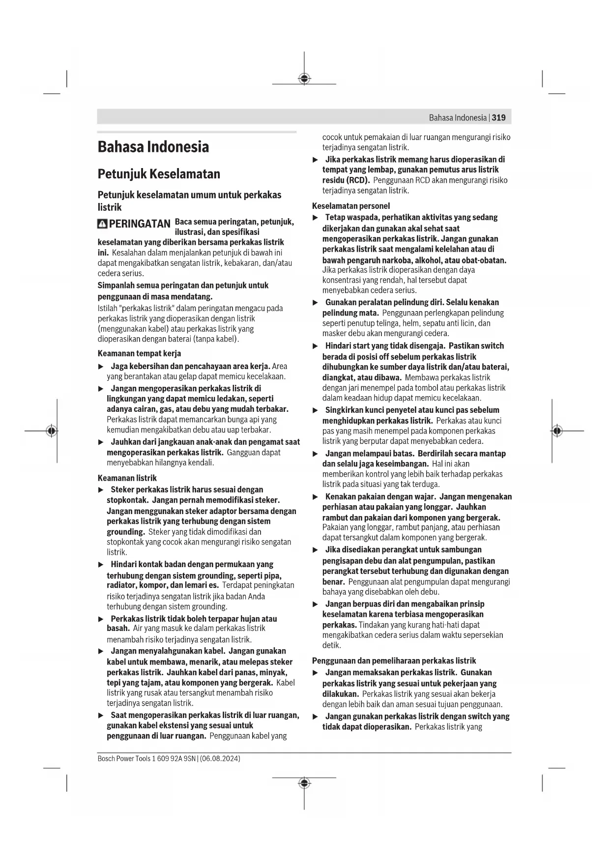 แบตเตอรี่แพ็ค/แบตเตอรี่: ลิเธียม ไอออน: กรุณาปฏิบัติตามคำแนะนำในบทการขนส่ง (ดู "การขนส่ง", หน้า318) 1 609 92A 9SN | (06.08.2024) Bosch Power ToolsBahasa Indonesia | 319 Bahasa Indonesia Petunjuk Keselamatan Petunjuk keselamatan umum untuk perkakas listrik PERINGATAN Baca semua peringatan, petunjuk, ilustrasi, dan spesifikasi keselamatan yang diberikan bersama perkakas listrik ini. Kesalahan dalam menjalankan petunjuk di bawah ini dapat mengakibatkan sengatan listrik, kebakaran, dan/atau cedera serius. Simpanlah semua peringatan dan petunjuk untuk penggunaan di masa mendatang. Istilah "perkakas listrik" dalam peringatan mengacu pada perkakas listrik yang dioperasikan dengan listrik (menggunakan kabel) atau perkakas listrik yang dioperasikan dengan baterai (tanpa kabel). Keamanan tempat kerja u Jaga kebersihan dan pencahayaan area kerja. Area yang berantakan atau gelap dapat memicu kecelakaan. u Jangan mengoperasikan perkakas listrik di lingkungan yang dapat memicu ledakan, seperti adanya cairan, gas, atau debu yang mudah terbakar. Perkakas listrik dapat memancarkan bunga api yang kemudian mengakibatkan debu atau uap terbakar. u Jauhkan dari jangkauan anak-anak dan pengamat saat mengoperasikan perkakas listrik. Gangguan dapat menyebabkan hilangnya kendali. Keamanan listrik u Steker perkakas listrik harus sesuai dengan stopkontak. Jangan pernah memodifikasi steker. Jangan menggunakan steker adaptor bersama dengan perkakas listrik yang terhubung dengan sistem grounding. Steker yang tidak dimodifikasi dan stopkontak yang cocok akan mengurangi risiko sengatan listrik. u Hindari kontak badan dengan permukaan yang terhubung dengan sistem grounding, seperti pipa, radiator, kompor, dan lemari es. Terdapat peningkatan risiko terjadinya sengatan listrik jika badan Anda terhubung dengan sistem grounding. u Perkakas listrik tidak boleh terpapar hujan atau basah. Air yang masuk ke dalam perkakas listrik menambah risiko terjadinya sengatan listrik. u Jangan menyalahgunakan kabel. Jangan gunakan kabel untuk membawa, menarik, atau melepas steker perkakas listrik. Jauhkan kabel dari panas, minyak, tepi yang tajam, atau komponen yang bergerak. Kabel listrik yang rusak atau tersangkut menambah risiko terjadinya sengatan listrik. u Saat mengoperasikan perkakas listrik di luar ruangan, gunakan kabel ekstensi yang sesuai untuk penggunaan di luar ruangan. Penggunaan kabel yang cocok untuk pemakaian di luar ruangan mengurangi risiko terjadinya sengatan listrik. u Jika perkakas listrik memang harus dioperasikan di tempat yang lembap, gunakan pemutus arus listrik residu (RCD). Penggunaan RCD akan mengurangi risiko terjadinya sengatan listrik. Keselamatan personel u Tetap waspada, perhatikan aktivitas yang sedang dikerjakan dan gunakan akal sehat saat mengoperasikan perkakas listrik. Jangan gunakan perkakas listrik saat mengalami kelelahan atau di bawah pengaruh narkoba, alkohol, atau obat-obatan. Jika perkakas listrik dioperasikan dengan daya konsentrasi yang rendah, hal tersebut dapat menyebabkan cedera serius. u Gunakan peralatan pelindung diri. Selalu kenakan pelindung mata. Penggunaan perlengkapan pelindung seperti penutup telinga, helm, sepatu anti licin, dan masker debu akan mengurangi cedera. u Hindari start yang tidak disengaja. Pastikan switch berada di posisi off sebelum perkakas listrik dihubungkan ke sumber daya listrik dan/atau baterai, diangkat, atau dibawa. Membawa perkakas listrik dengan jari menempel pada tombol atau perkakas listrik dalam keadaan hidup dapat memicu kecelakaan. u Singkirkan kunci penyetel atau kunci pas sebelum menghidupkan perkakas listrik. Perkakas atau kunci pas yang masih menempel pada komponen perkakas listrik yang berputar dapat menyebabkan cedera. u Jangan melampaui batas. Berdirilah secara mantap dan selalu jaga keseimbangan. Hal ini akan memberikan kontrol yang lebih baik terhadap perkakas listrik pada situasi yang tak terduga. u Kenakan pakaian dengan wajar. Jangan mengenakan perhiasan atau pakaian yang longgar. Jauhkan rambut dan pakaian dari komponen yang bergerak. Pakaian yang longgar, rambut panjang, atau perhiasan dapat tersangkut dalam komponen yang bergerak. u Jika disediakan perangkat untuk sambungan pengisapan debu dan alat pengumpulan, pastikan perangkat tersebut terhubung dan digunakan dengan benar. Penggunaan alat pengumpulan dapat mengurangi bahaya yang disebabkan oleh debu. u Jangan berpuas diri dan mengabaikan prinsip keselamatan karena terbiasa mengoperasikan perkakas. Tindakan yang kurang hati-hati dapat mengakibatkan cedera serius dalam waktu sepersekian detik. Penggunaan dan pemeliharaan perkakas listrik u Jangan memaksakan perkakas listrik. Gunakan perkakas listrik yang sesuai untuk pekerjaan yang dilakukan. Perkakas listrik yang sesuai akan bekerja dengan lebih baik dan aman sesuai tujuan penggunaan. u Jangan gunakan perkakas listrik dengan switch yang tidak dapat dioperasikan. Perkakas listrik yang Bosch Power Tools 1 609 92A 9SN | (06.08.2024)320 | Bahasa Indonesia switchnya yang tidak berfungsi dapat menimbulkan bahaya dan harus diperbaiki. u Lepaskan steker dari sumber listrik dan/atau lepas baterai, jika dapat dilepaskan dari perkakas listrik sebelum menyetel, mengganti aksesori, atau menyimpan perkakas listrik. Tindakan preventif akan mengurangi risiko menghidupkan perkakas listrik secara tidak disengaja. u Jauhkan dan simpan perkakas listrik dari jangkauan anak-anak dan jangan biarkan orang-orang yang tidak mengetahui cara menggunakan perkakas listrik, mengoperasikan perkakas listrik. Perkakas listrik dapat membahayakan jika digunakan oleh orang-orang yang tidak terlatih. u Lakukan pemeliharaan perkakas listrik dan aksesori. Periksa komponen yang bergerak apabila tidak lurus atau terikat, kerusakan komponen, dan kondisi lain yang dapat mengganggu pengoperasian perkakas listrik. Apabi
