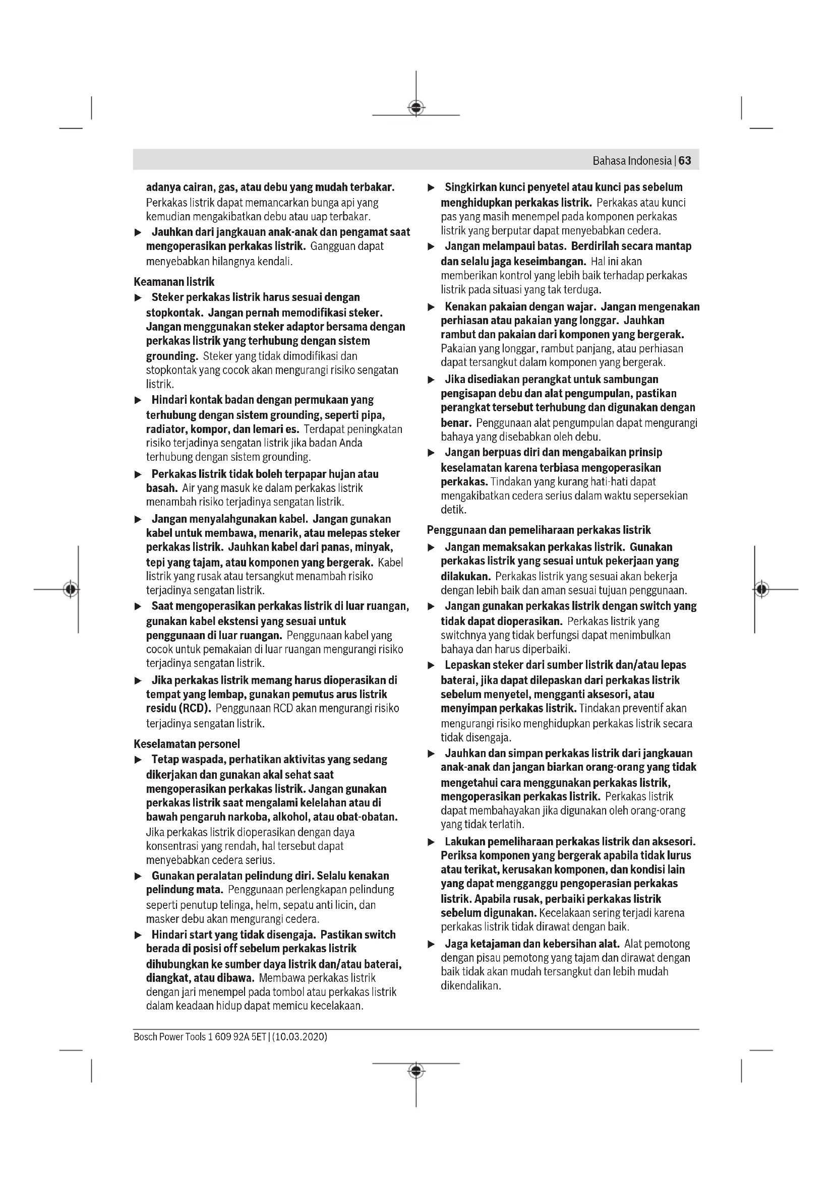 แบตเตอรี่แพ็ค/แบตเตอรี่: ลิเธียม ไอออน: กรุณาปฏิบัติตามคำแนะนำในบทการขนส่ง (ดู "การขนส่ง", หน้า62) Bahasa Indonesia Petunjuk Keselamatan Petunjuk keselamatan umum untuk perkakas listrik PERINGATAN Baca semua peringatan, petunjuk, ilustrasi, dan spesifikasi keselamatan yang diberikan bersama perkakas listrik ini. Kesalahan dalam menjalankan petunjuk di bawah ini dapat mengakibatkan sengatan listrik, kebakaran, dan/atau cedera serius. Simpanlah semua peringatan dan petunjuk untuk penggunaan di masa mendatang. Istilah "perkakas listrik" dalam peringatan mengacu pada perkakas listrik yang dioperasikan dengan listrik (menggunakan kabel) atau perkakas listrik yang dioperasikan dengan baterai (tanpa kabel). Keamanan tempat kerja u Jaga kebersihan dan pencahayaan area kerja. Area yang berantakan atau gelap dapat memicu kecelakaan. u Jangan mengoperasikan perkakas listrik di lingkungan yang dapat memicu ledakan, seperti 1 609 92A 5ET | (10.03.2020) Bosch Power ToolsBahasa Indonesia | 63 adanya cairan, gas, atau debu yang mudah terbakar. Perkakas listrik dapat memancarkan bunga api yang kemudian mengakibatkan debu atau uap terbakar. u Jauhkan dari jangkauan anak-anak dan pengamat saat mengoperasikan perkakas listrik. Gangguan dapat menyebabkan hilangnya kendali. Keamanan listrik u Steker perkakas listrik harus sesuai dengan stopkontak. Jangan pernah memodifikasi steker. Jangan menggunakan steker adaptor bersama dengan perkakas listrik yang terhubung dengan sistem grounding. Steker yang tidak dimodifikasi dan stopkontak yang cocok akan mengurangi risiko sengatan listrik. u Hindari kontak badan dengan permukaan yang terhubung dengan sistem grounding, seperti pipa, radiator, kompor, dan lemari es. Terdapat peningkatan risiko terjadinya sengatan listrik jika badan Anda terhubung dengan sistem grounding. u Perkakas listrik tidak boleh terpapar hujan atau basah. Air yang masuk ke dalam perkakas listrik menambah risiko terjadinya sengatan listrik. u Jangan menyalahgunakan kabel. Jangan gunakan kabel untuk membawa, menarik, atau melepas steker perkakas listrik. Jauhkan kabel dari panas, minyak, tepi yang tajam, atau komponen yang bergerak. Kabel listrik yang rusak atau tersangkut menambah risiko terjadinya sengatan listrik. u Saat mengoperasikan perkakas listrik di luar ruangan, gunakan kabel ekstensi yang sesuai untuk penggunaan di luar ruangan. Penggunaan kabel yang cocok untuk pemakaian di luar ruangan mengurangi risiko terjadinya sengatan listrik. u Jika perkakas listrik memang harus dioperasikan di tempat yang lembap, gunakan pemutus arus listrik residu (RCD). Penggunaan RCD akan mengurangi risiko terjadinya sengatan listrik. Keselamatan personel u Tetap waspada, perhatikan aktivitas yang sedang dikerjakan dan gunakan akal sehat saat mengoperasikan perkakas listrik. Jangan gunakan perkakas listrik saat mengalami kelelahan atau di bawah pengaruh narkoba, alkohol, atau obat-obatan. Jika perkakas listrik dioperasikan dengan daya konsentrasi yang rendah, hal tersebut dapat menyebabkan cedera serius. u Gunakan peralatan pelindung diri. Selalu kenakan pelindung mata. Penggunaan perlengkapan pelindung seperti penutup telinga, helm, sepatu anti licin, dan masker debu akan mengurangi cedera. u Hindari start yang tidak disengaja. Pastikan switch berada di posisi off sebelum perkakas listrik dihubungkan ke sumber daya listrik dan/atau baterai, diangkat, atau dibawa. Membawa perkakas listrik dengan jari menempel pada tombol atau perkakas listrik dalam keadaan hidup dapat memicu kecelakaan. u Singkirkan kunci penyetel atau kunci pas sebelum menghidupkan perkakas listrik. Perkakas atau kunci pas yang masih menempel pada komponen perkakas listrik yang berputar dapat menyebabkan cedera. u Jangan melampaui batas. Berdirilah secara mantap dan selalu jaga keseimbangan. Hal ini akan memberikan kontrol yang lebih baik terhadap perkakas listrik pada situasi yang tak terduga. u Kenakan pakaian dengan wajar. Jangan mengenakan perhiasan atau pakaian yang longgar. Jauhkan rambut dan pakaian dari komponen yang bergerak. Pakaian yang longgar, rambut panjang, atau perhiasan dapat tersangkut dalam komponen yang bergerak. u Jika disediakan perangkat untuk sambungan pengisapan debu dan alat pengumpulan, pastikan perangkat tersebut terhubung dan digunakan dengan benar. Penggunaan alat pengumpulan dapat mengurangi bahaya yang disebabkan oleh debu. u Jangan berpuas diri dan mengabaikan prinsip keselamatan karena terbiasa mengoperasikan perkakas. Tindakan yang kurang hati-hati dapat mengakibatkan cedera serius dalam waktu sepersekian detik. Penggunaan dan pemeliharaan perkakas listrik u Jangan memaksakan perkakas listrik. Gunakan perkakas listrik yang sesuai untuk pekerjaan yang dilakukan. Perkakas listrik yang sesuai akan bekerja dengan lebih baik dan aman sesuai tujuan penggunaan. u Jangan gunakan perkakas listrik dengan switch yang tidak dapat dioperasikan. Perkakas listrik yang switchnya yang tidak berfungsi dapat menimbulkan bahaya dan harus diperbaiki. u Lepaskan steker dari sumber listrik dan/atau lepas baterai, jika dapat dilepaskan dari perkakas listrik sebelum menyetel, mengganti aksesori, atau menyimpan perkakas listrik. Tindakan preventif akan mengurangi risiko menghidupkan perkakas listrik secara tidak disengaja. u Jauhkan dan simpan perkakas listrik dari jangkauan anak-anak dan jangan biarkan orang-orang yang tidak mengetahui cara menggunakan perkakas listrik, mengoperasikan perkakas listrik. Perkakas listrik dapat membahayakan jika digunakan oleh orang-orang yang tidak terlatih. u Lakukan pemeliharaan perkakas listrik dan aksesori. Periksa komponen yang bergerak apabila tidak lurus atau terikat, kerusakan komponen, dan kondisi lain yang dapat mengganggu pengoperasian perkakas listrik. Apabila rusak, perbaiki perkakas listrik sebelum digunakan. Kecelakaan serin