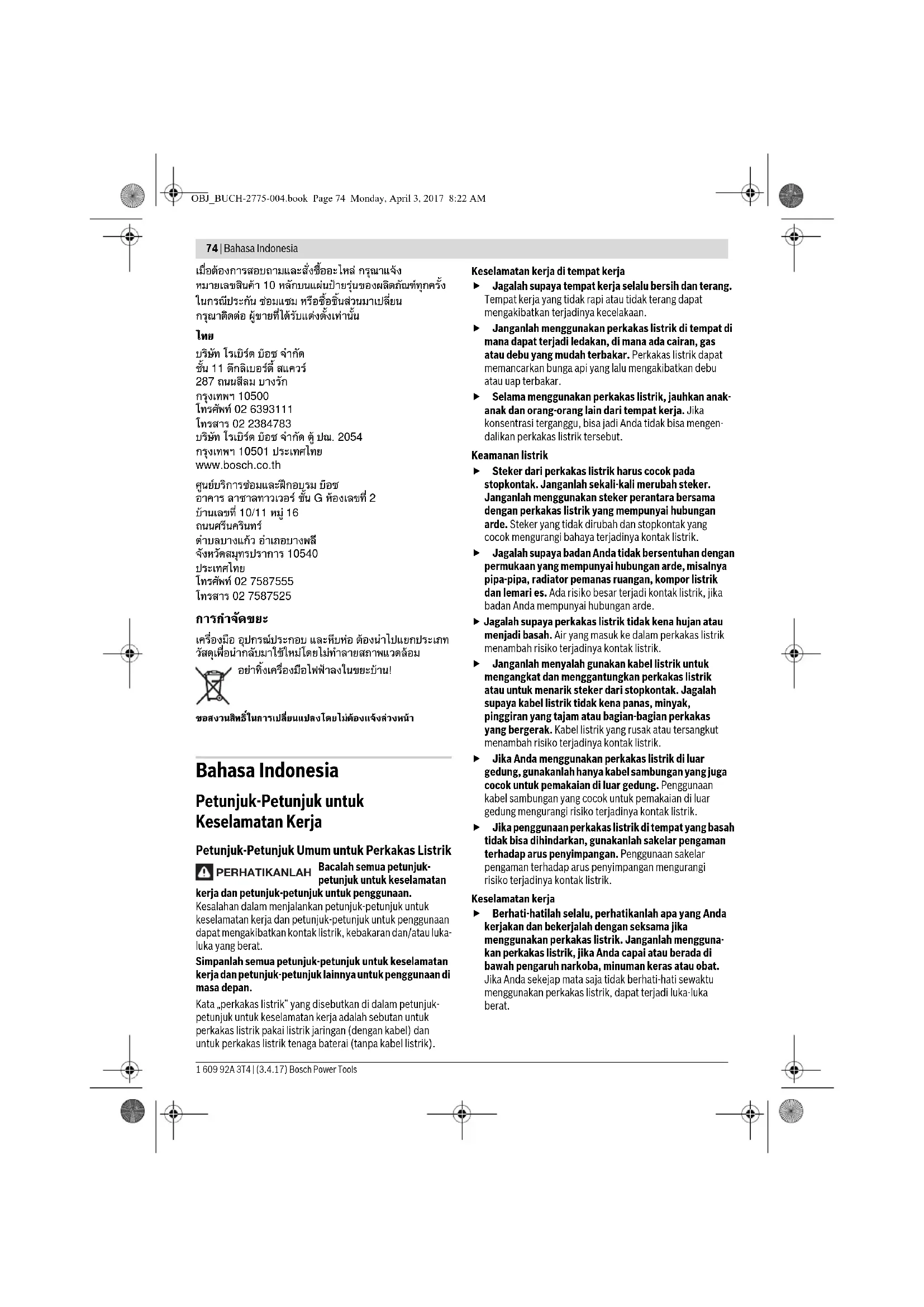 Bahasa Indonesia Petunjuk-Petunjuk untuk Keselamatan Kerja Petunjuk-Petunjuk Umum untuk Perkakas Listrik Bacalah semua petunjuk- petunjuk untuk keselamatan kerja dan petunjuk-petunjuk untuk penggunaan. Kesalahan dalam menjalankan petunjuk-petunjuk untuk keselamatan kerja dan petunjuk-petunjuk untuk penggunaan dapat mengakibatkan kontak listrik, kebakaran dan/atau luka- luka yang berat. Simpanlah semua petunjuk-petunjuk untuk keselamatan kerja dan petunjuk-petunjuk lainnya untuk penggunaan di masa depan. Kata „perkakas listrik“ yang disebutkan di dalam petunjuk- petunjuk untuk keselamatan kerja adalah sebutan untuk perkakas listrik pakai listrik jaringan (dengan kabel) dan untuk perkakas listrik tenaga baterai (tanpa kabel listrik). Keselamatan kerja di tempat kerja Jagalah supaya tempat kerja selalu bersih dan terang. Tempat kerja yang tidak rapi atau tidak terang dapat mengakibatkan terjadinya kecelakaan. Janganlah menggunakan perkakas listrik di tempat di mana dapat terjadi ledakan, di mana ada cairan, gas atau debu yang mudah terbakar. Perkakas listrik dapat memancarkan bunga api yang lalu mengakibatkan debu atau uap terbakar. Selama menggunakan perkakas listrik, jauhkan anak- anak dan orang-orang lain dari tempat kerja. Jika konsentrasi terganggu, bisa jadi Anda tidak bisa mengen- dalikan perkakas listrik tersebut. Keamanan listrik Steker dari perkakas listrik harus cocok pada stopkontak. Janganlah sekali-kali merubah steker. Janganlah menggunakan steker perantara bersama dengan perkakas listrik yang mempunyai hubungan arde. Steker yang tidak dirubah dan stopkontak yang cocok mengurangi bahaya terjadinya kontak listrik. Jagalah supaya badan Anda tidak bersentuhan dengan permukaan yang mempunyai hubungan arde, misalnya pipa-pipa, radiator pemanas ruangan, kompor listrik dan lemari es. Ada risiko besar terjadi kontak listrik, jika badan Anda mempunyai hubungan arde. Jagalah supaya perkakas listrik tidak kena hujan atau menjadi basah. Air yang masuk ke dalam perkakas listrik menambah risiko terjadinya kontak listrik. Janganlah menyalah gunakan kabel listrik untuk mengangkat dan menggantungkan perkakas listrik atau untuk menarik steker dari stopkontak. Jagalah supaya kabel listrik tidak kena panas, minyak, pinggiran yang tajam atau bagian-bagian perkakas yang bergerak. Kabel listrik yang rusak atau tersangkut menambah risiko terjadinya kontak listrik. Jika Anda menggunakan perkakas listrik di luar gedung, gunakanlah hanya kabel sambungan yang juga cocok untuk pemakaian di luar gedung. Penggunaan kabel sambungan yang cocok untuk pemakaian di luar gedung mengurangi risiko terjadinya kontak listrik. Jika penggunaan perkakas listrik di tempat yang basah tidak bisa dihindarkan, gunakanlah sakelar pengaman terhadap arus penyimpangan. Penggunaan sakelar pengaman terhadap arus penyimpangan mengurangi risiko terjadinya kontak listrik. Keselamatan kerja Berhati-hatilah selalu, perhatikanlah apa yang Anda kerjakan dan bekerjalah dengan seksama jika menggunakan perkakas listrik. Janganlah mengguna- kan perkakas listrik, jika Anda capai atau berada di bawah pengaruh narkoba, minuman keras atau obat. Jika Anda sekejap mata saja tidak berhati-hati sewaktu menggunakan perkakas listrik, dapat terjadi luka-luka berat. PERHATIKANLAH OBJ_BUCH-2775-004.book Page 74 Monday, April 3, 2017 8:22 AMBahasa Indonesia | 75 Bosch Power Tools 1 609 92A 3T4 | (3.4.17) Pakailah pakaian dan sarana pelindung dan pakailah selalu kaca mata pelindung. Dengan memakai pakaian dan sarana pelindung, misalnya kedok anti debu (masker), sepatu tertutup yang tidak licin, helm pelindung atau pemalut telinga sesuai dengan pekerjaan yang dilakukan dengan perkakas listrik, bahaya terjadinya luka-luka dapat dikurangi. Jagalah supaya perkakas listrik tidak dihidupkan secara tidak disengaja. Perhatikan bahwa perkakas listrik dalam penyetelan mati, jika steker disambungkan pada pengadaan listrik dan/atau baterai, jika perkakas listrik diangkat atau dibawa. Jika selama mengangkat perkakas listrik jari Anda berada pada tombol untuk menghidupkan dan mematikan atau perkakas listrik yang dalam penyetelan hidup disambungkan pada listrik, dapat terjadi kecelakaan. Lepaskan semua perkakas-perkakas penyetelan atau kunci-kunci pas sebelum perkakas listrik dihidupkan. Perkakas atau kunci yang berada di dalam bagian yang berputar dapat mengakibatkan terjadinya luka-luka. Aturkan badan sedemikian sehingga Anda bisa bekerja dengan aman. Berdirilah secara mantap dan jagalah selalu keseimbangan. Dengan demikian Anda bisa mengendalikan perkakas listrik dengan lebih baik, jika terjadi sesuatu dengan tiba-tiba. Pakailah pakaian yang cocok. Janganlah memakai pakaian yang longgar atau perhiasan. Jagalah supaya rambut, pakaian dan sarung tangan tidak masuk dalam bagian-bagian perkakas yang bergerak. Pakaian yang longgar, rambut panjang atau perhiasan dapat tersangkut dalam bagian perkakas yang bergerak. Jika ada kemungkinan untuk memasangkan sarana penghisapan dan penampungan debu, perhatikan bahwa sarana-sarana ini telah dipasangkan dan digunakan dengan betul. Penggunaan sarana penghisa- pan bisa mengurangi bahaya yang disebabkan debu. Penggunaan dan penanganan perkakas listrik dengan seksama Janganlah membebankan perkakas listrik terlalu berat. Gunakan selalu perkakas listrik yang cocok untuk pekerjaan yang dilakukan. Dengan perkakas listrik yang cocok Anda bekerja lebih baik dan lebih aman dalam batas-batas kemampuan yang ditentukan. Janganlah menggunakan perkakas listrik yang tombolnya rusak. Perkakas listrik yang tidak bisa dihidupkan atau dimatikan, berbahaya dan harus direparasikan. Tariklah steker dari stopkontak dan/atau keluarkan baterai, sebelum Anda melakukan penyetelan pada perkakas listrik, mengganti alat-alat kerja atau sebelum menyimpan perkakas listrik. Tindakan keselamatan kerja ini mengurangi bahaya perkakas listrik hidup secara tidak disengaja. Simpanlah perkakas listrik yang tidak digunakan di luar jangkauan anak-anak. Janganlah mengizin