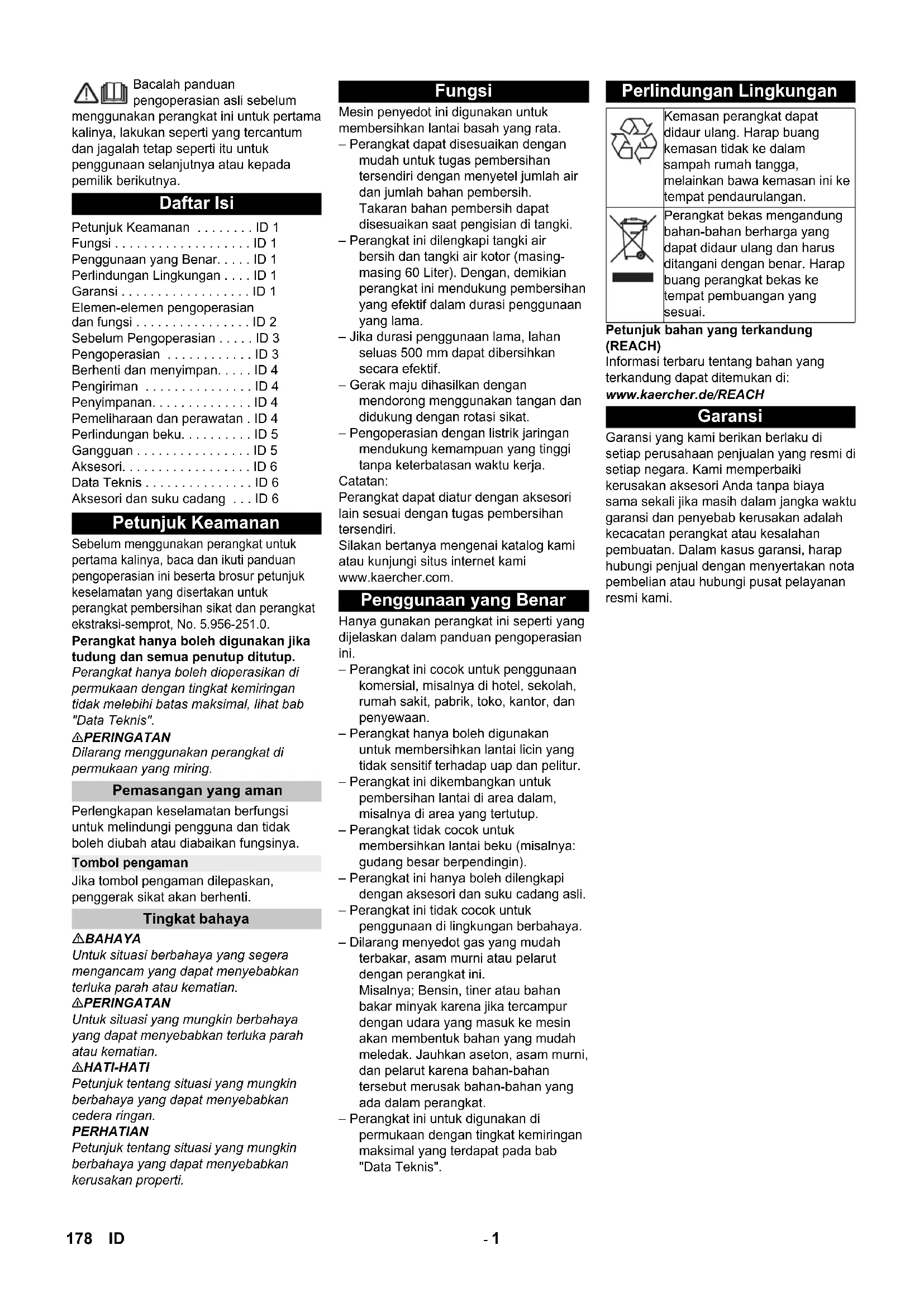 Chairman of the Board of Management Director Regulatory Affairs & Certification 177UK- 1 Bacalah panduan pengoperasian asli sebelum menggunakan perangkat ini untuk pertama kalinya, lakukan seperti yang tercantum dan jagalah tetap seperti itu untuk penggunaan selanjutnya atau kepada pemilik berikutnya. Sebelum menggunakan perangkat untuk pertama kalinya, baca dan ikuti panduan pengoperasian ini beserta brosur petunjuk keselamatan yang disertakan untuk perangkat pembersihan sikat dan perangkat ekstraksi-semprot, No. 5.956-251.0. Perangkat hanya boleh digunakan jika tudung dan semua penutup ditutup. Perangkat hanya boleh dioperasikan di permukaan dengan tingkat kemiringan tidak melebihi batas maksimal, lihat bab "Data Teknis". 몇 PERINGATAN Dilarang menggunakan perangkat di permukaan yang miring. Perlengkapan keselamatan berfungsi untuk melindungi pengguna dan tidak boleh diubah atau diabaikan fungsinya. Jika tombol pengaman dilepaskan, penggerak sikat akan berhenti. BAHAYA Untuk situasi berbahaya yang segera mengancam yang dapat menyebabkan terluka parah atau kematian. 몇 PERINGATAN Untuk situasi yang mungkin berbahaya yang dapat menyebabkan terluka parah atau kematian. 몇 HATI-HATI Petunjuk tentang situasi yang mungkin berbahaya yang dapat menyebabkan cedera ringan. PERHATIAN Petunjuk tentang situasi yang mungkin berbahaya yang dapat menyebabkan kerusakan properti. Mesin penyedot ini digunakan untuk membersihkan lantai basah yang rata. – Perangkat dapat disesuaikan dengan mudah untuk tugas pembersihan tersendiri dengan menyetel jumlah air dan jumlah bahan pembersih. Takaran bahan pembersih dapat disesuaikan saat pengisian di tangki. – Perangkat ini dilengkapi tangki air bersih dan tangki air kotor (masing- masing 60 Liter). Dengan, demikian perangkat ini mendukung pembersihan yang efektif dalam durasi penggunaan yang lama. – Jika durasi penggunaan lama, lahan seluas 500 mm dapat dibersihkan secara efektif. – Gerak maju dihasilkan dengan mendorong menggunakan tangan dan didukung dengan rotasi sikat. – Pengoperasian dengan listrik jaringan mendukung kemampuan yang tinggi tanpa keterbatasan waktu kerja. Catatan: Perangkat dapat diatur dengan aksesori lain sesuai dengan tugas pembersihan tersendiri. Silakan bertanya mengenai katalog kami atau kunjungi situs internet kami www.kaercher.com. Hanya gunakan perangkat ini seperti yang dijelaskan dalam panduan pengoperasian ini. – Perangkat ini cocok untuk penggunaan komersial, misalnya di hotel, sekolah, rumah sakit, pabrik, toko, kantor, dan penyewaan. – Perangkat hanya boleh digunakan untuk membersihkan lantai licin yang tidak sensitif terhadap uap dan pelitur. – Perangkat ini dikembangkan untuk pembersihan lantai di area dalam, misalnya di area yang tertutup. – Perangkat tidak cocok untuk membersihkan lantai beku (misalnya: gudang besar berpendingin). – Perangkat ini hanya boleh dilengkapi dengan aksesori dan suku cadang asli. – Perangkat ini tidak cocok untuk penggunaan di lingkungan berbahaya. – Dilarang menyedot gas yang mudah terbakar, asam murni atau pelarut dengan perangkat ini. Misalnya; Bensin, tiner atau bahan bakar minyak karena jika tercampur dengan udara yang masuk ke mesin akan membentuk bahan yang mudah meledak. Jauhkan aseton, asam murni, dan pelarut karena bahan-bahan tersebut merusak bahan-bahan yang ada dalam perangkat. – Perangkat ini untuk digunakan di permukaan dengan tingkat kemiringan maksimal yang terdapat pada bab "Data Teknis". Petunjuk bahan yang terkandung (REACH) Informasi terbaru tentang bahan yang terkandung dapat ditemukan di: www.kaercher.de/REACH Garansi yang kami berikan berlaku di setiap perusahaan penjualan yang resmi di setiap negara. Kami memperbaiki kerusakan aksesori Anda tanpa biaya sama sekali jika masih dalam jangka waktu garansi dan penyebab kerusakan adalah kecacatan perangkat atau kesalahan pembuatan. Dalam kasus garansi, harap hubungi penjual dengan menyertakan nota pembelian atau hubungi pusat pelayanan resmi kami. Daftar Isi Petunjuk Keamanan . . . . . . . . ID 1 Fungsi . . . . . . . . . . . . . . . . . . . ID 1 Penggunaan yang Benar. . . . . ID 1 Perlindungan Lingkungan . . . . ID 1 Garansi . . . . . . . . . . . . . . . . . . ID 1 Elemen-elemen pengoperasian dan fungsi . . . . . . . . . . . . . . . . ID 2 Sebelum Pengoperasian . . . . . ID 3 Pengoperasian . . . . . . . . . . . . ID 3 Berhenti dan menyimpan. . . . . ID 4 Pengiriman . . . . . . . . . . . . . . . ID 4 Penyimpanan. . . . . . . . . . . . . . ID 4 Pemeliharaan dan perawatan . ID 4 Perlindungan beku. . . . . . . . . . ID 5 Gangguan . . . . . . . . . . . . . . . . ID 5 Aksesori. . . . . . . . . . . . . . . . . . ID 6 Data Teknis . . . . . . . . . . . . . . . ID 6 Aksesori dan suku cadang . . . ID 6 Petunjuk Keamanan Pemasangan yang aman Tombol pengaman Tingkat bahaya Fungsi Penggunaan yang Benar Perlindungan Lingkungan Kemasan perangkat dapat didaur ulang. Harap buang kemasan tidak ke dalam sampah rumah tangga, melainkan bawa kemasan ini ke tempat pendaurulangan. Perangkat bekas mengandung bahan-bahan berharga yang dapat didaur ulang dan harus ditangani dengan benar. Harap buang perangkat bekas ke tempat pembuangan yang sesuai. Garansi 178 ID- 2 1 Saringan bulu halus 2 Tombol pengaman 3 Selang pengurasan air kotor dengan pengatur takaran 4 Penahan untuk Homebase 5 Pelampung 6 Tangki air bersih 7 Katup tangki air bersih 8 Celah gagang 9 Kepala pembersih 10 Sikat disk 11 Lubang pengisian air bersih 12 Kelem pergantian sikat 13 Tangki air kotor 14 Indikator ketinggian air bersih 15 Tuas putar untuk memiringkan batang penyedot 16 Pengaturan ketinggian batang penyedot * 17 Mur sayap untuk mengencangkan batang penyedot 18 Batang penyedot * 19 Selang penyedot 20 Kenop pengaturan jumlah air 21 Kabel daya dengan steker 22 Tuas penurun batang penyedot 23 Panel kendali 24 Gagang dorong 25 Tempat parkir untuk perangkat pembersih "Homebase Box" 26 Tutup tangki air kotor