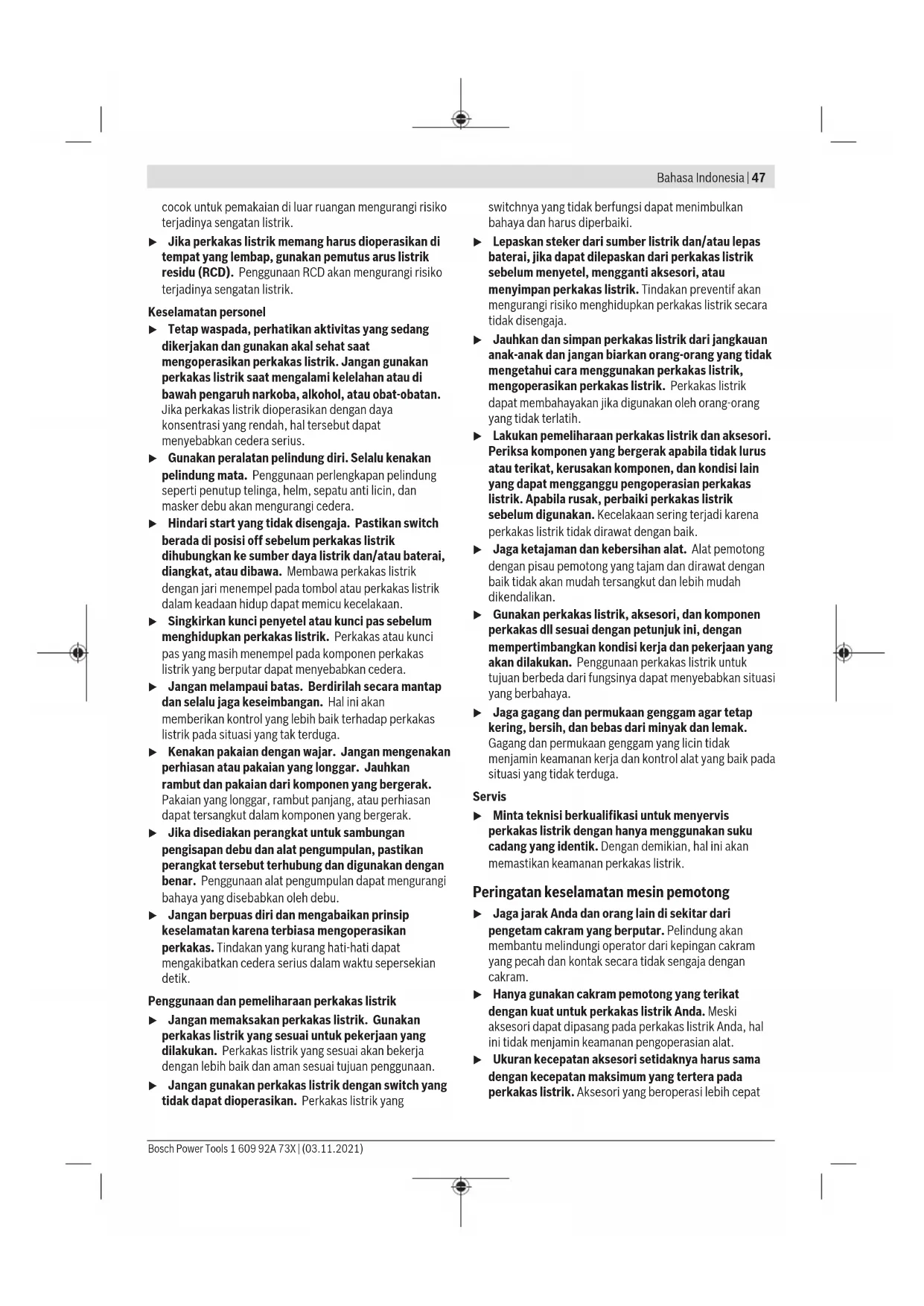 โทรศัพท์ 02 7587555 โทรสาร 02 7587525 สามารถดูที่อยู่ศูนย์บริการอื่นๆ ได้ที่: www.bosch-pt.com/serviceaddresses การกำจัดขยะ เครื่องมือไฟฟ้า อุปกรณ์ประกอบ และหีบห่อ ต้องนำ ไปแยกประเภทวัสดุเพื่อการรีไซเคิลที่เป็นมิตรต่อสิ่งแวดล้อม อย่าทิ้งเครื่องมือไฟฟ้าลงในขยะบ้าน! Bahasa Indonesia Petunjuk Keselamatan Petunjuk Keselamatan Umum Perkakas Listrik PERINGATAN Baca semua peringatan, petunjuk, ilustrasi, dan spesifikasi keselamatan yang diberikan bersama perkakas listrik ini. Kesalahan dalam menjalankan petunjuk di bawah ini dapat mengakibatkan sengatan listrik, kebakaran, dan/atau cedera serius. Simpanlah semua peringatan dan petunjuk untuk penggunaan di masa mendatang. Istilah "perkakas listrik" dalam peringatan mengacu pada perkakas listrik yang dioperasikan dengan listrik (menggunakan kabel) atau perkakas listrik yang dioperasikan dengan baterai (tanpa kabel). Keamanan tempat kerja u Jaga kebersihan dan pencahayaan area kerja. Area yang berantakan atau gelap dapat memicu kecelakaan. u Jangan mengoperasikan perkakas listrik di lingkungan yang dapat memicu ledakan, seperti adanya cairan, gas, atau debu yang mudah terbakar. Perkakas listrik dapat memancarkan bunga api yang kemudian mengakibatkan debu atau uap terbakar. u Jauhkan dari jangkauan anak-anak dan pengamat saat mengoperasikan perkakas listrik. Gangguan dapat menyebabkan hilangnya kendali. Keamanan listrik u Steker perkakas listrik harus sesuai dengan stopkontak. Jangan pernah memodifikasi steker. Jangan menggunakan steker adaptor bersama dengan perkakas listrik yang terhubung dengan sistem grounding. Steker yang tidak dimodifikasi dan stopkontak yang cocok akan mengurangi risiko sengatan listrik. u Hindari kontak badan dengan permukaan yang terhubung dengan sistem grounding, seperti pipa, radiator, kompor, dan lemari es. Terdapat peningkatan risiko terjadinya sengatan listrik jika badan Anda terhubung dengan sistem grounding. u Perkakas listrik tidak boleh terpapar hujan atau basah. Air yang masuk ke dalam perkakas listrik menambah risiko terjadinya sengatan listrik. u Jangan menyalahgunakan kabel. Jangan gunakan kabel untuk membawa, menarik, atau melepas steker perkakas listrik. Jauhkan kabel dari panas, minyak, tepi yang tajam, atau komponen yang bergerak. Kabel listrik yang rusak atau tersangkut menambah risiko terjadinya sengatan listrik. u Saat mengoperasikan perkakas listrik di luar ruangan, gunakan kabel ekstensi yang sesuai untuk penggunaan di luar ruangan. Penggunaan kabel yang 1 609 92A 73X | (03.11.2021) Bosch Power ToolsBahasa Indonesia | 47 cocok untuk pemakaian di luar ruangan mengurangi risiko terjadinya sengatan listrik. u Jika perkakas listrik memang harus dioperasikan di tempat yang lembap, gunakan pemutus arus listrik residu (RCD). Penggunaan RCD akan mengurangi risiko terjadinya sengatan listrik. Keselamatan personel u Tetap waspada, perhatikan aktivitas yang sedang dikerjakan dan gunakan akal sehat saat mengoperasikan perkakas listrik. Jangan gunakan perkakas listrik saat mengalami kelelahan atau di bawah pengaruh narkoba, alkohol, atau obat-obatan. Jika perkakas listrik dioperasikan dengan daya konsentrasi yang rendah, hal tersebut dapat menyebabkan cedera serius. u Gunakan peralatan pelindung diri. Selalu kenakan pelindung mata. Penggunaan perlengkapan pelindung seperti penutup telinga, helm, sepatu anti licin, dan masker debu akan mengurangi cedera. u Hindari start yang tidak disengaja. Pastikan switch berada di posisi off sebelum perkakas listrik dihubungkan ke sumber daya listrik dan/atau baterai, diangkat, atau dibawa. Membawa perkakas listrik dengan jari menempel pada tombol atau perkakas listrik dalam keadaan hidup dapat memicu kecelakaan. u Singkirkan kunci penyetel atau kunci pas sebelum menghidupkan perkakas listrik. Perkakas atau kunci pas yang masih menempel pada komponen perkakas listrik yang berputar dapat menyebabkan cedera. u Jangan melampaui batas. Berdirilah secara mantap dan selalu jaga keseimbangan. Hal ini akan memberikan kontrol yang lebih baik terhadap perkakas listrik pada situasi yang tak terduga. u Kenakan pakaian dengan wajar. Jangan mengenakan perhiasan atau pakaian yang longgar. Jauhkan rambut dan pakaian dari komponen yang bergerak. Pakaian yang longgar, rambut panjang, atau perhiasan dapat tersangkut dalam komponen yang bergerak. u Jika disediakan perangkat untuk sambungan pengisapan debu dan alat pengumpulan, pastikan perangkat tersebut terhubung dan digunakan dengan benar. Penggunaan alat pengumpulan dapat mengurangi bahaya yang disebabkan oleh debu. u Jangan berpuas diri dan mengabaikan prinsip keselamatan karena terbiasa mengoperasikan perkakas. Tindakan yang kurang hati-hati dapat mengakibatkan cedera serius dalam waktu sepersekian detik. Penggunaan dan pemeliharaan perkakas listrik u Jangan memaksakan perkakas listrik. Gunakan perkakas listrik yang sesuai untuk pekerjaan yang dilakukan. Perkakas listrik yang sesuai akan bekerja dengan lebih baik dan aman sesuai tujuan penggunaan. u Jangan gunakan perkakas listrik dengan switch yang tidak dapat dioperasikan. Perkakas listrik yang switchnya yang tidak berfungsi dapat menimbulkan bahaya dan harus diperbaiki. u Lepaskan steker dari sumber listrik dan/atau lepas baterai, jika dapat dilepaskan dari perkakas listrik sebelum menyetel, mengganti aksesori, atau menyimpan perkakas listrik. Tindakan preventif akan mengurangi risiko menghidupkan perkakas listrik secara tidak disengaja. u Jauhkan dan simpan perkakas listrik dari jangkauan anak-anak dan jangan biarkan orang-orang yang tidak mengetahui cara menggunakan perkakas listrik, mengoperasikan perka