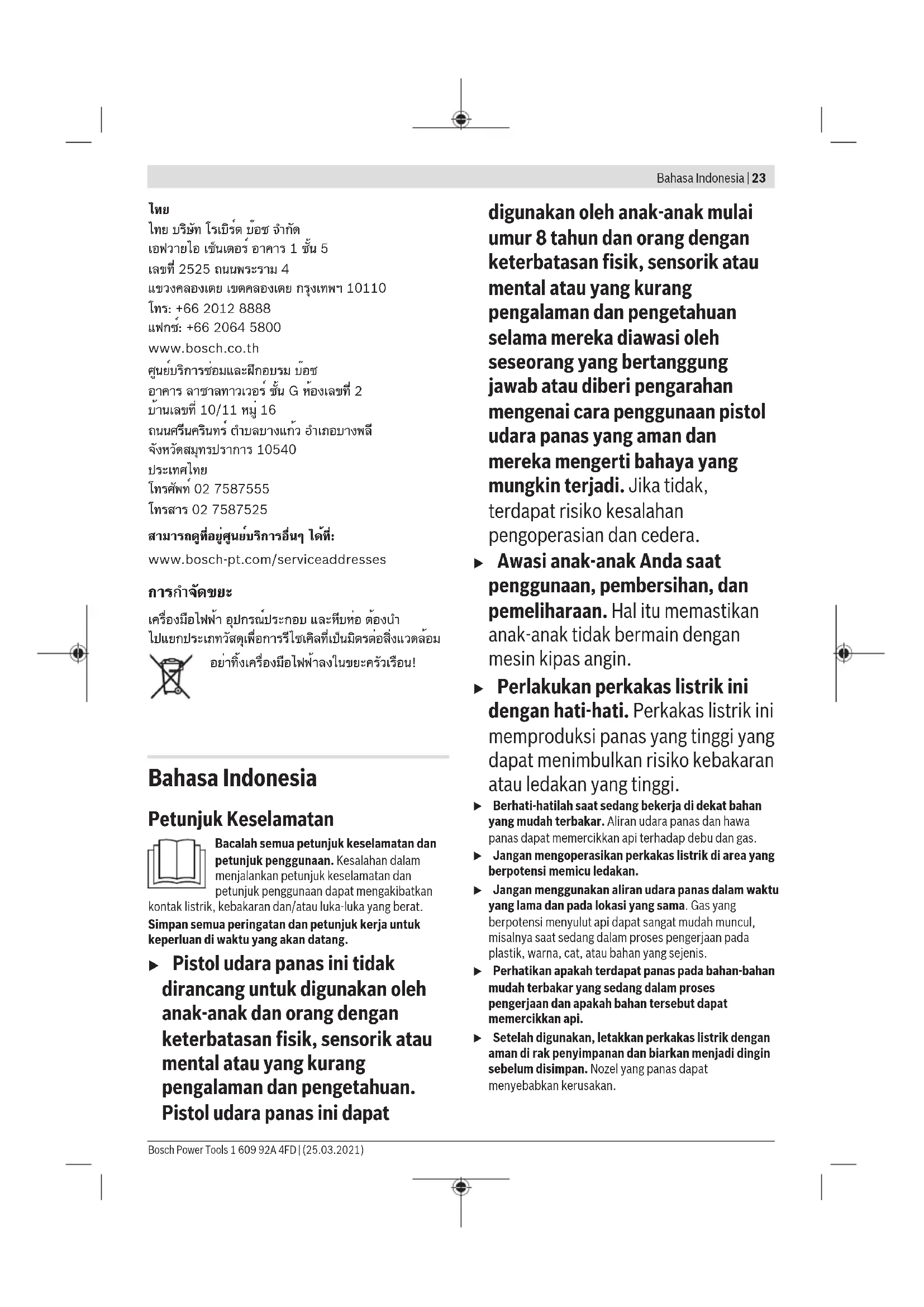 โทรศัพท์ 02 7587555 โทรสาร 02 7587525 สามารถดูที่อยู่ศูนย์บริการอื่นๆ ได้ที่: www.bosch-pt.com/serviceaddresses การกำจัดขยะ เครื่องมือไฟฟ้า อุปกรณ์ประกอบ และหีบห่อ ต้องนำ ไปแยกประเภทวัสดุเพื่อการรีไซเคิลที่เป็นมิตรต่อสิ่งแวดล้อม อย่าทิ้งเครื่องมือไฟฟ้าลงในขยะครัวเรือน! Bahasa Indonesia Petunjuk Keselamatan Bacalah semua petunjuk keselamatan dan petunjuk penggunaan. Kesalahan dalam menjalankan petunjuk keselamatan dan petunjuk penggunaan dapat mengakibatkan kontak listrik, kebakaran dan/atau luka-luka yang berat. Simpan semua peringatan dan petunjuk kerja untuk keperluan di waktu yang akan datang. u Pistol udara panas ini tidak dirancang untuk digunakan oleh anak-anak dan orang dengan keterbatasan fisik, sensorik atau mental atau yang kurang pengalaman dan pengetahuan. Pistol udara panas ini dapat digunakan oleh anak-anak mulai umur 8 tahun dan orang dengan keterbatasan fisik, sensorik atau mental atau yang kurang pengalaman dan pengetahuan selama mereka diawasi oleh seseorang yang bertanggung jawab atau diberi pengarahan mengenai cara penggunaan pistol udara panas yang aman dan mereka mengerti bahaya yang mungkin terjadi. Jika tidak, terdapat risiko kesalahan pengoperasian dan cedera. u Awasi anak-anak Anda saat penggunaan, pembersihan, dan pemeliharaan. Hal itu memastikan anak-anak tidak bermain dengan mesin kipas angin. u Perlakukan perkakas listrik ini dengan hati-hati. Perkakas listrik ini memproduksi panas yang tinggi yang dapat menimbulkan risiko kebakaran atau ledakan yang tinggi. u Berhati-hatilah saat sedang bekerja di dekat bahan yang mudah terbakar. Aliran udara panas dan hawa panas dapat memercikkan api terhadap debu dan gas. u Jangan mengoperasikan perkakas listrik di area yang berpotensi memicu ledakan. u Jangan menggunakan aliran udara panas dalam waktu yang lama dan pada lokasi yang sama. Gas yang berpotensi menyulut api dapat sangat mudah muncul, misalnya saat sedang dalam proses pengerjaan pada plastik, warna, cat, atau bahan yang sejenis. u Perhatikan apakah terdapat panas pada bahan-bahan mudah terbakar yang sedang dalam proses pengerjaan dan apakah bahan tersebut dapat memercikkan api. u Setelah digunakan, letakkan perkakas listrik dengan aman di rak penyimpanan dan biarkan menjadi dingin sebelum disimpan. Nozel yang panas dapat menyebabkan kerusakan. Bosch Power Tools 1 609 92A 4FD | (25.03.2021)24 | Bahasa Indonesia u Jangan meninggalkan perkakas listrik yang menyala tanpa pengawasan. u Simpanlah perkakas listrik yang tidak digunakan di luar jangkauan anak-anak. Jangan izinkan orang- orang yang tidak mengenal perkakas listrik ini atau yang belum membaca petunjuk-petunjuk ini untuk menggunakan perkakas listrik ini. Perkakas listrik dapat menjadi berbahaya jika digunakan oleh orang- orang yang tidak berpengalaman. u Jauhkan perkakas listrik dari hujan atau basah. Air yang masuk ke dalam perkakas listrik menambah risiko terjadinya kontak listrik. u Jangan menyalahgunakan kabel listrik untuk mengangkat dan menggantungkan perkakas listrik atau untuk menarik steker dari stopkontak. Jauhkan kabel dari panas atau minyak. Kabel listrik yang rusak atau tersangkut dapat menambah risiko terjadinya kontak listrik. u Pakailah selalu kacamata pelindung. Kacamata pelindung mengurangi risiko cedera. u Lepaskan plug dari stopkontak sebelum menjalankan pengaturan perangkat, Ganti komponen atau simpan perkakas listrik. Tindakan keselamatan kerja ini mengurangi bahaya perkakas listrik hidup secara tidak disengaja. u Selalu periksa perkakas listrik, kabel, dan plug sebelum digunakan. Jangan gunakan perkakas listrik jika Anda melihat adanya kerusakan. Jangan membuka perkakas listrik sendiri dan biarkan alat pengukur direparasi hanya oleh teknisi ahli dan hanya dengan menggunakan suku cadang yang asli. Perkakas listrik, kabel, dan plug yang rusak dapat meningkatkan risiko terjadinya kejutan listrik. Beri sirkulasi udara yang baik pada tempat kerja Anda. Saat bekerja, gas dan uap yang terdapat di sana seringkali memberikan dampak terhadap kesehatan. u Pakailah sarung tangan pelindung dan jangan menyentuh nozel yang panas. Terdapat risiko kebakaran. u Jangan mengarahkan aliran udara panas kepada orang atau hewan peliharaan. u Jangan menggunakan perkakas listrik sebagai alat pengering rambut. Aliran udara yang keluar memiliki panas yang luar biasa dibandingkan alat pengering rambut. u Pastikan tidak ada benda asing yang masuk ke dalam perkakas listrik. u Jarak nozel ke benda kerja disesuaikan dengan material yang dikerjakan (logam, plastik, dsb.) dan jenis pekerjaan yang diinginkan. Selalu lakukan uji coba terlebih dulu terkait volume udara dan suhu. u Jika penggunaan perkakas listrik di tempat yang basah tidak dapat dihindarkan, gunakanlah pemutus sirkuit arus. Penggunaan pemutus sirkuit arus mengurangi risiko terjadinya kontak listrik. u Jangan gunakan perkakas listrik jika kabelnya rusak. Jangan menyentuh kabel yang rusak dan tariklah steker dari stopkontak jika kabel rusak selama digunakan. Kabel yang rusak membuat risiko terjadinya kontak listrik menjadi lebih besar. Spesifikasi produk dan performa Perhatikan ilustrasi yang terdapat pada bagian depan panduan pengoperasian. Tujuan penggunaan Perkakas listrik ini cocok untuk mengubah bentuk dan mengelas bahan plastik, membersihkan lapisan cat dan untuk memanaskan heat-shrink tubing. Perkakas listrik ini juga sesuai untuk menyolder dan melapisi dengan timah, melepaskan sambungan berperekat, dan melelehkan pipa air. Perkakas ini dirancang untuk penggunaan dengan tangan dan butuh pengawasan. Ilustrasi komponen Nomor-nomor dari bagian-bagian perkak